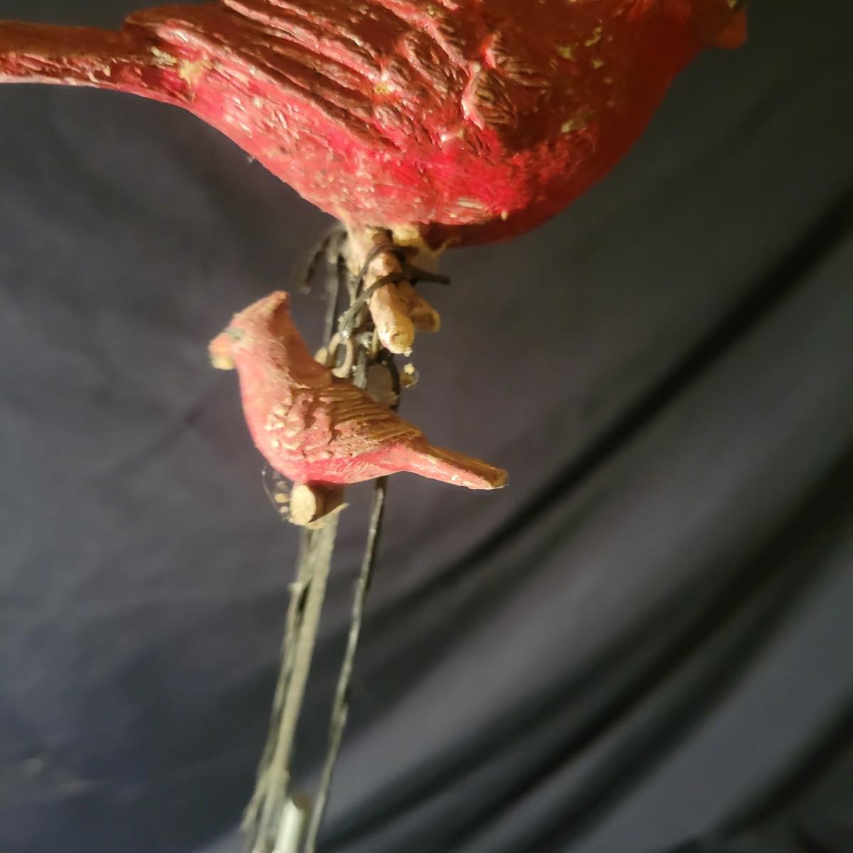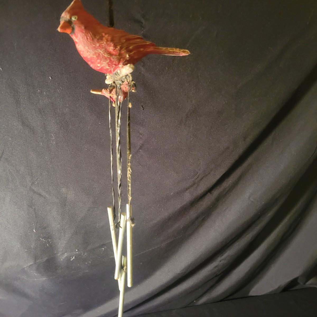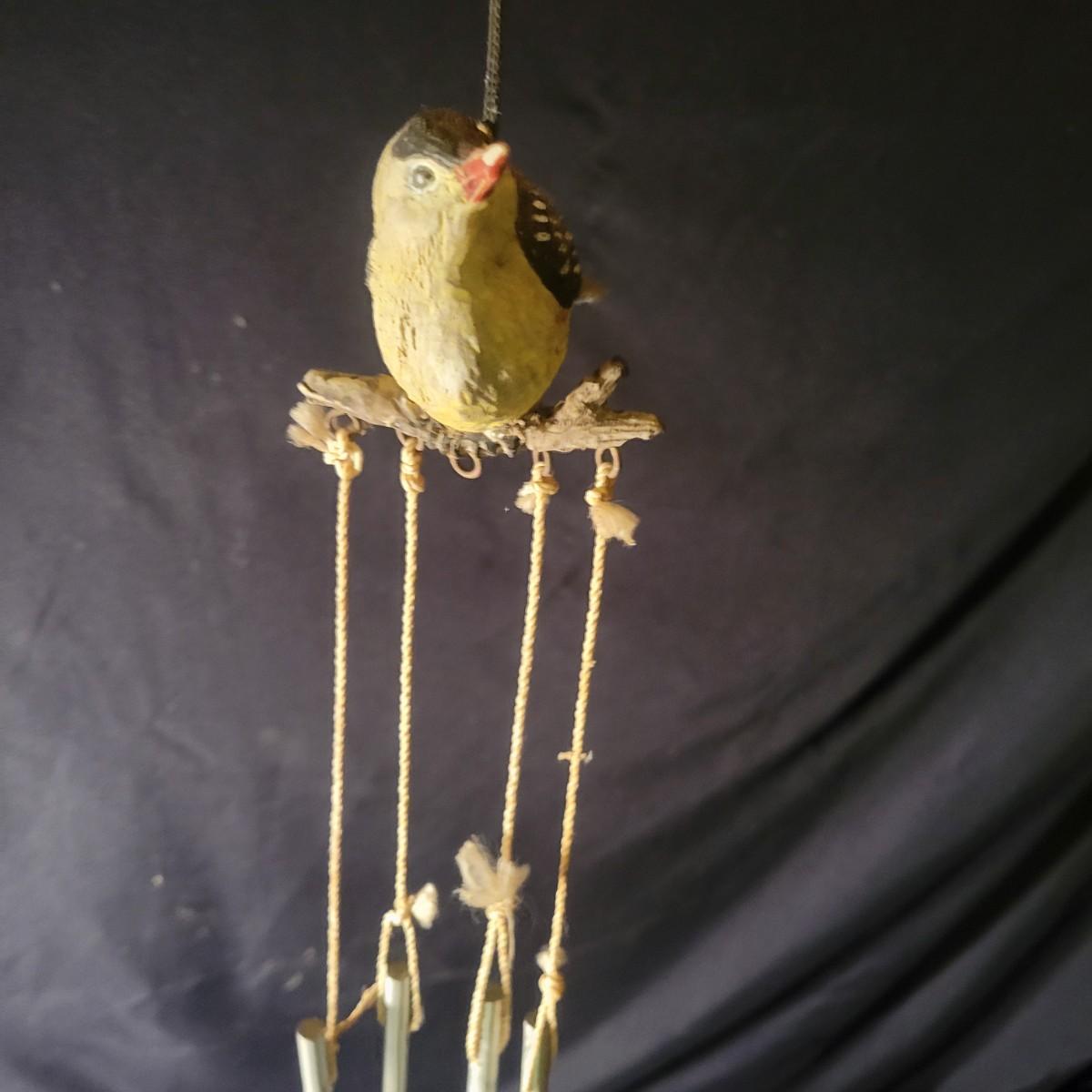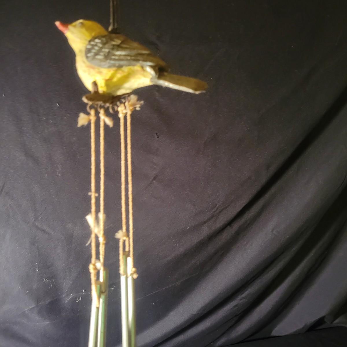 A pair of bird windchimes and a glass and metal bird feeder in fair condition. Bird feeder is missing a few decorative components, but still functions. Windchimes have resin cast birds and four chimes each. Feeder measures approximately 10" x 26" and must hang. Shipping available. Shipping can be costly please call UPS store at 828-252-6930 for quote