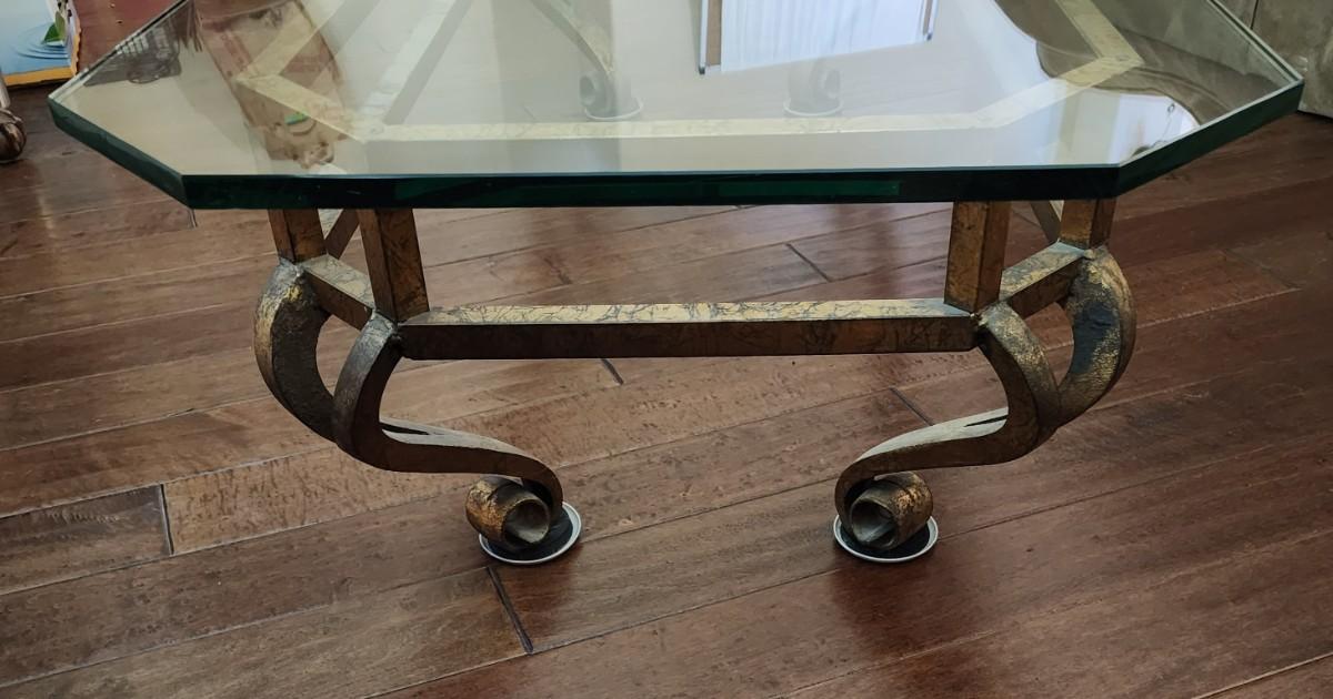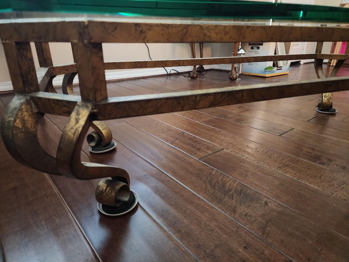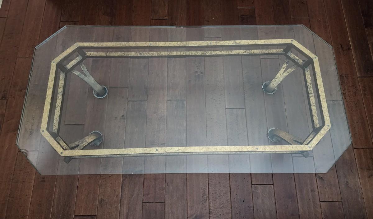Very thick 7/8" glass top. Metal base with clipped corners. Crackle gold finish. 60 long, 30 wide 15 tall.