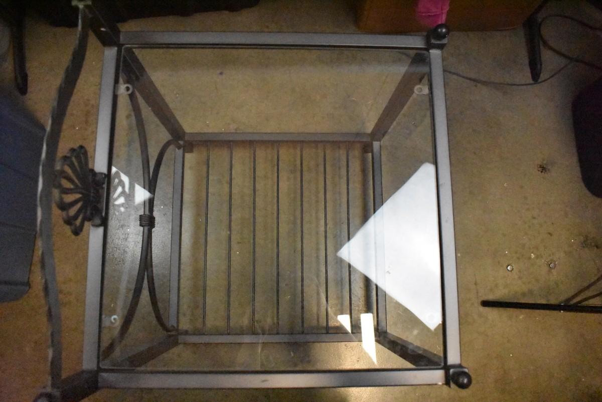 Glass and Metal Decorative End Table. Top is 22x23" and the height is 21".