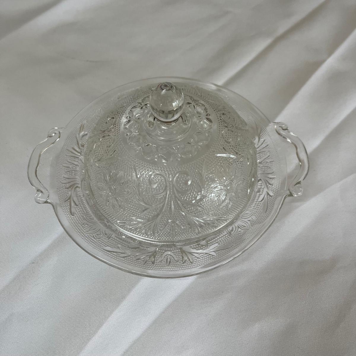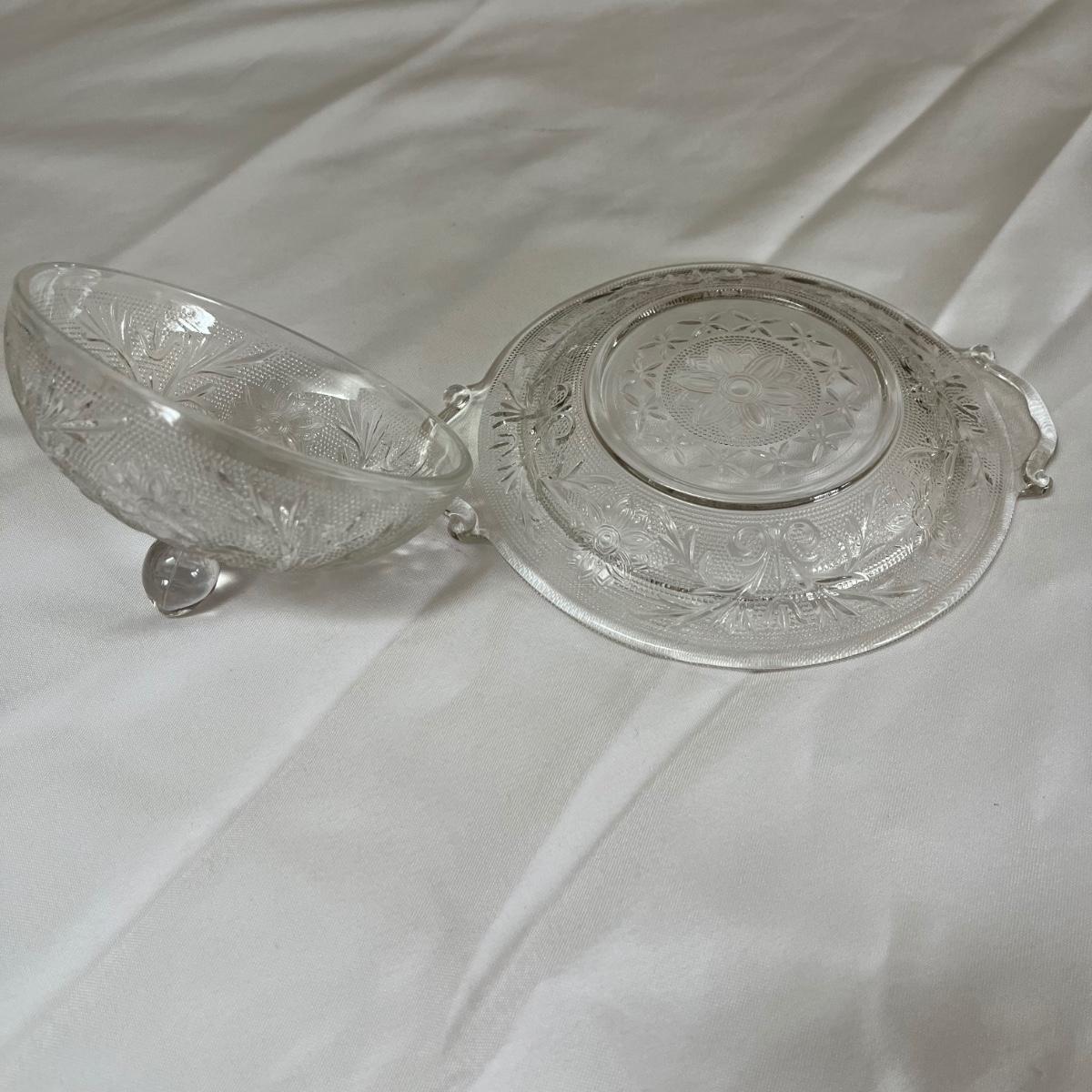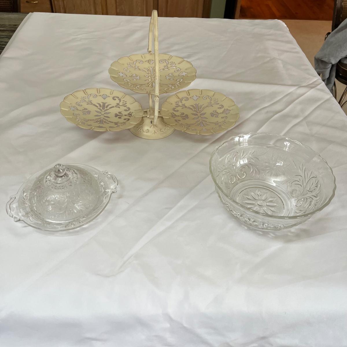 Three ornate serving pieces. A glass bowl measuring 8.25”D x 3.5”H, a glass lidded round butter dish and a folding metal stand with attached handle.