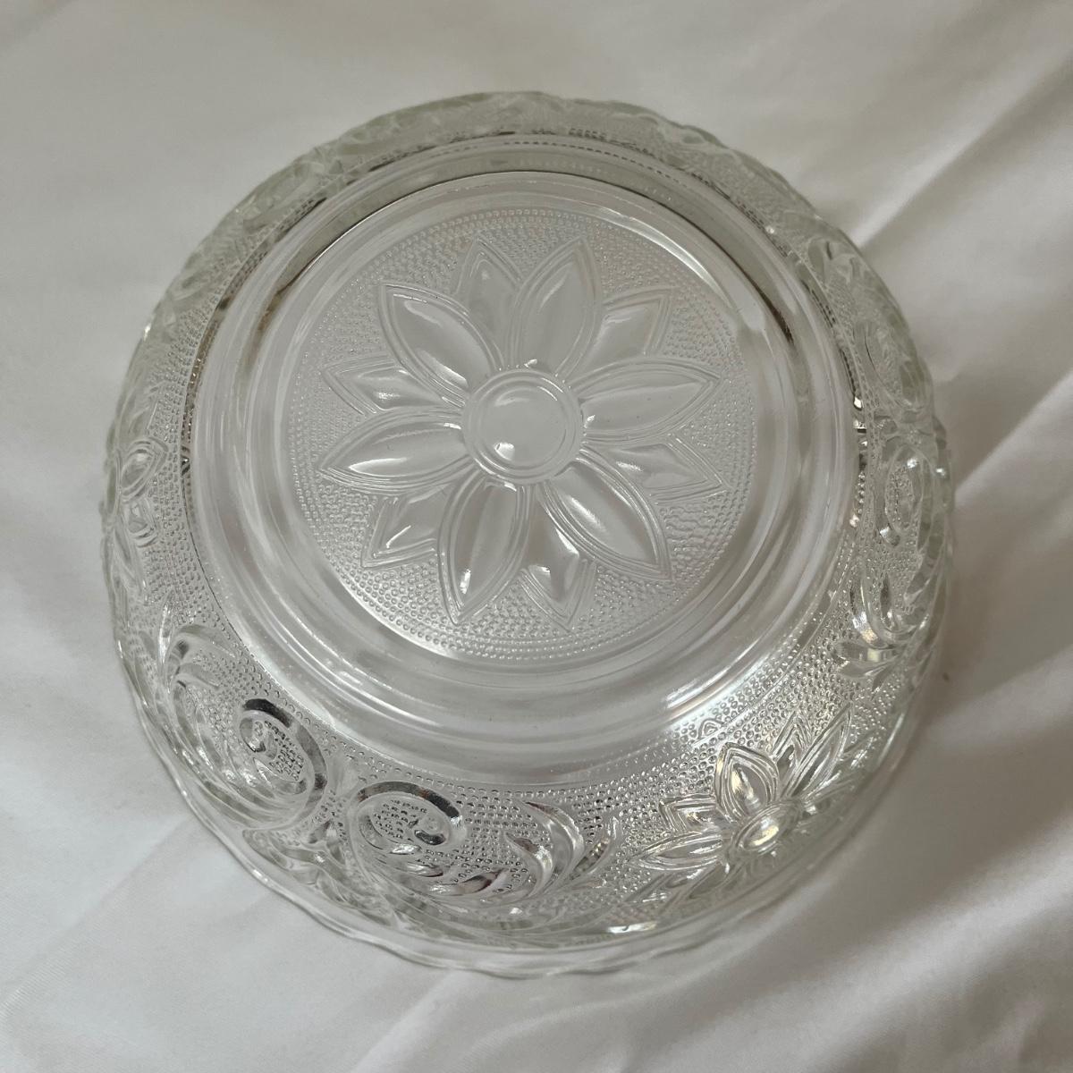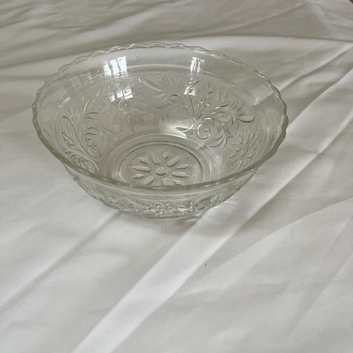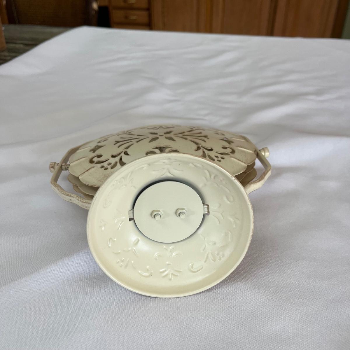 Three ornate serving pieces. A glass bowl measuring 8.25”D x 3.5”H, a glass lidded round butter dish and a folding metal stand with attached handle.