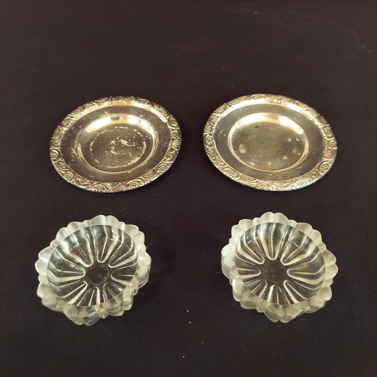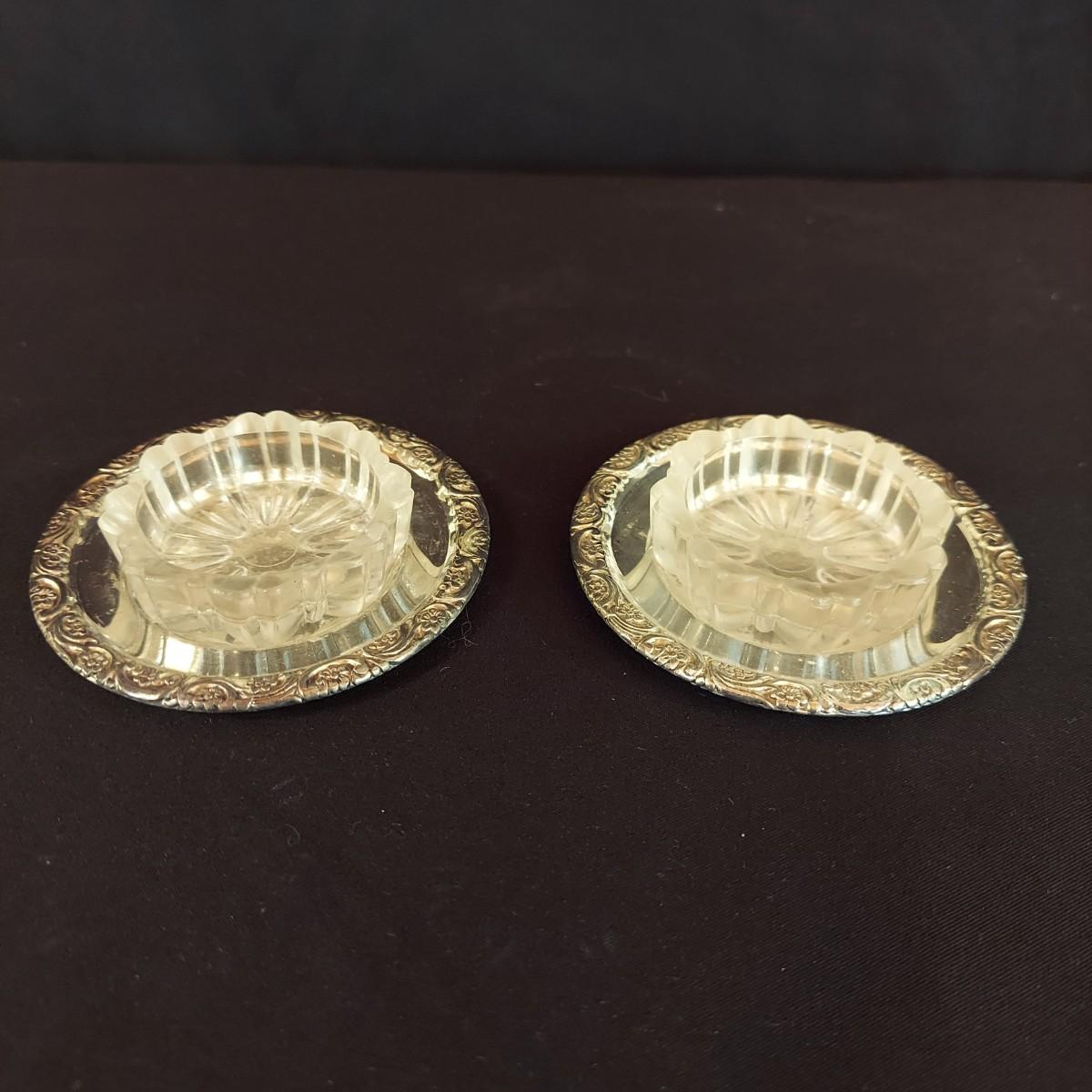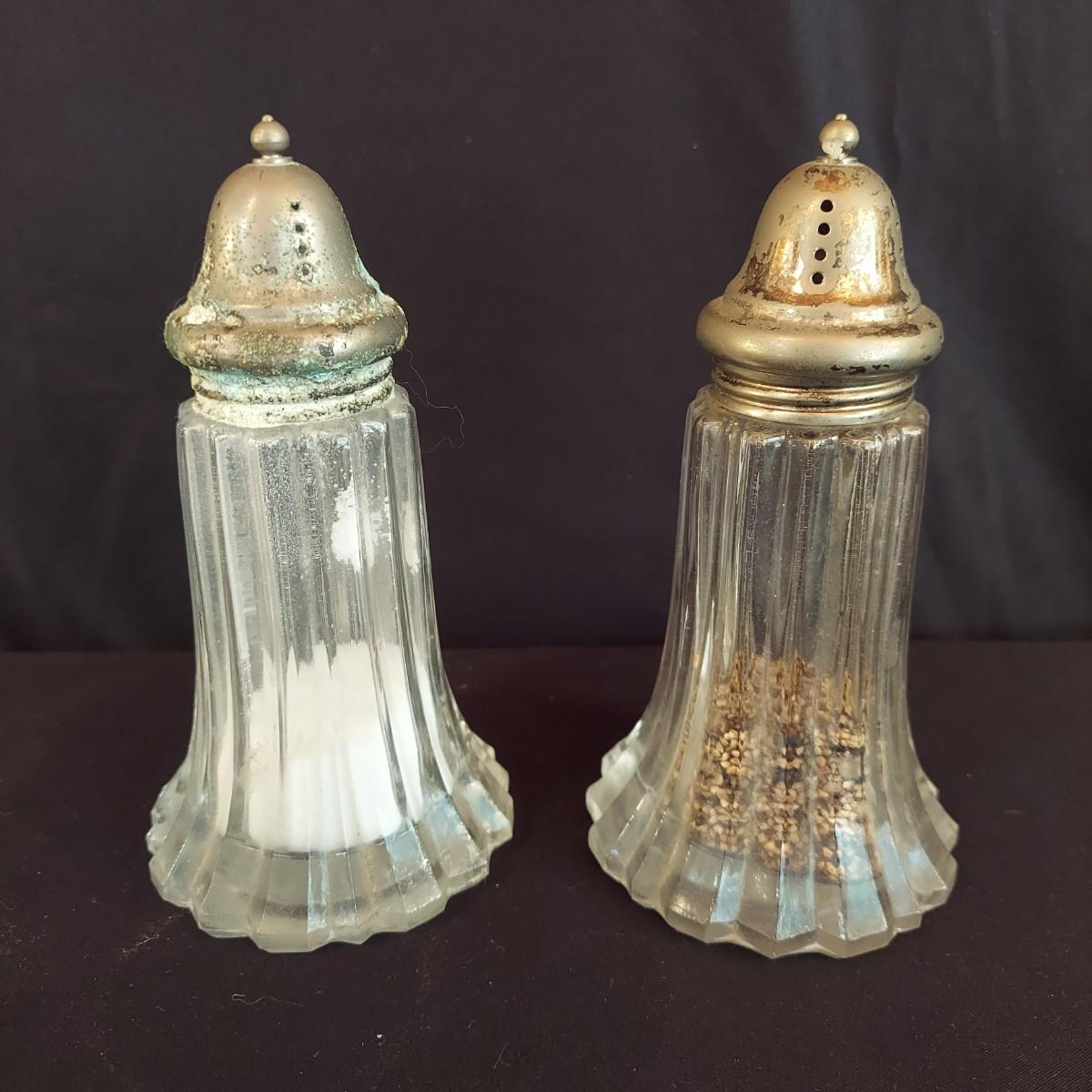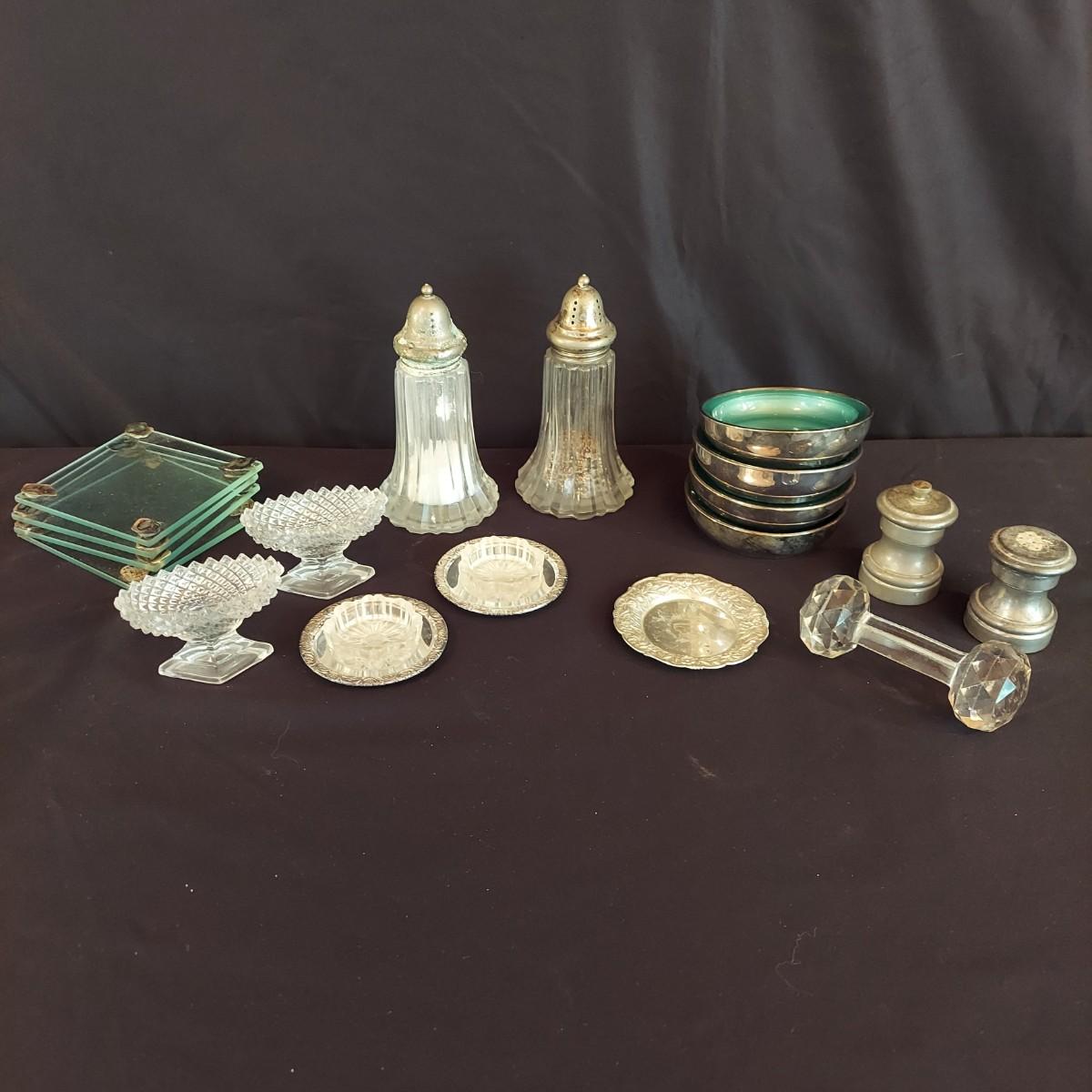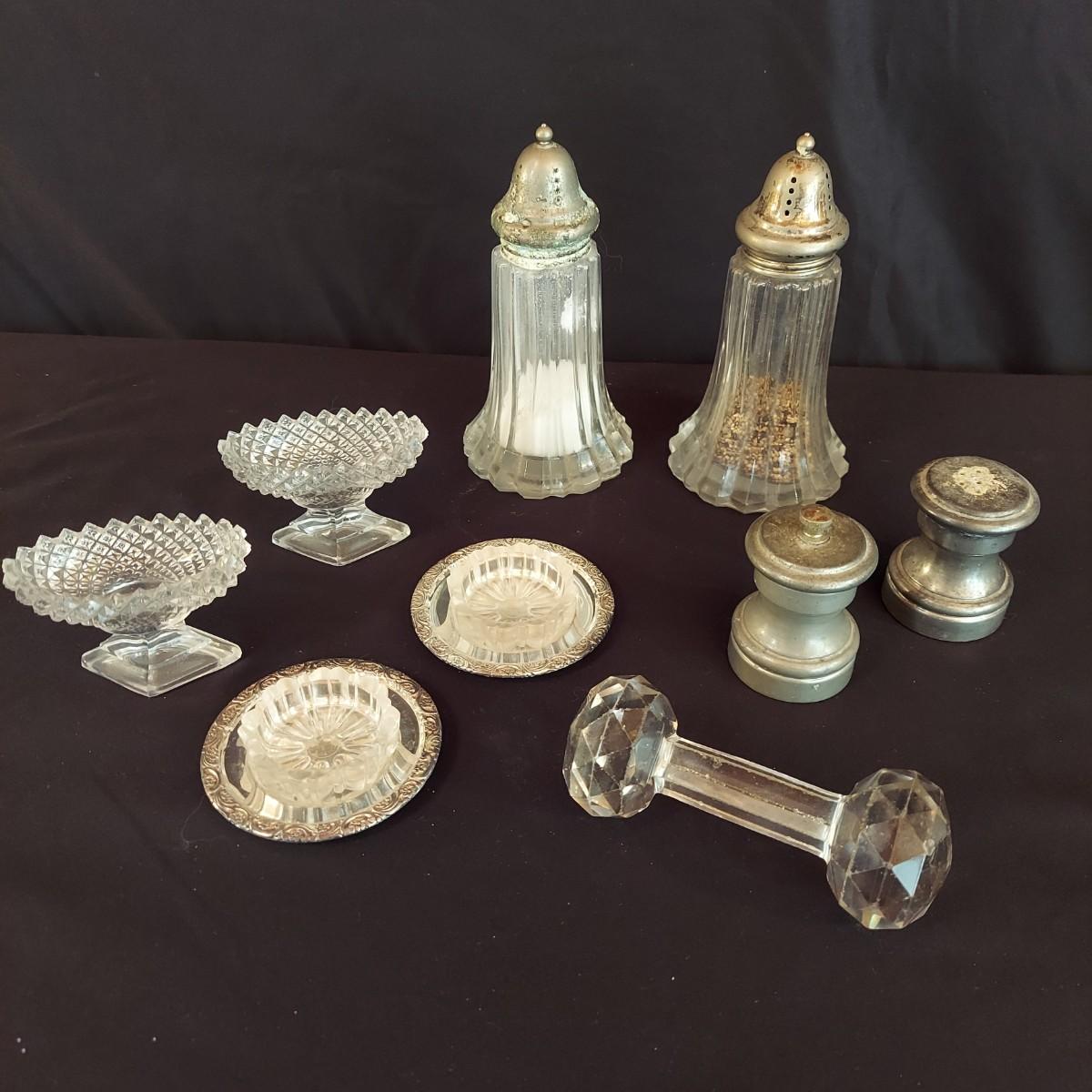 Lot includes several pieces of tabletop serveware. There are two sets of salt and pepper shakers, two glass salt cellars, two metal and glass salt cellars, a glass knife rest and four silver and glass bowls. The large salt shakers are 3"D x 6"H. There is one small silver plate stamped sterling. Please see photos for details. Shipping available