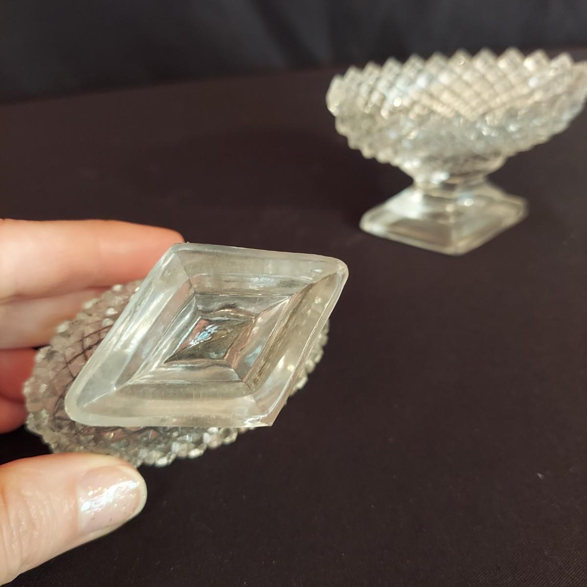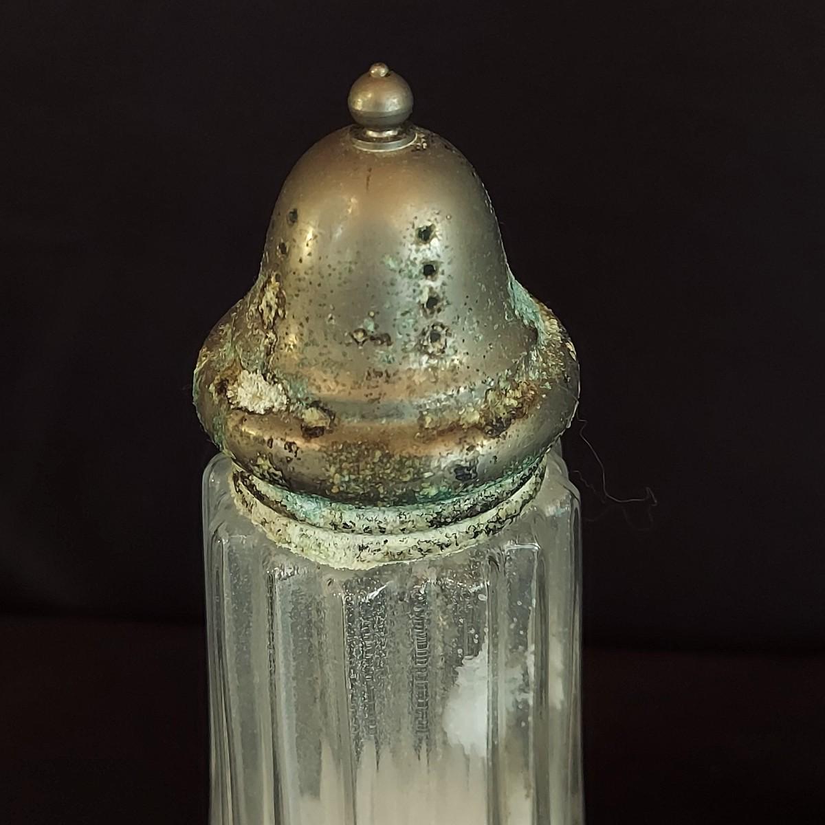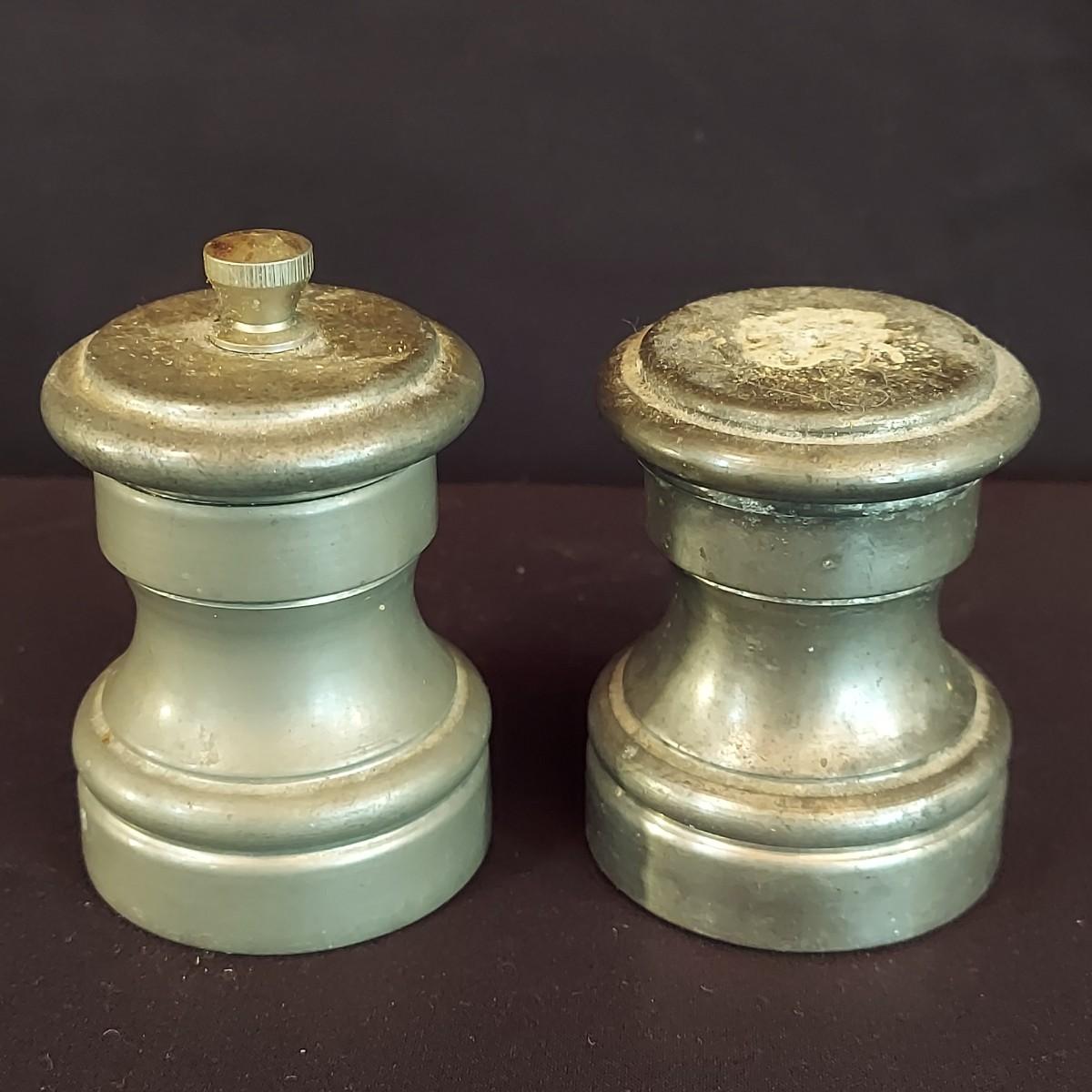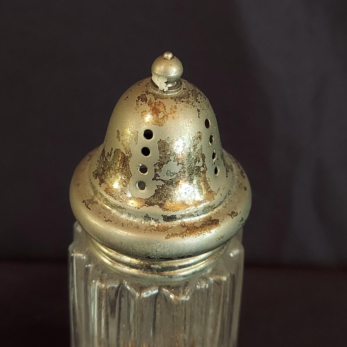 Lot includes several pieces of tabletop serveware. There are two sets of salt and pepper shakers, two glass salt cellars, two metal and glass salt cellars, a glass knife rest and four silver and glass bowls. The large salt shakers are 3"D x 6"H. There is one small silver plate stamped sterling. Please see photos for details. Shipping available