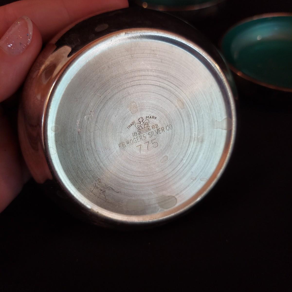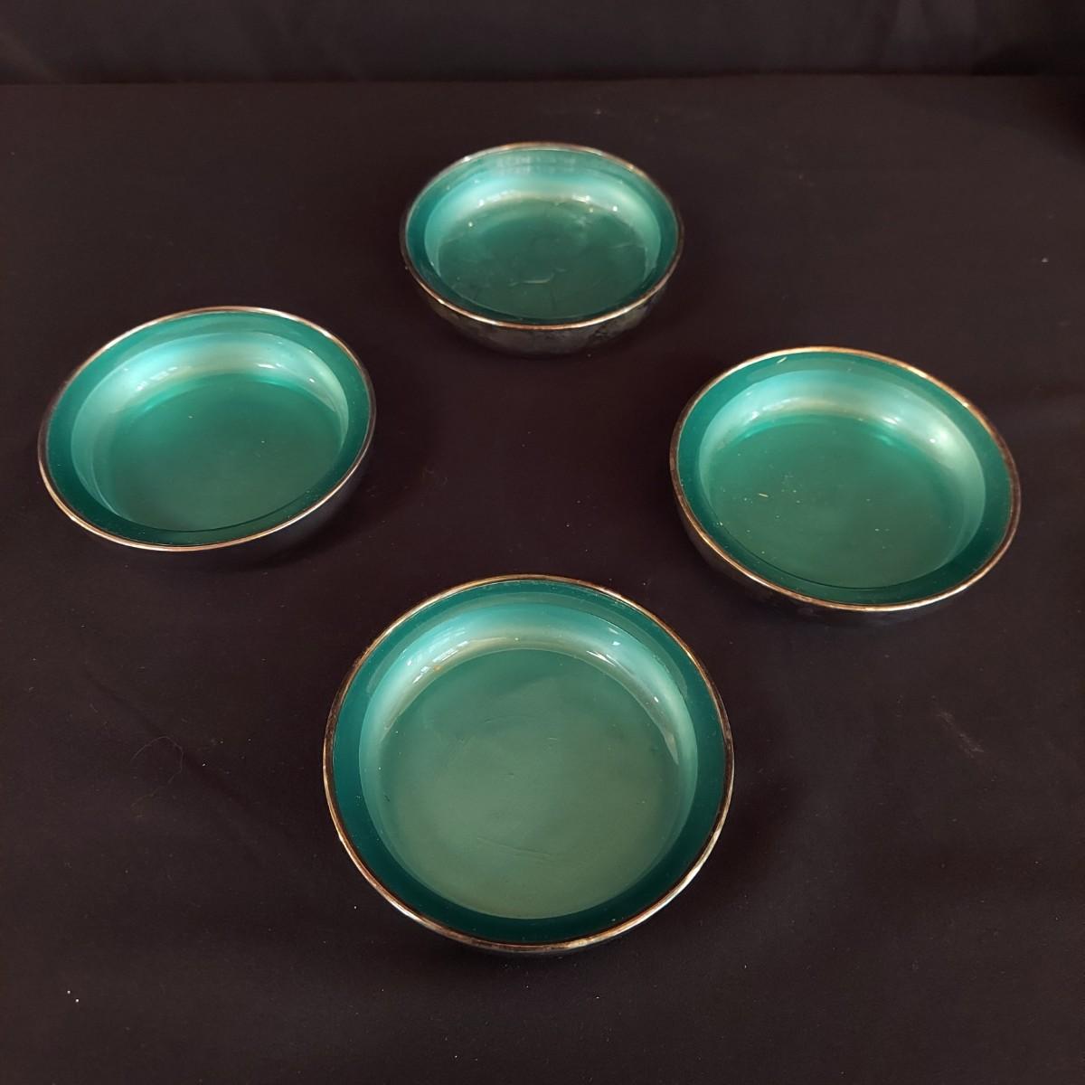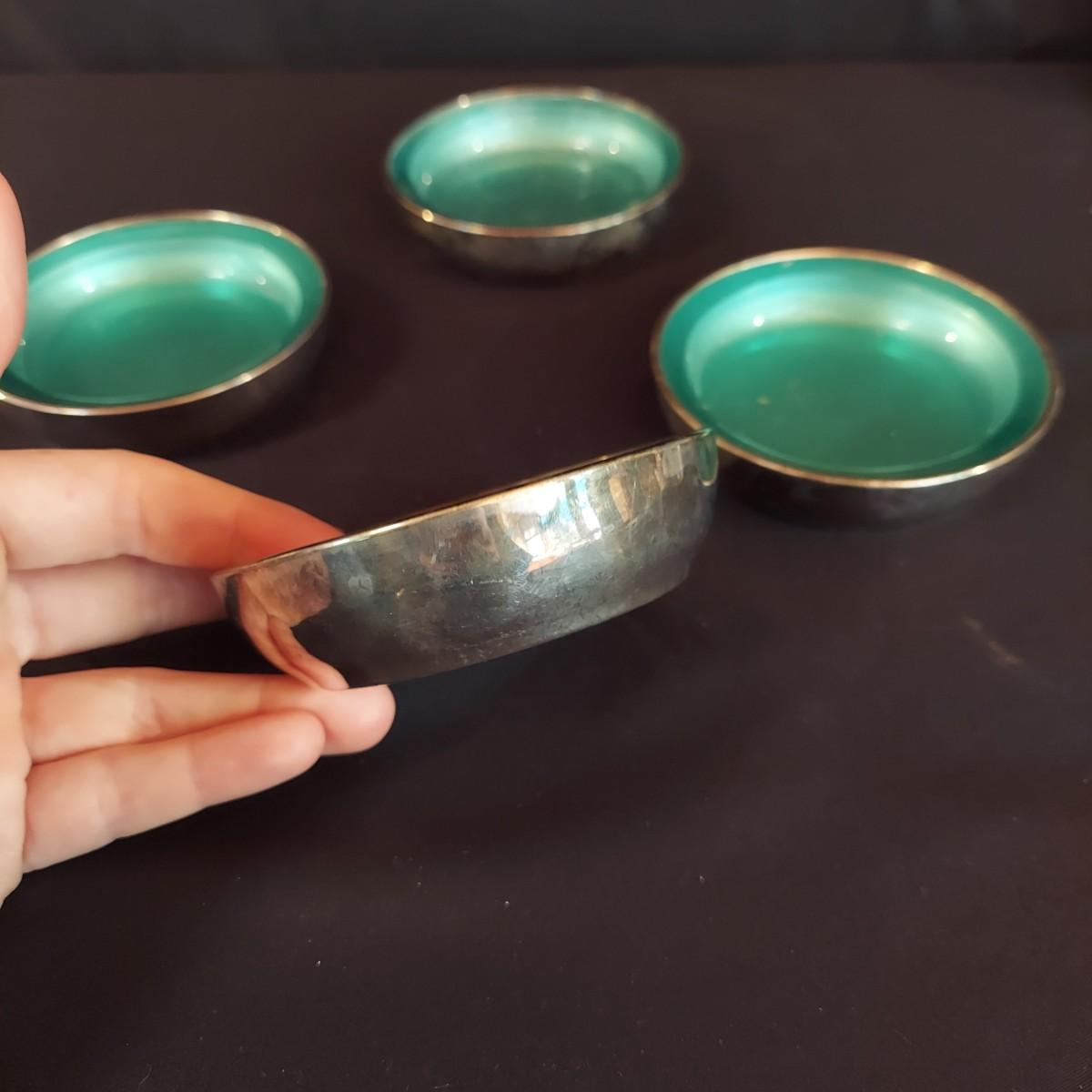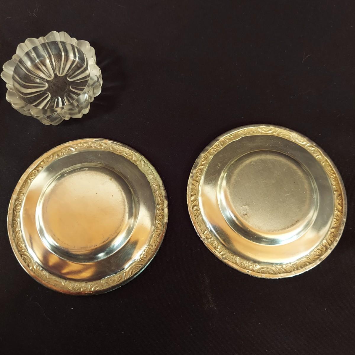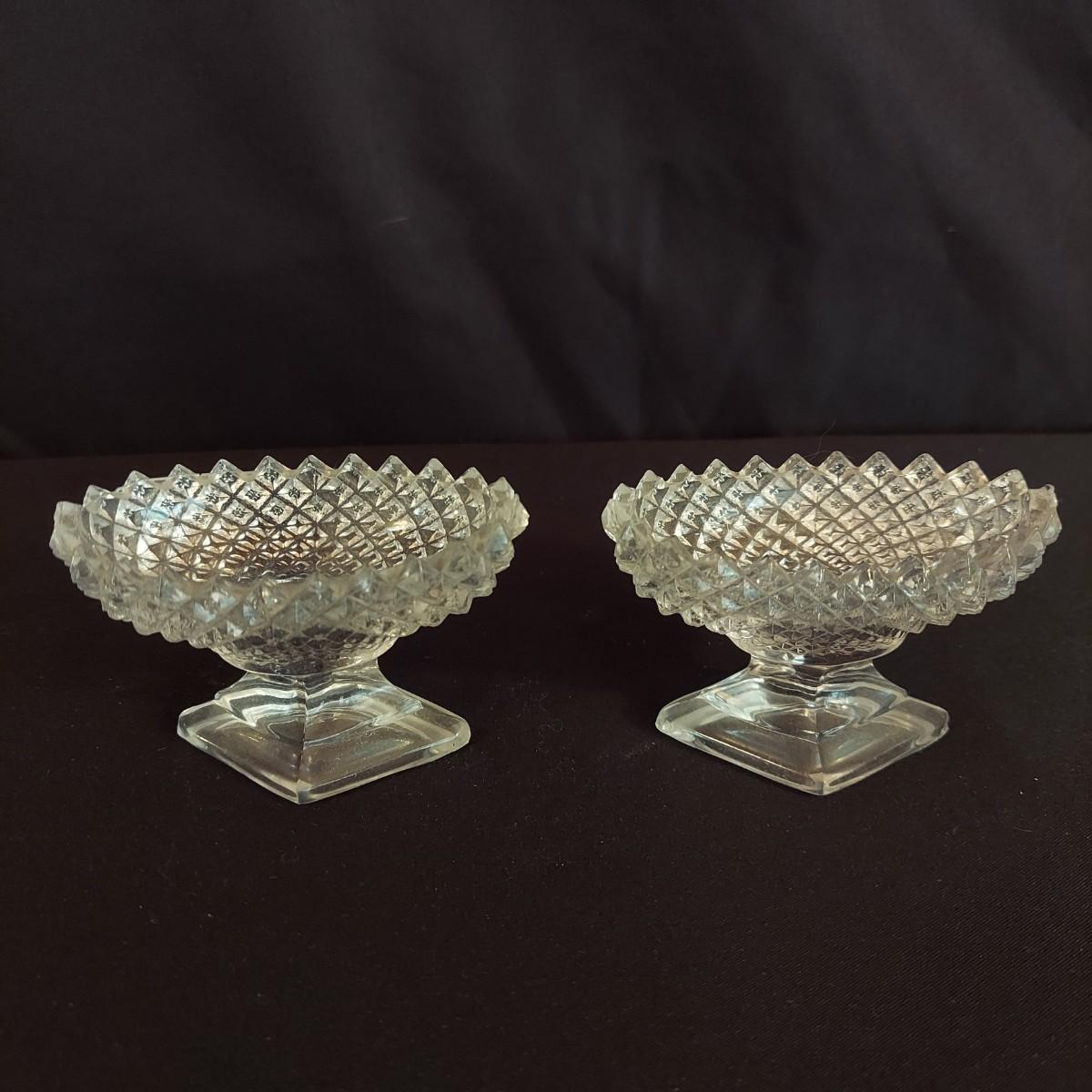 Lot includes several pieces of tabletop serveware. There are two sets of salt and pepper shakers, two glass salt cellars, two metal and glass salt cellars, a glass knife rest and four silver and glass bowls. The large salt shakers are 3"D x 6"H. There is one small silver plate stamped sterling. Please see photos for details. Shipping available