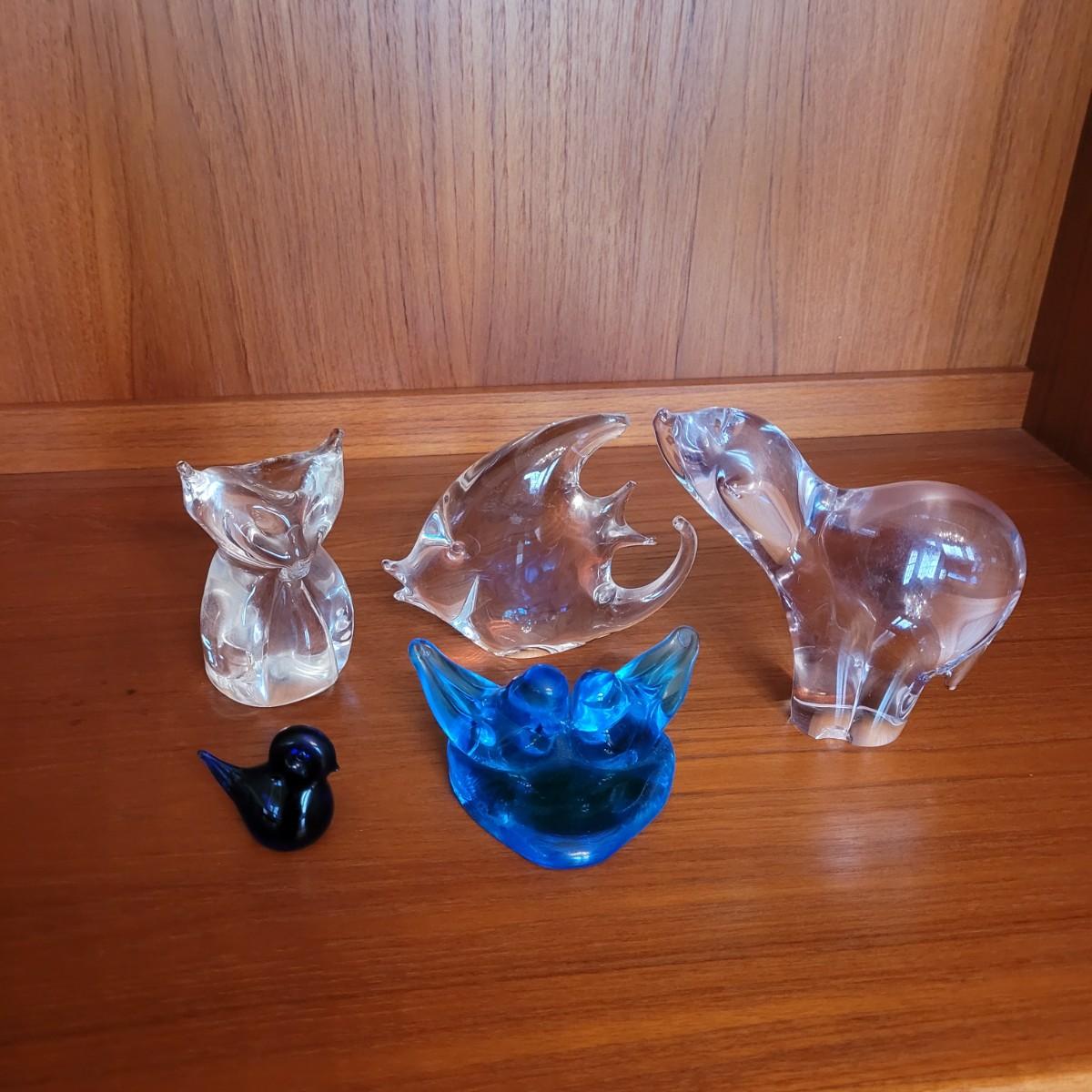 This collection of glass animal figurines includes a tropical fish, songbirds (single bird signed by “Bosse”), and what appears to be a fox and a pig. Fish fin is chipped. Fish measures 6” x 5”. Please see photos for details. Shipping available.