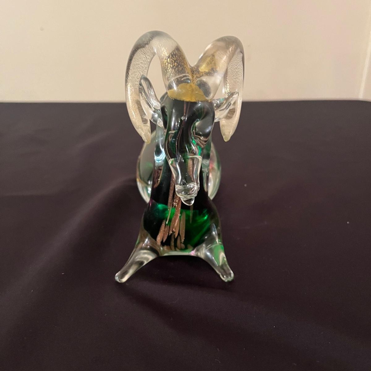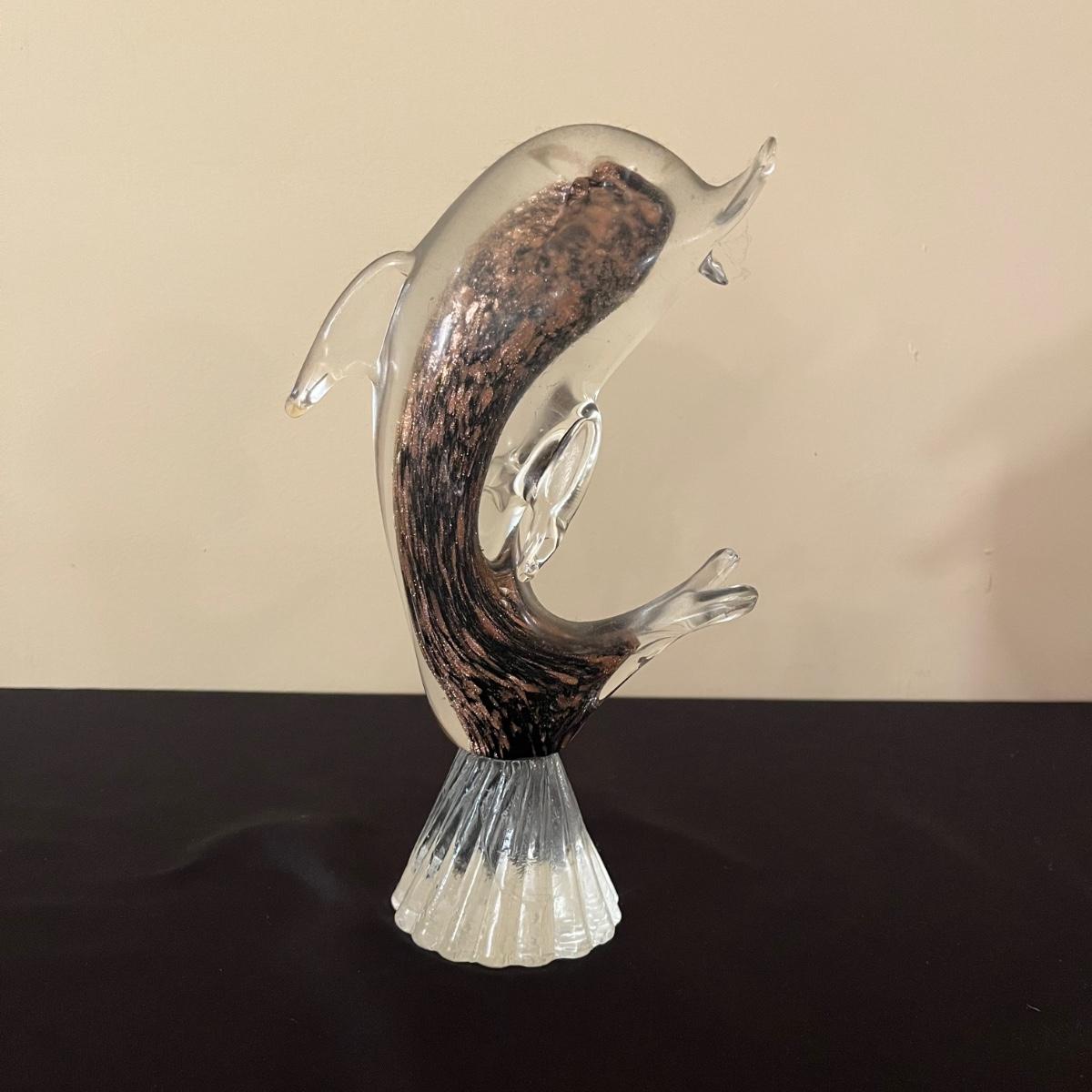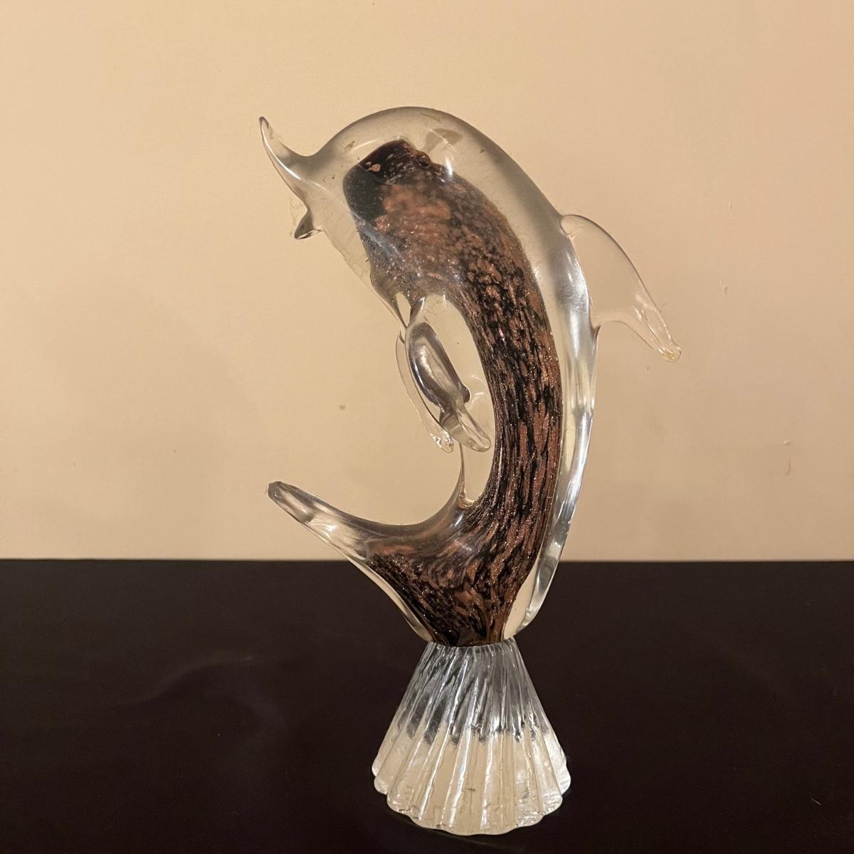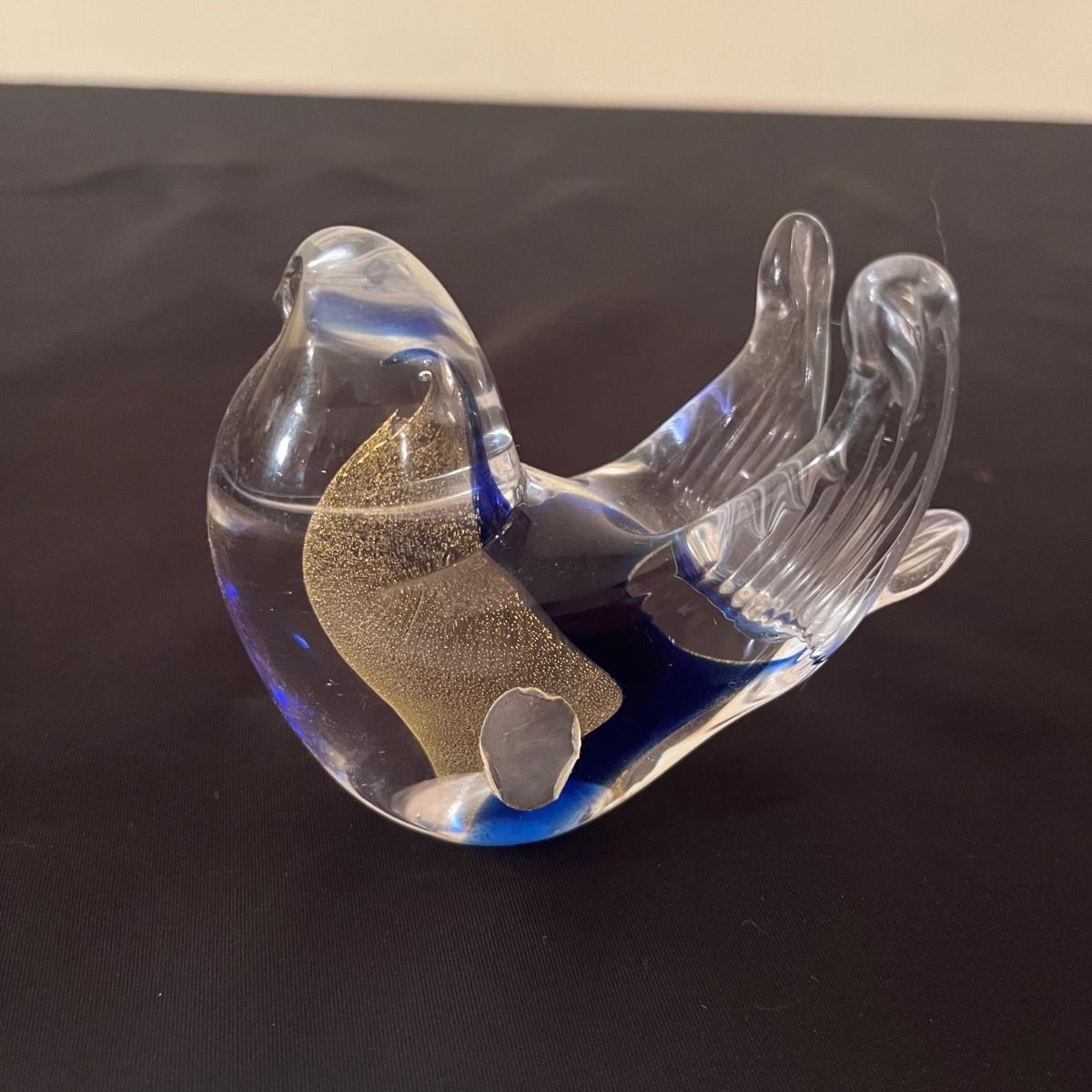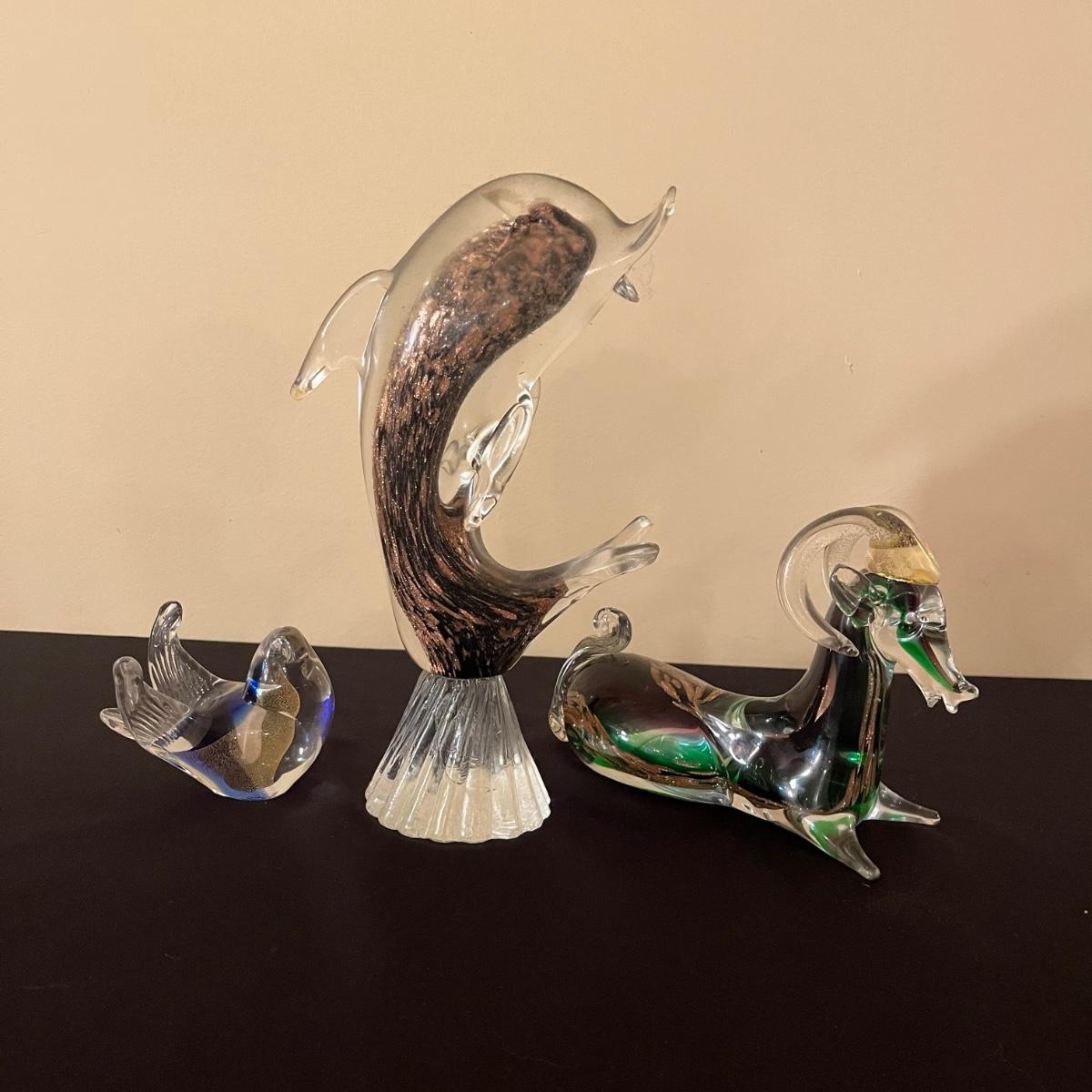 Lot includes a glass dolphin, glass goat and a glass bird. Animals have unique coloring inside. Dolphin measures 3” x 6.5” x 10”.