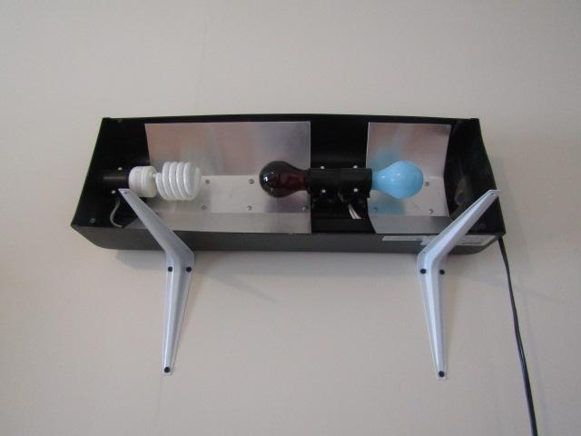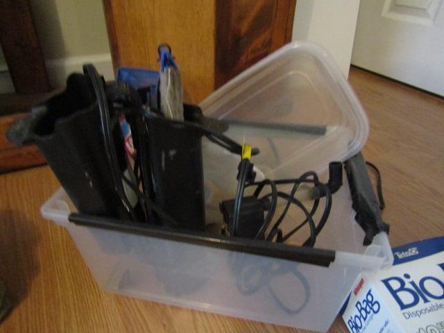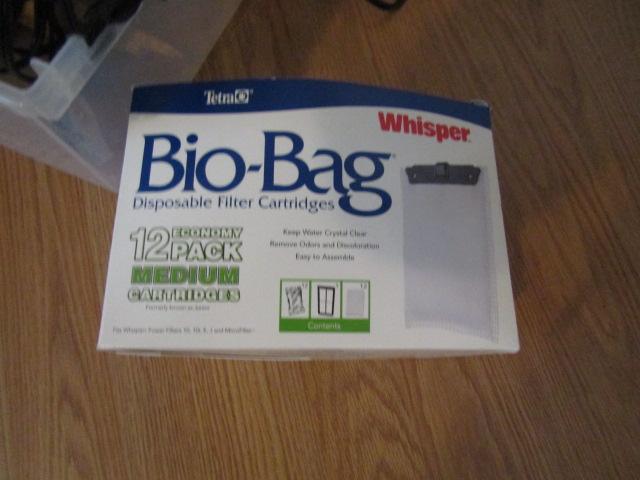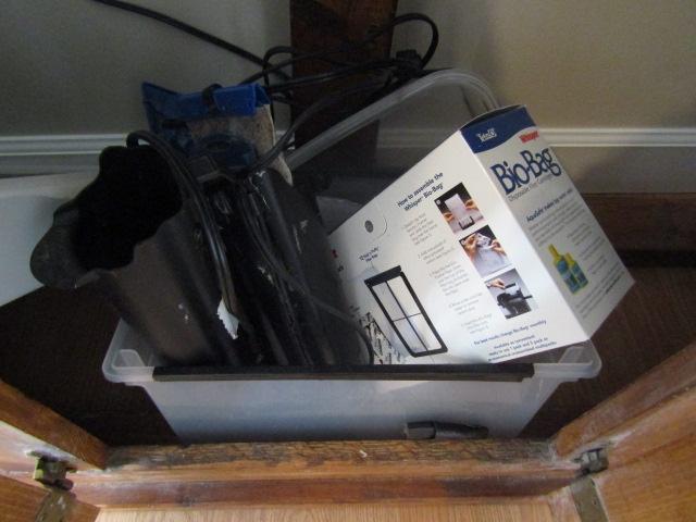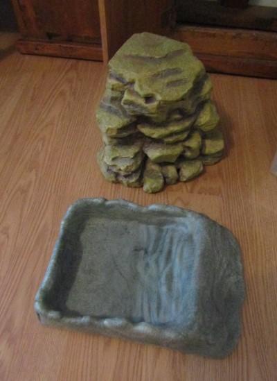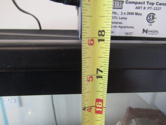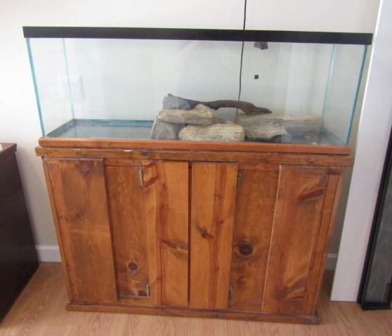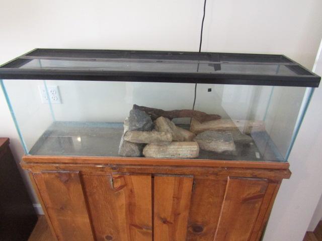 Glass Aquarium/Terrarium with Wood Stand/Storage Cabinet 48" x 12" x 18". Comes with metal wire cover, Exo Terra Compact Top Canopy for heat/light source, and rock ramps and basking platforms. Not sure if it holds water without leakage.
