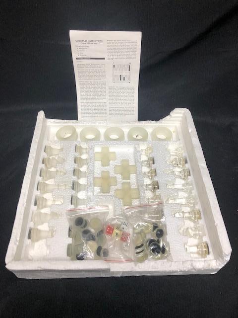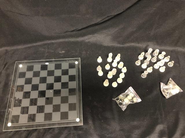 Backgammon & Chess Set. Glass game boards. Backgammon pieces are still in the bag. Chess pieces are missing a pawn and a queen from opposite sides.