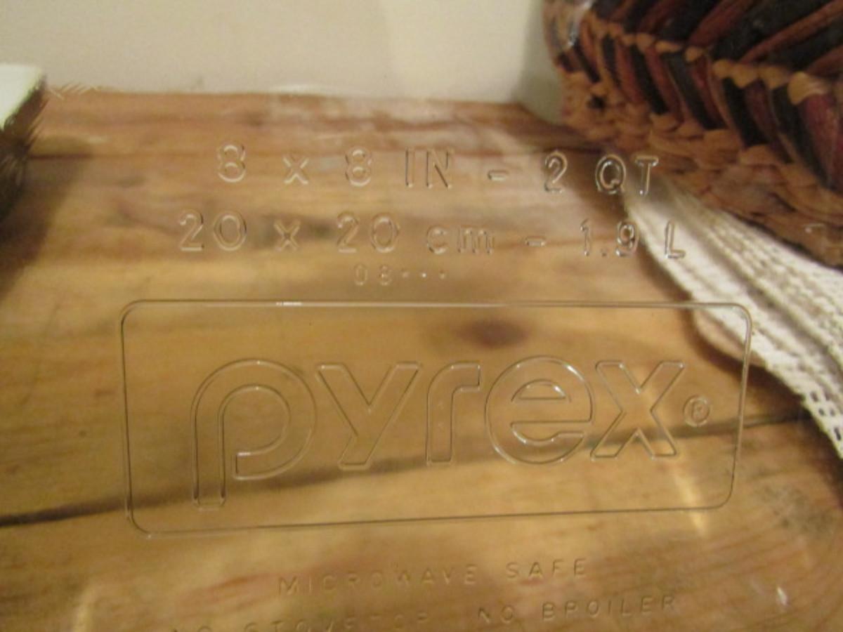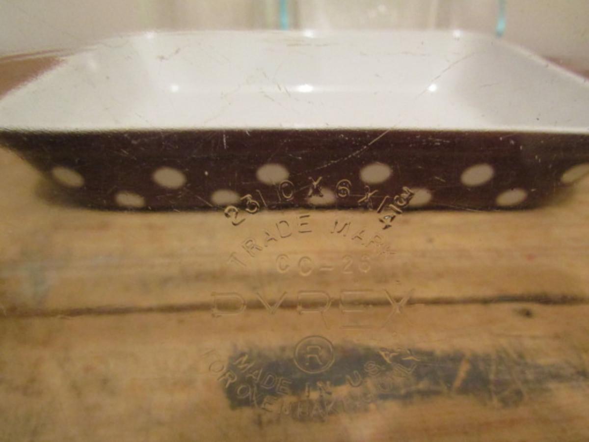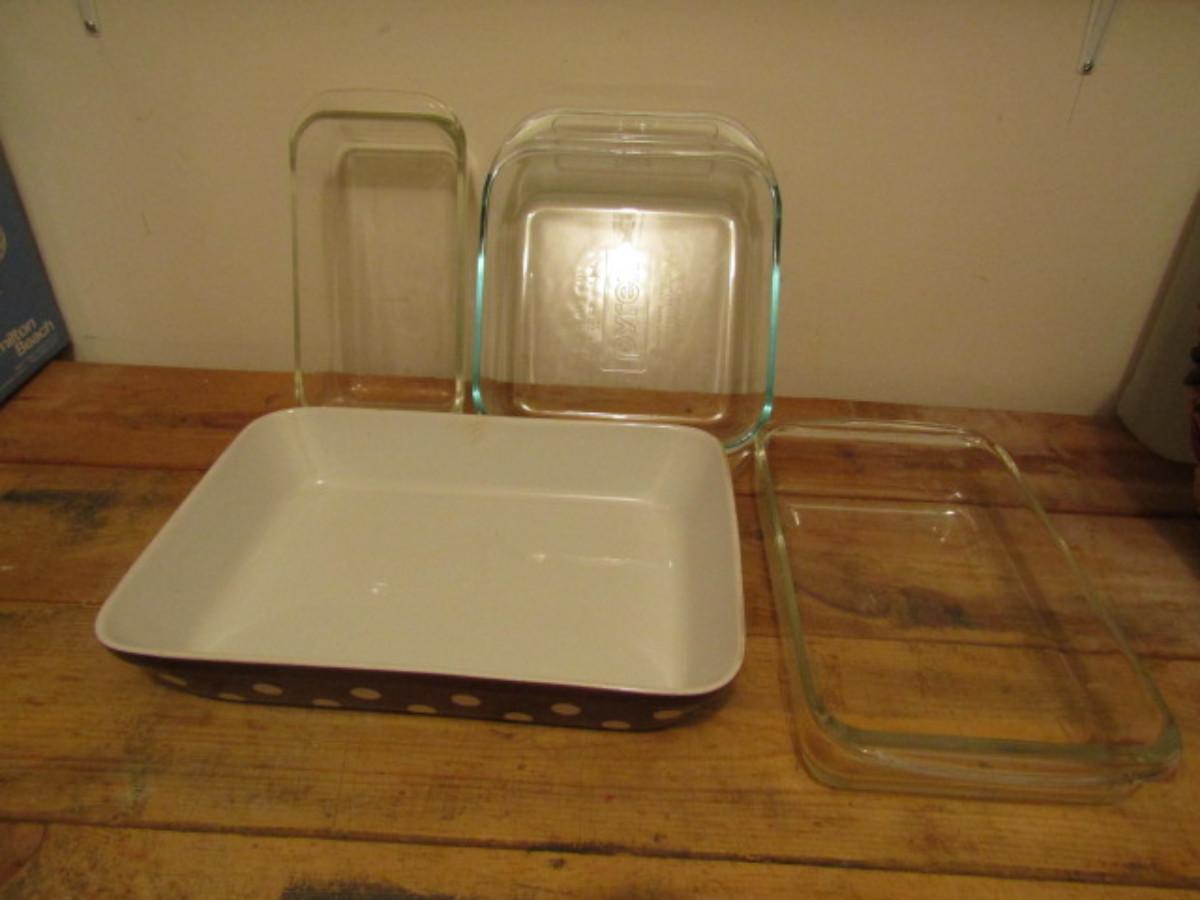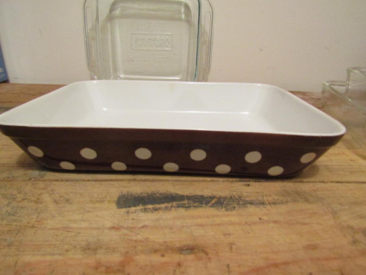 Glass Baking Dishes. Pyrex 1 1/2 Quart and 2 Quart and Bread Pan. Polka dot 9" x 12 1/2" dish.