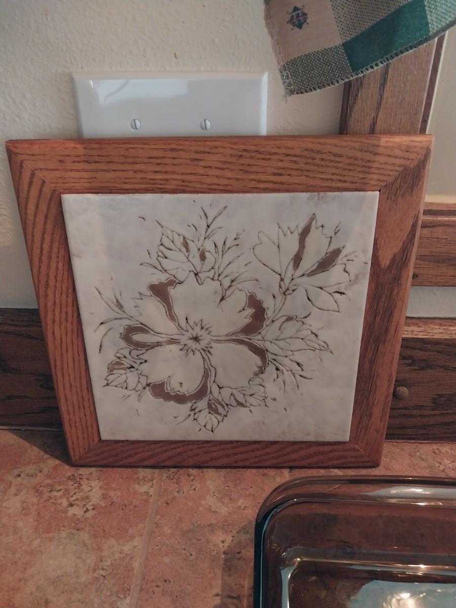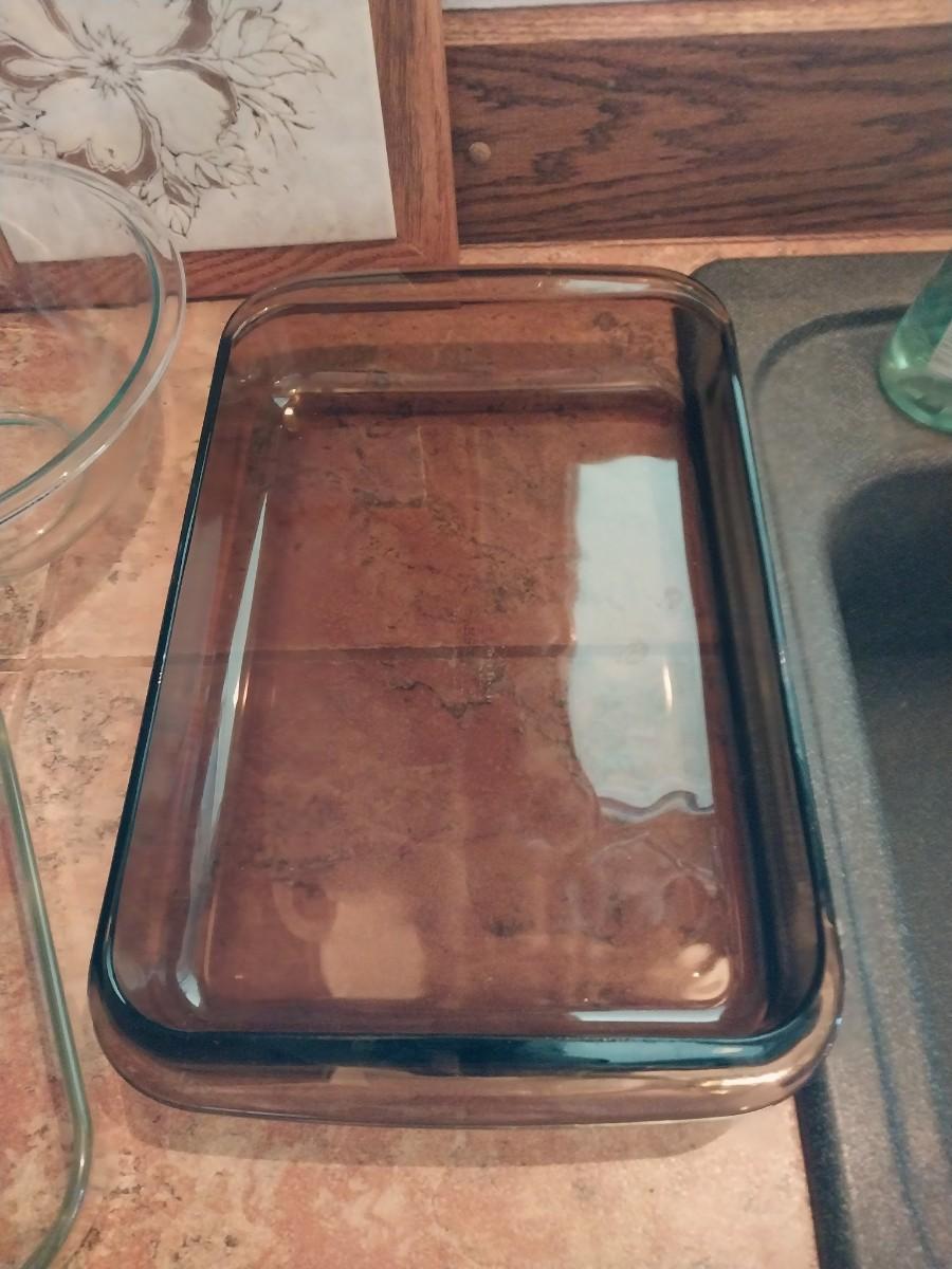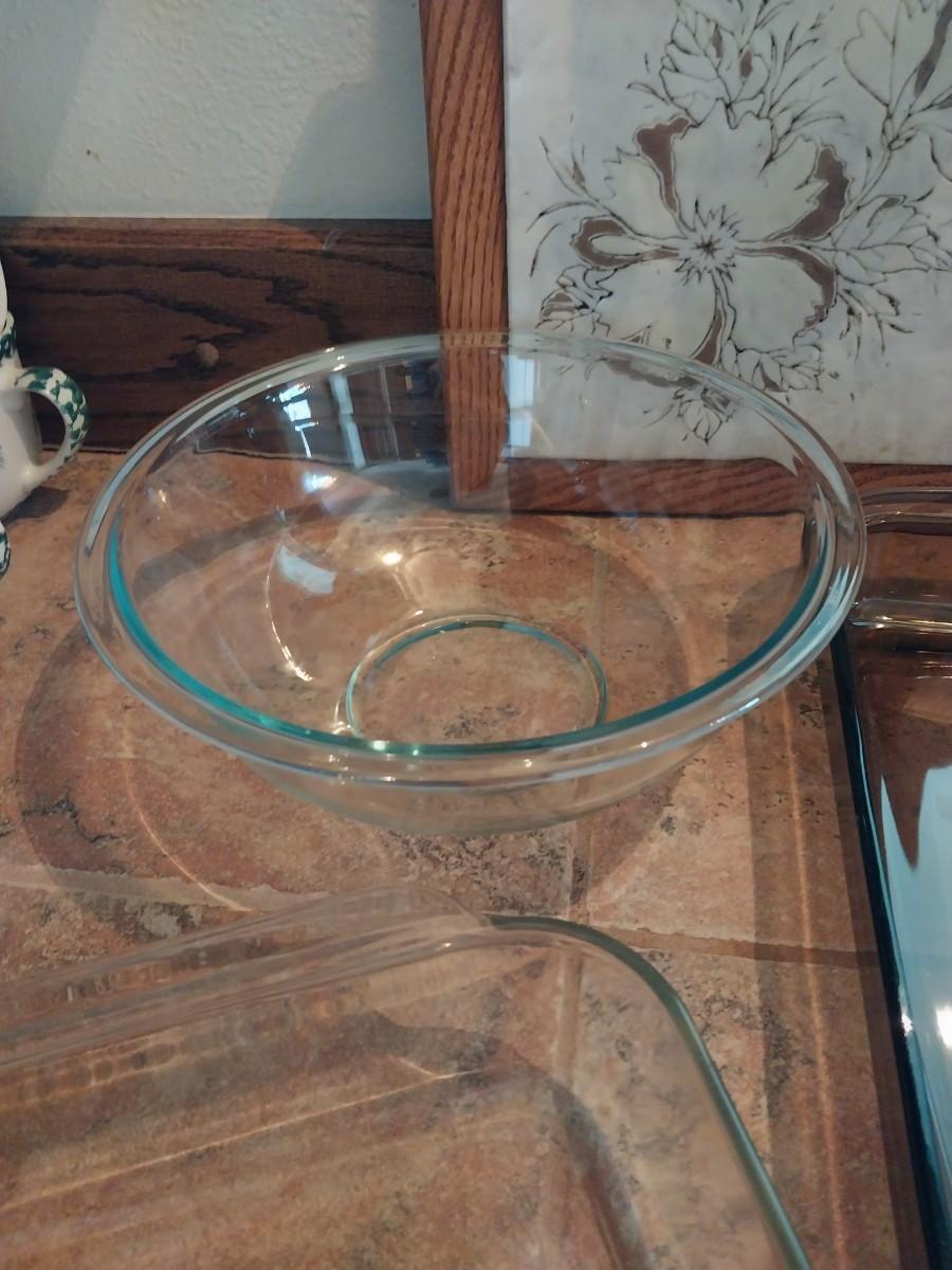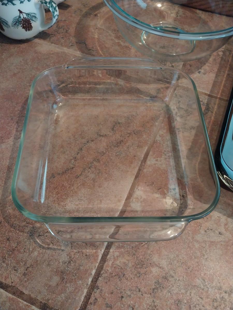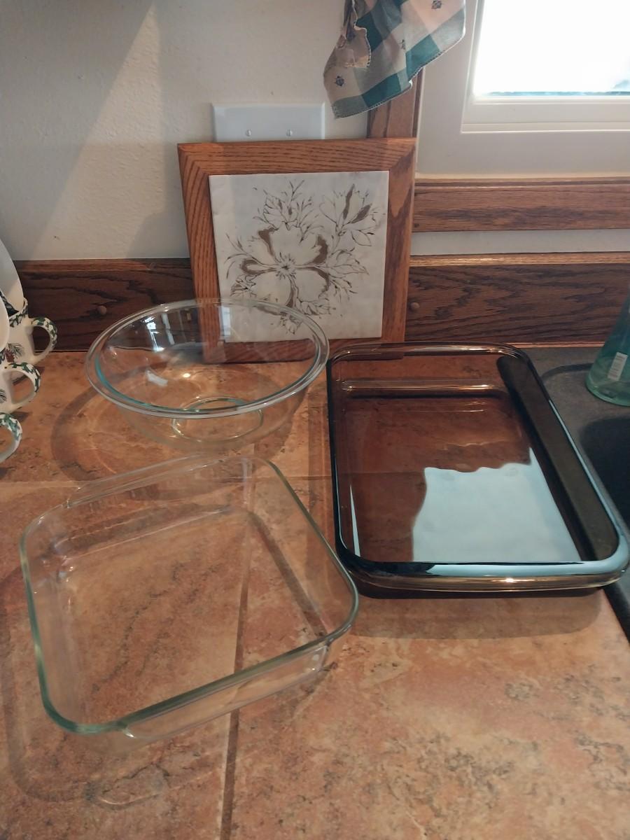 GLASS BAKING DISHES AND A TILE AND WOOD HOT PLATE