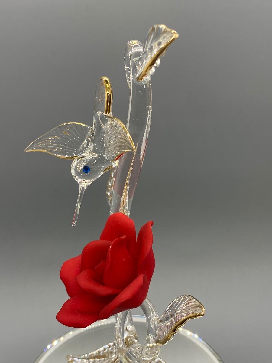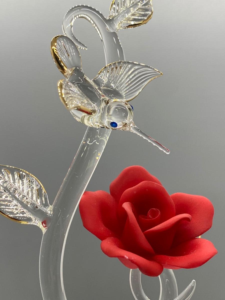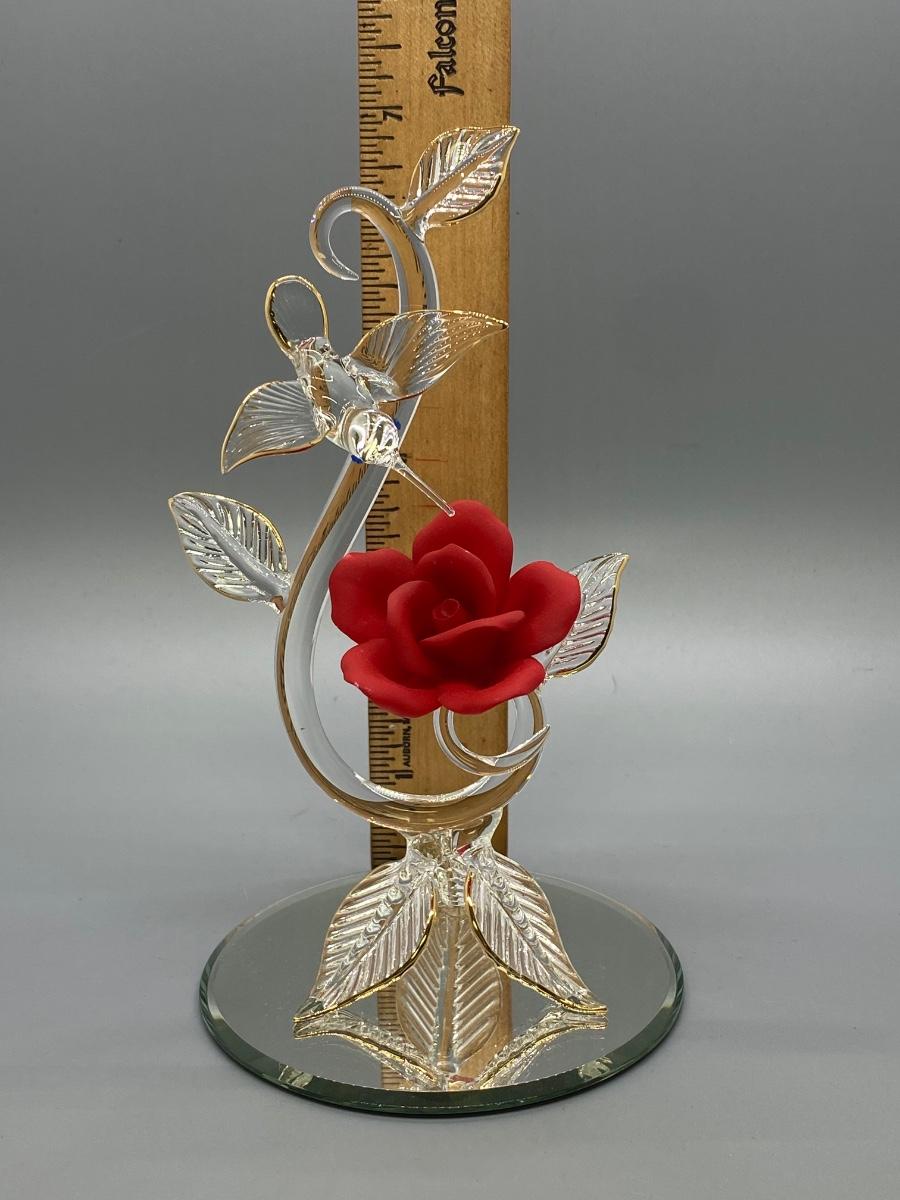 Glass Barn Blown Glass Hummingbird with Red Rose Figurine