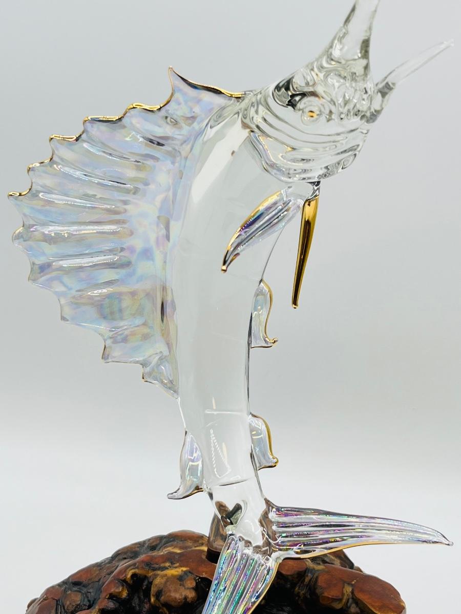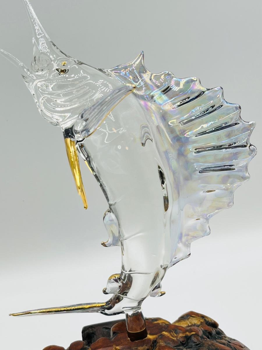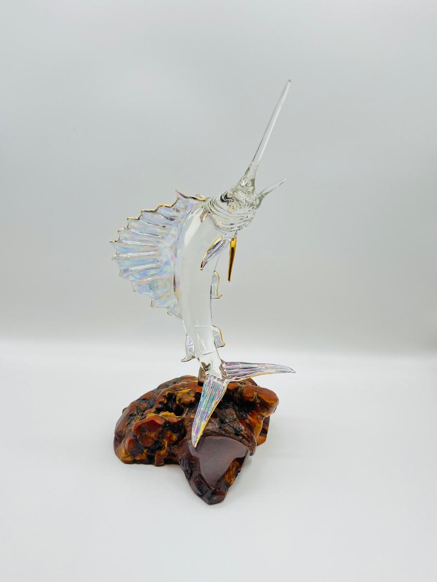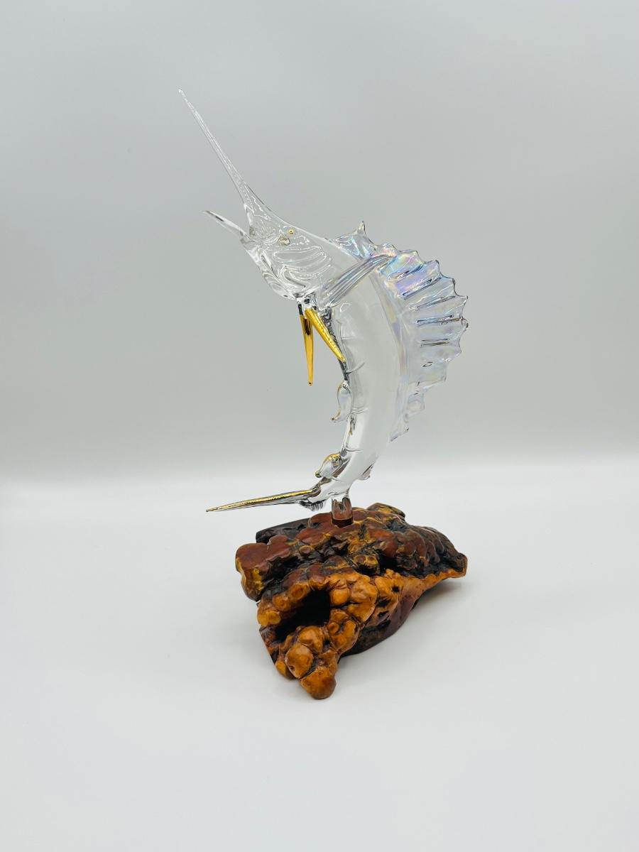 GLASS BARON ~ Sailfish/Marlin Figurine With Gold Accents On A Manzanita Root
