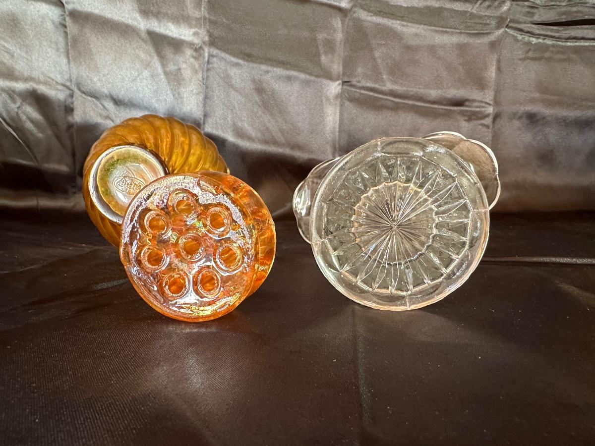 GLASS BASKET, AMBER VASE AND FLOWER FROG