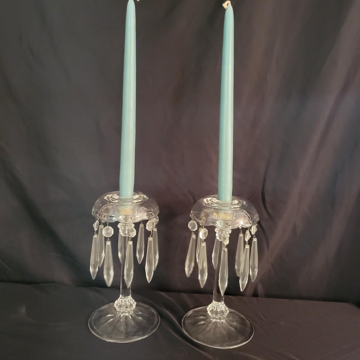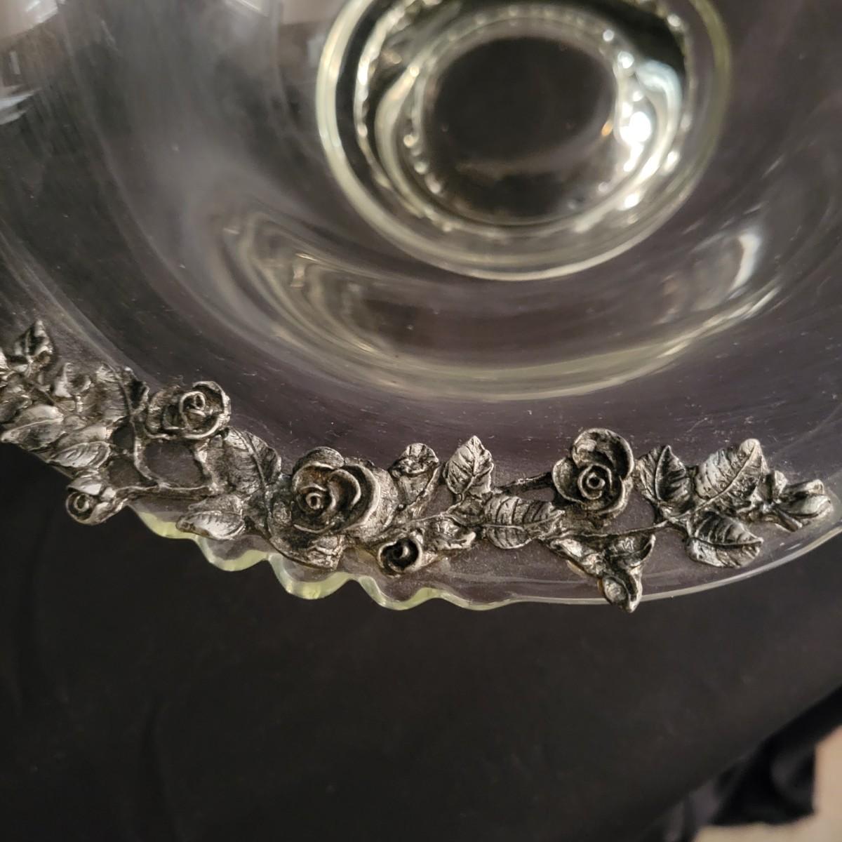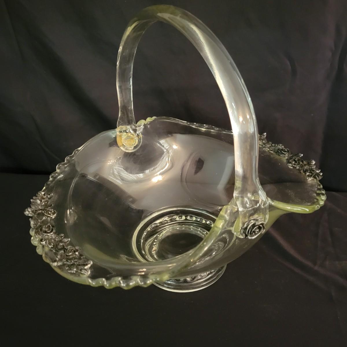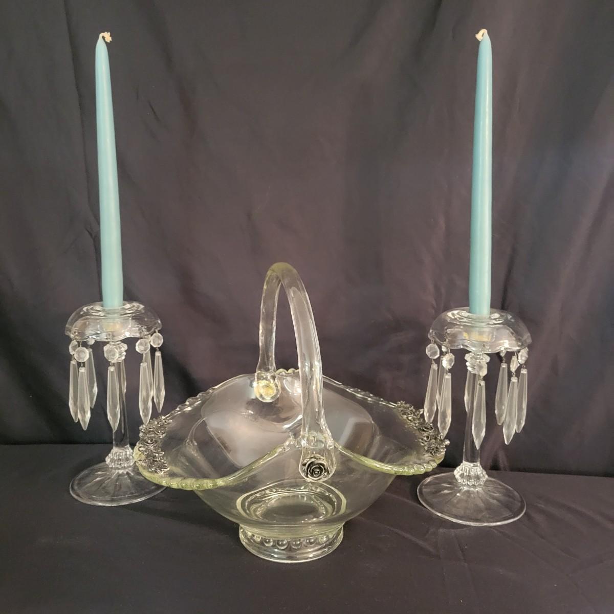 A glass basket and candleholders free of scratches or chips. The candleholders have multiple crystal like pieces hanging from them. The glass basket has multiple decorative rose patterns that appear to be pewter. Basket measures approximately 12" x 9" x 10"H. Local pickup only