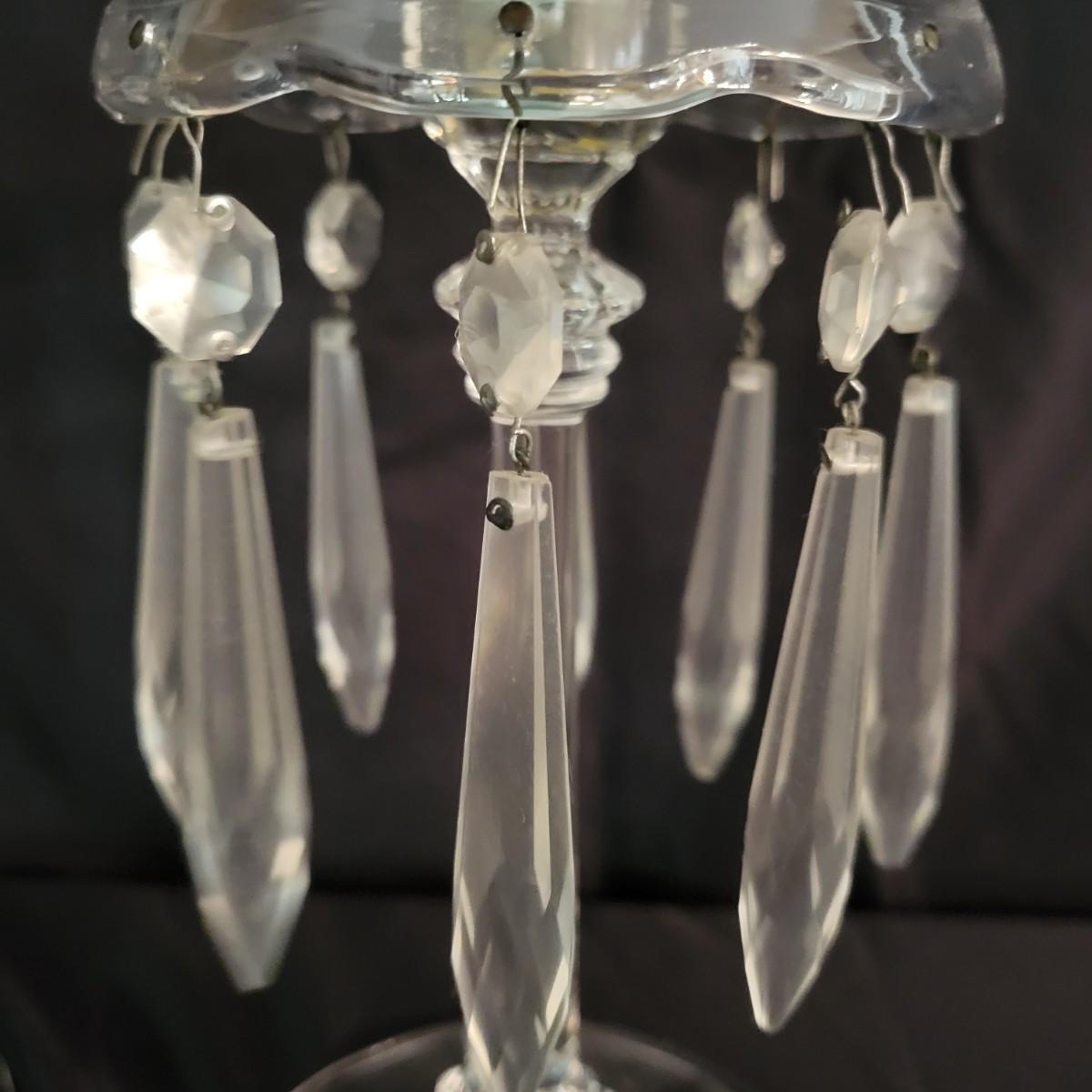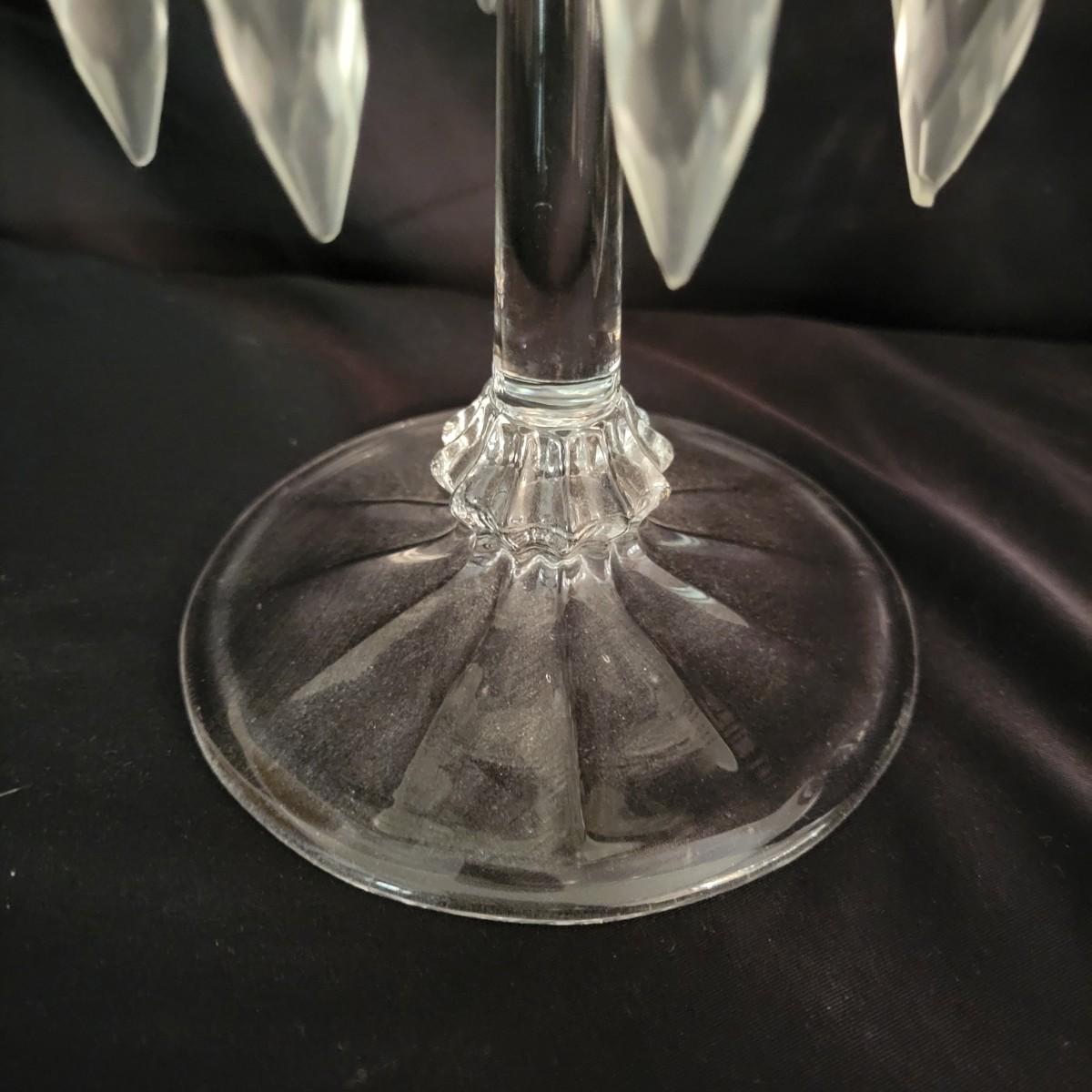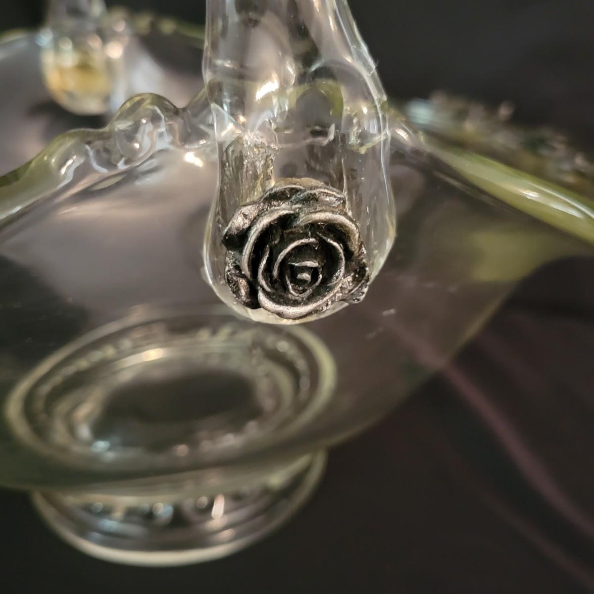 A glass basket and candleholders free of scratches or chips. The candleholders have multiple crystal like pieces hanging from them. The glass basket has multiple decorative rose patterns that appear to be pewter. Basket measures approximately 12" x 9" x 10"H. Local pickup only