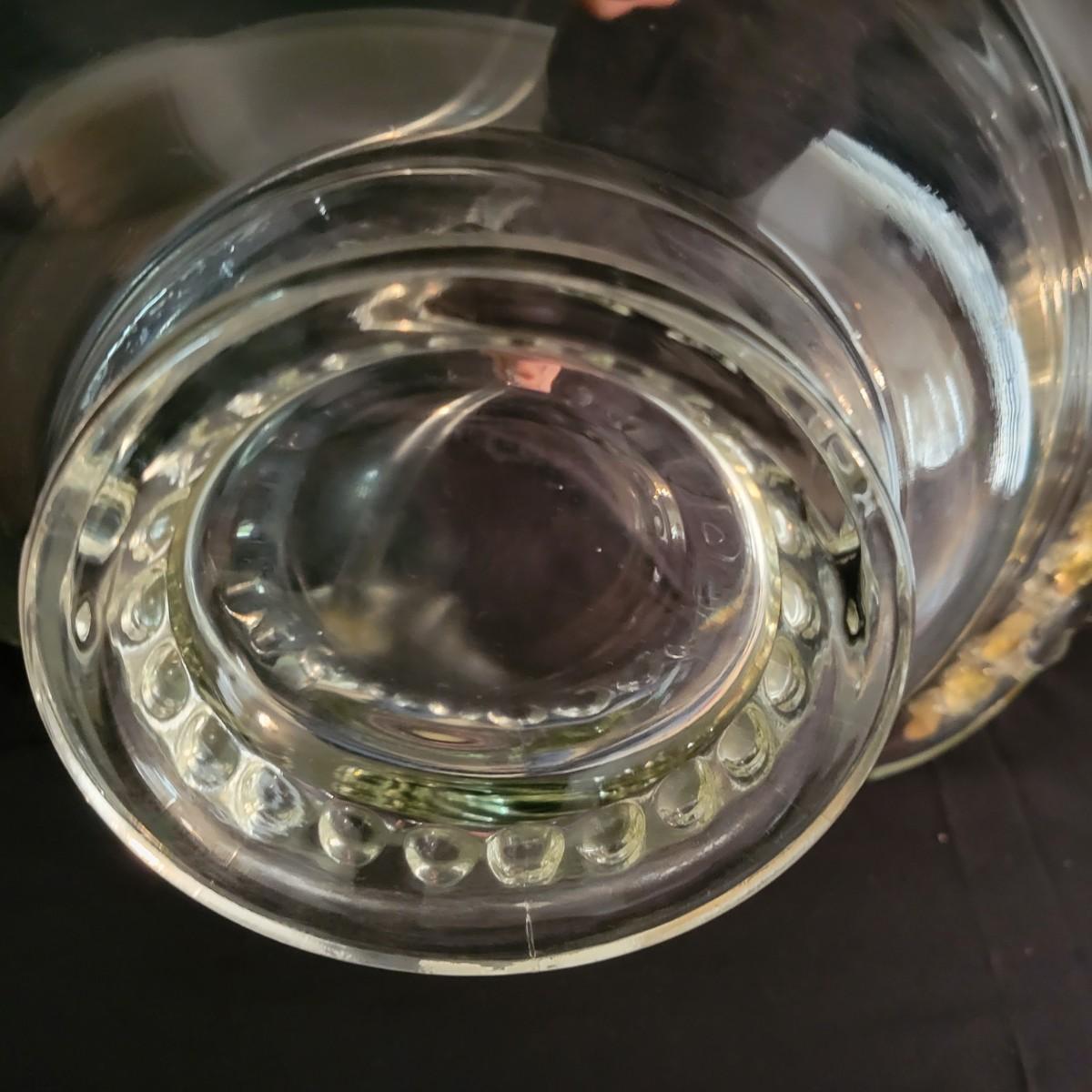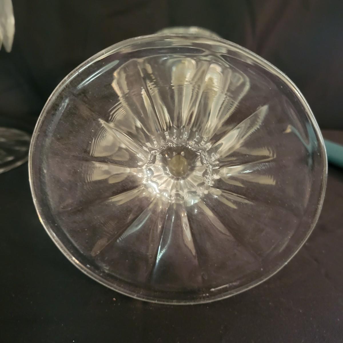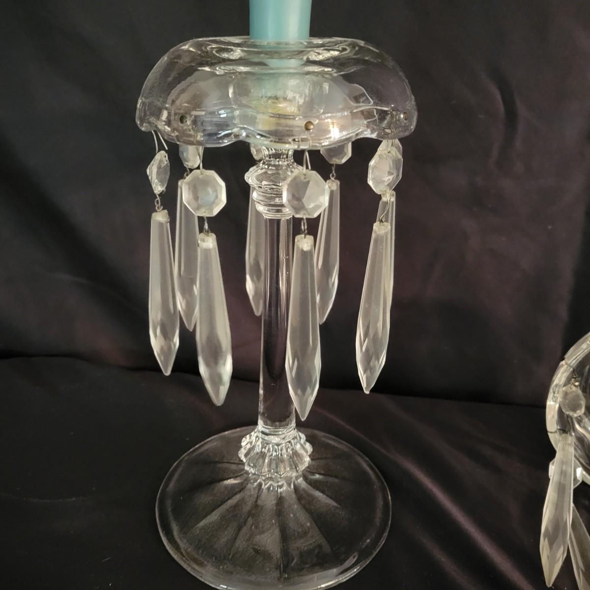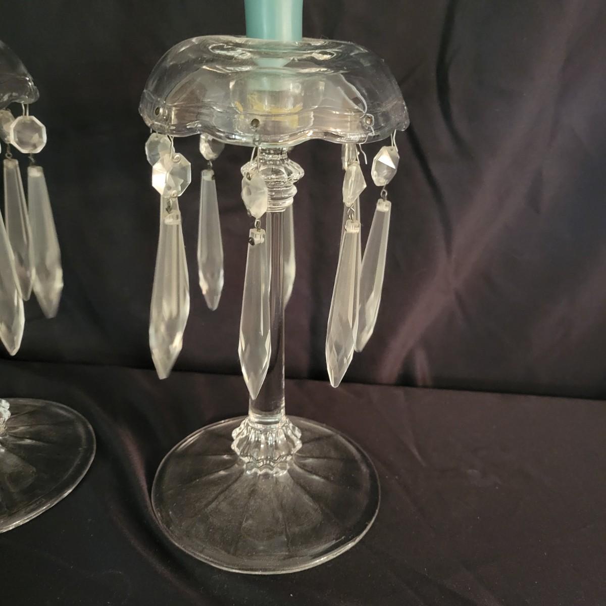 A glass basket and candleholders free of scratches or chips. The candleholders have multiple crystal like pieces hanging from them. The glass basket has multiple decorative rose patterns that appear to be pewter. Basket measures approximately 12" x 9" x 10"H. Local pickup only