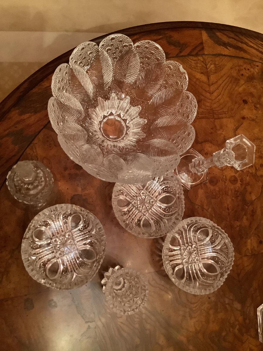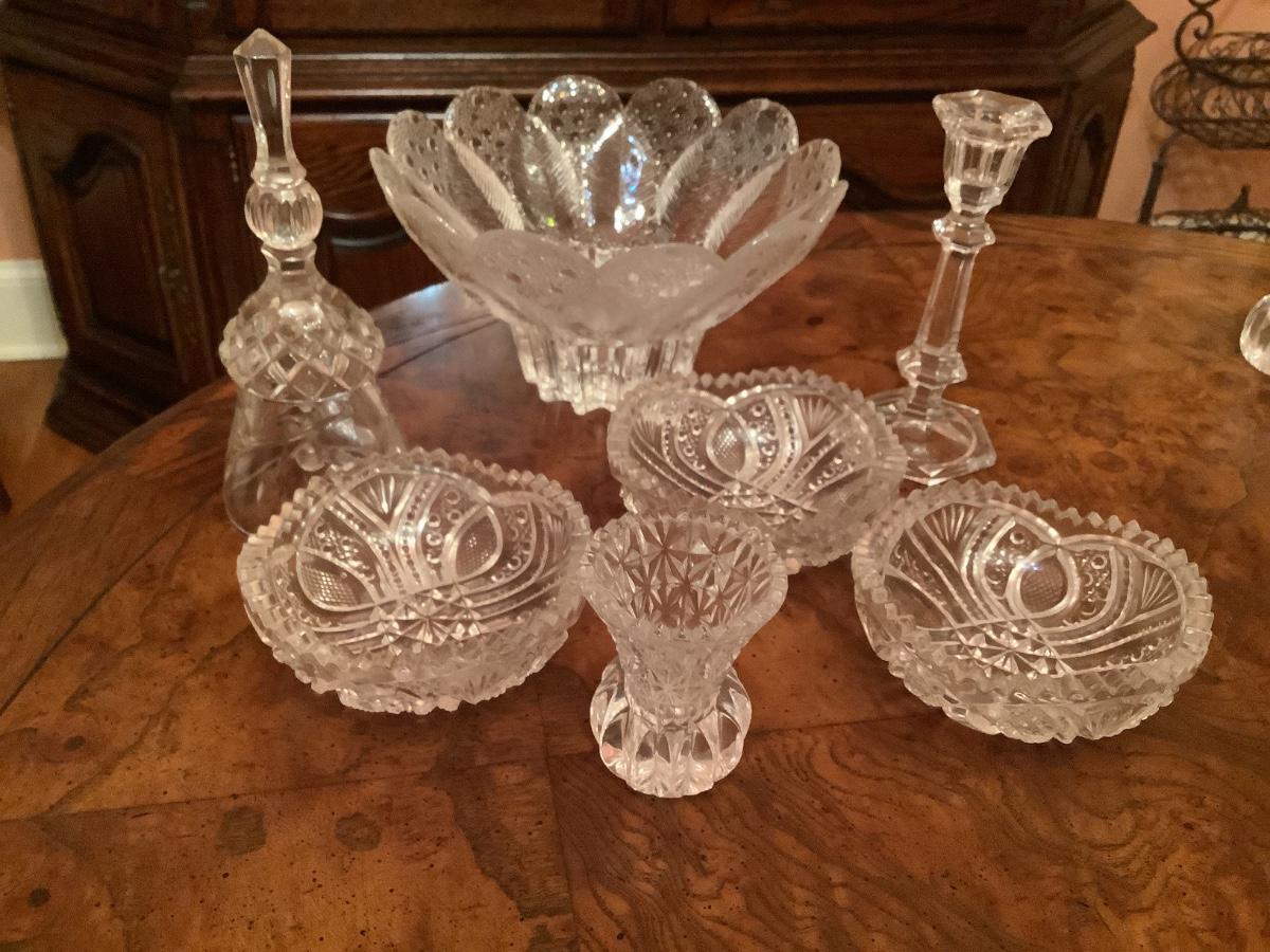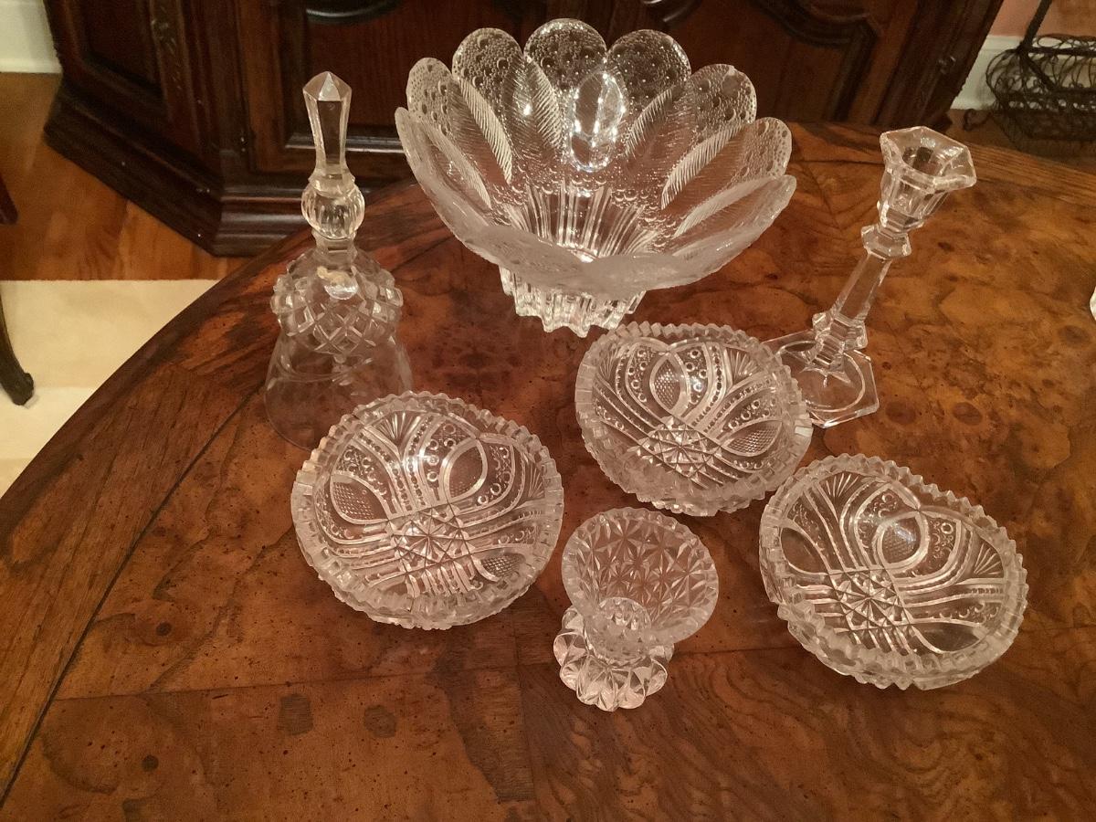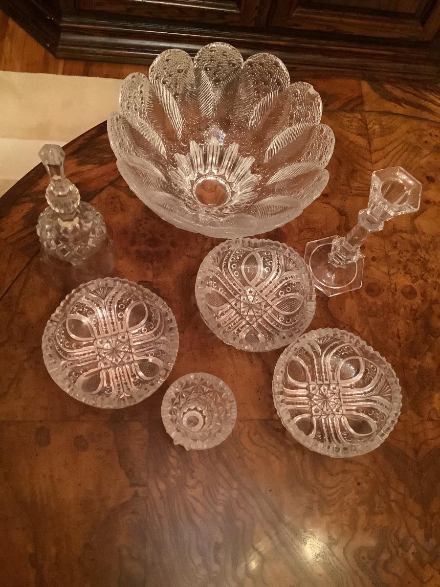 Glass bell , candlestick, toothpick holder, 4 glass bowls