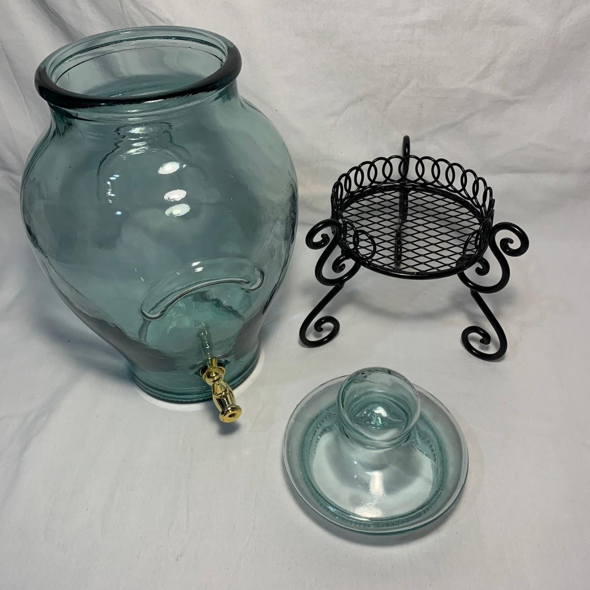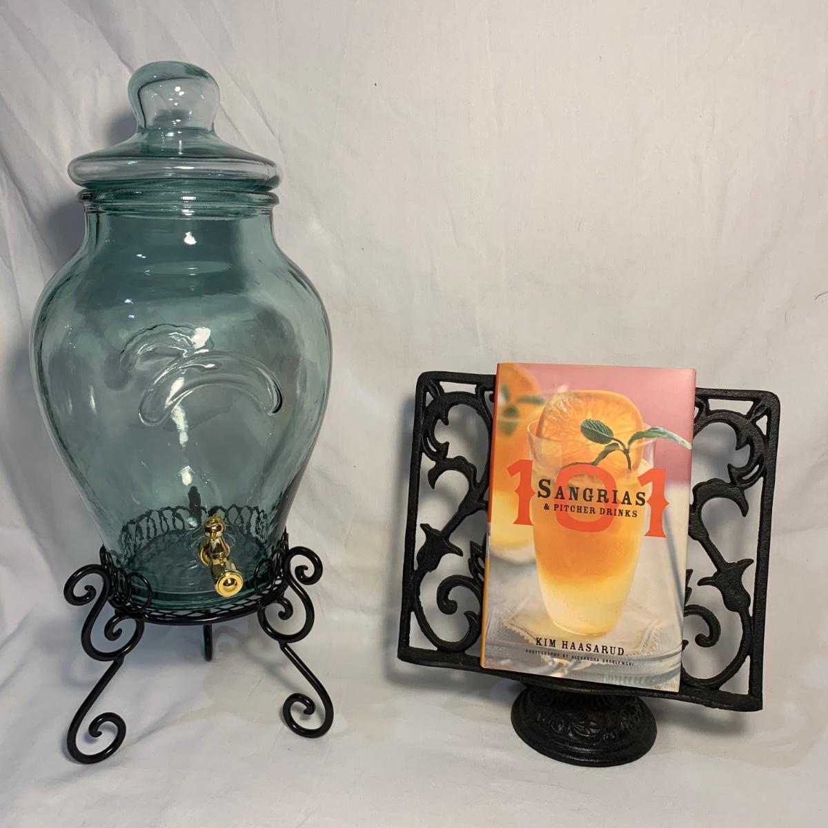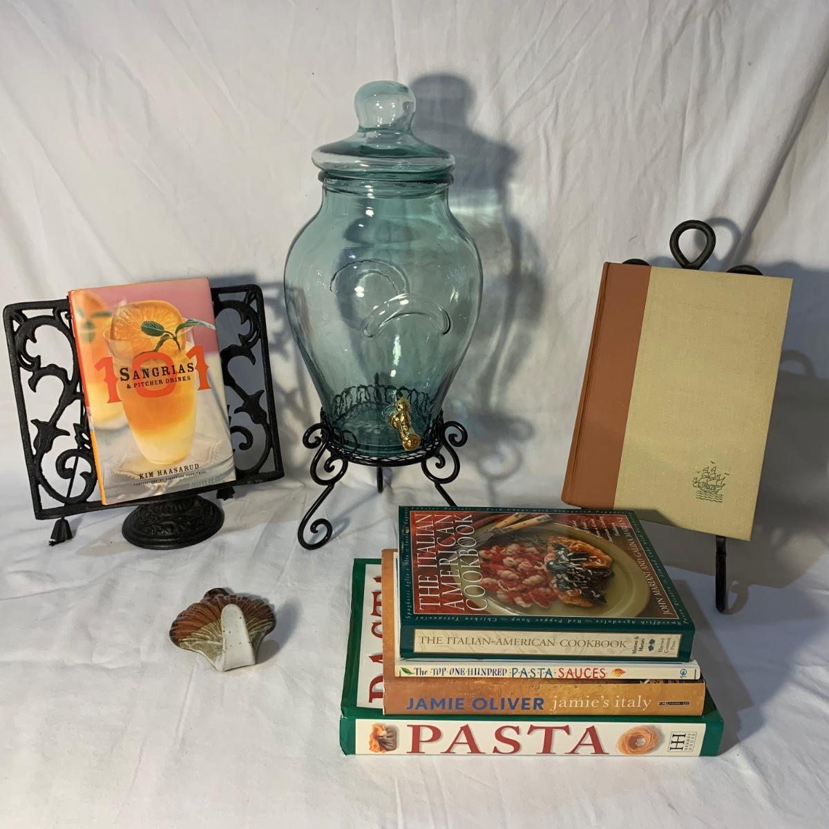 Lot includes glass beverage dispenser, five cookbooks and two iron-like cookbook stands. Glass beverage dispenser has a lid and metal stand. All items are used, please see photos for more details.
