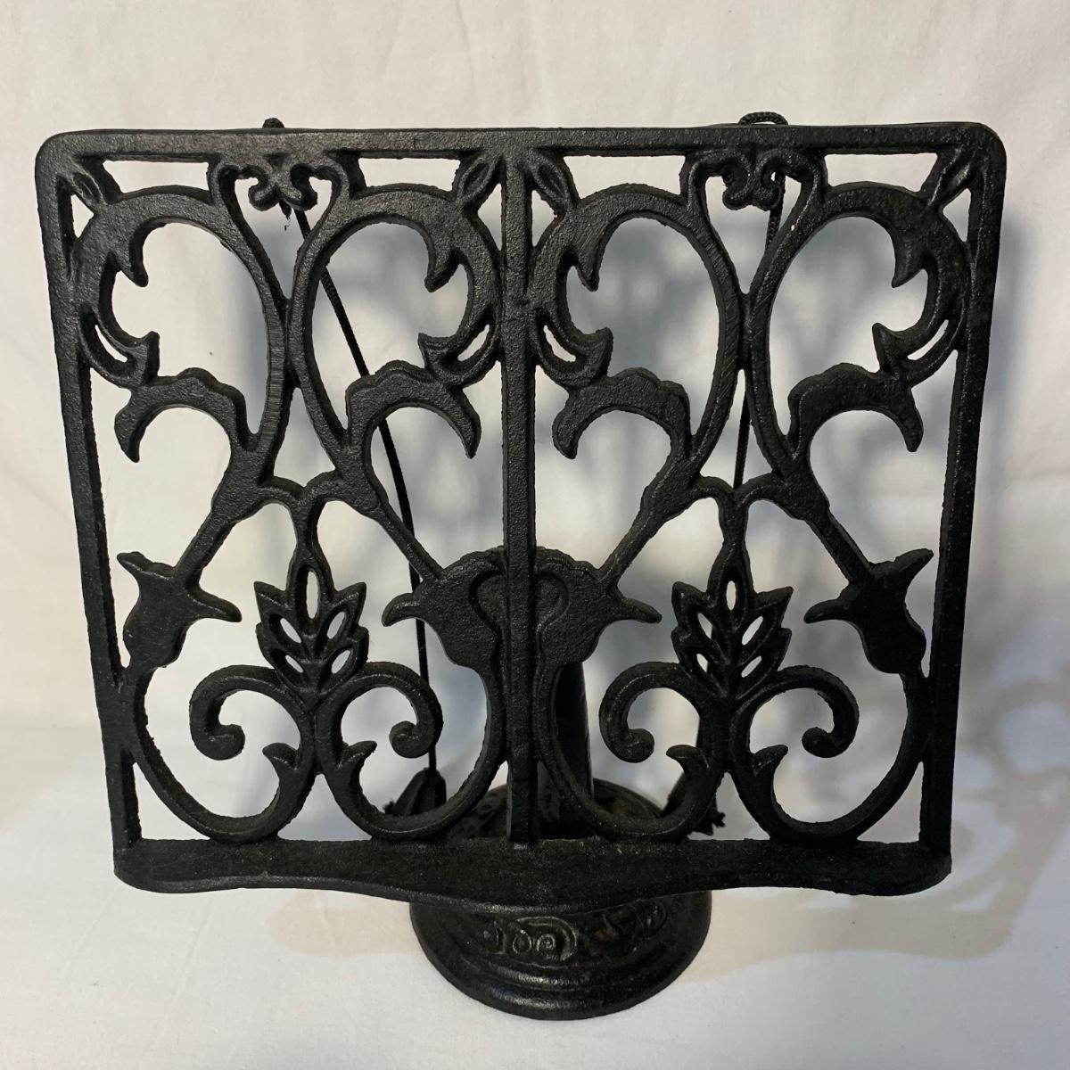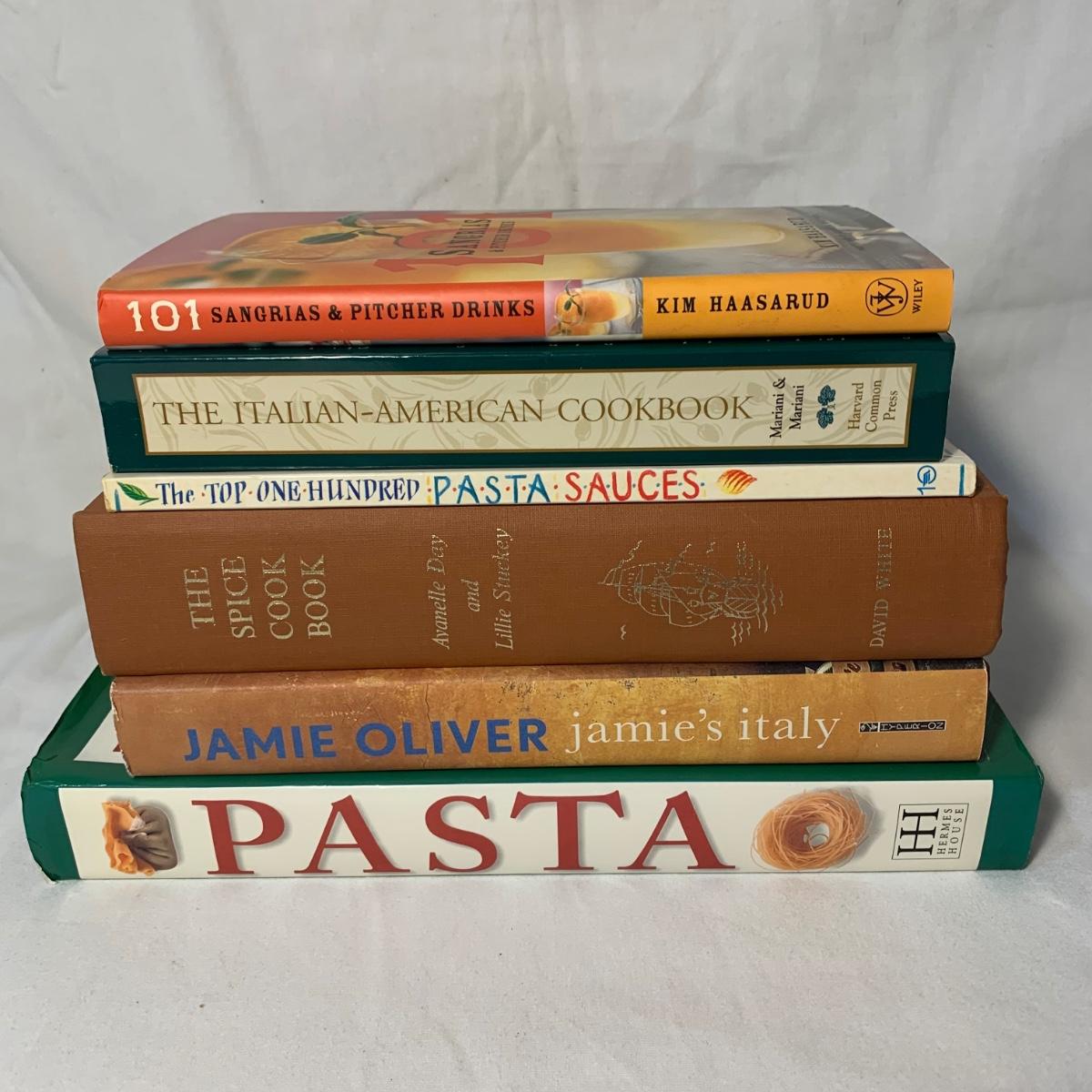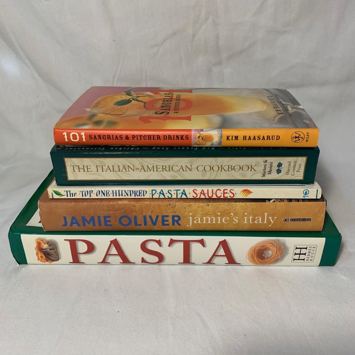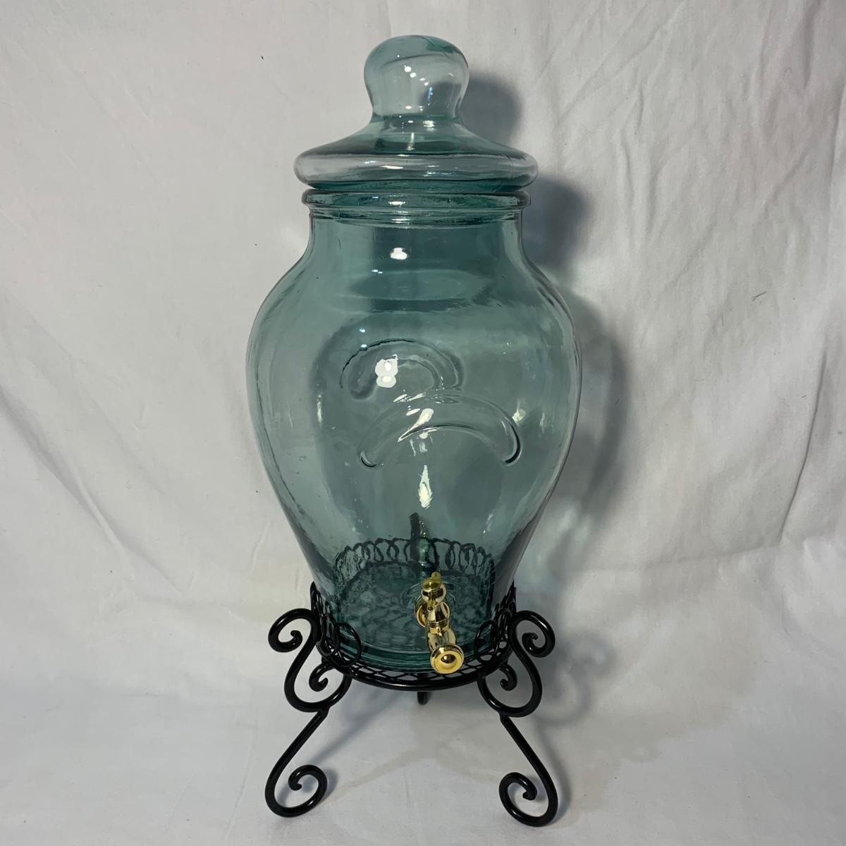 Lot includes glass beverage dispenser, five cookbooks and two iron-like cookbook stands. Glass beverage dispenser has a lid and metal stand. All items are used, please see photos for more details.