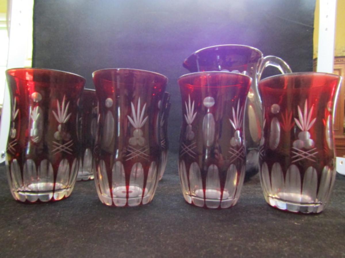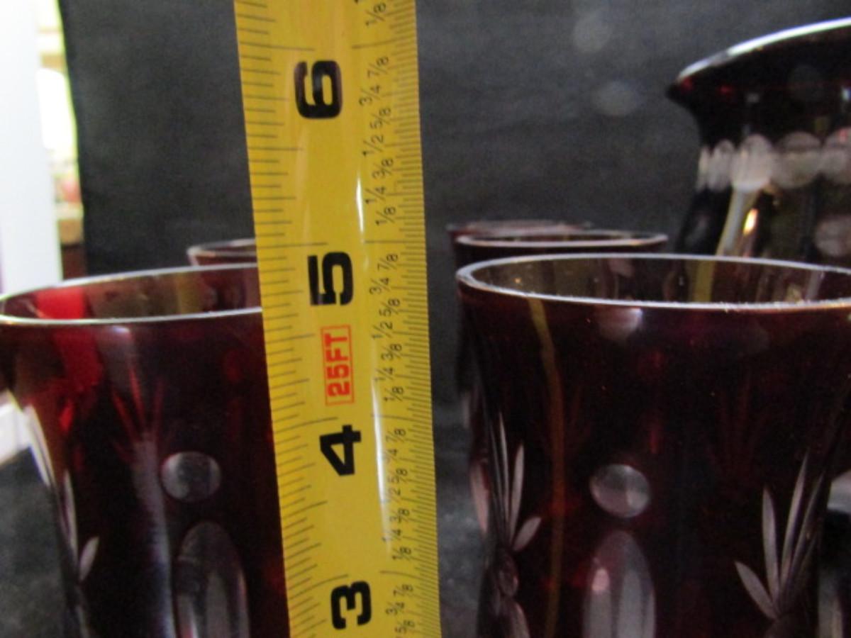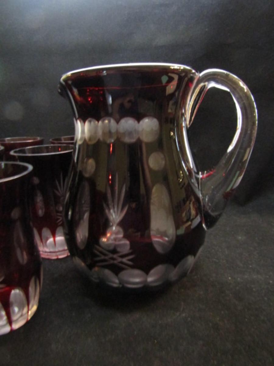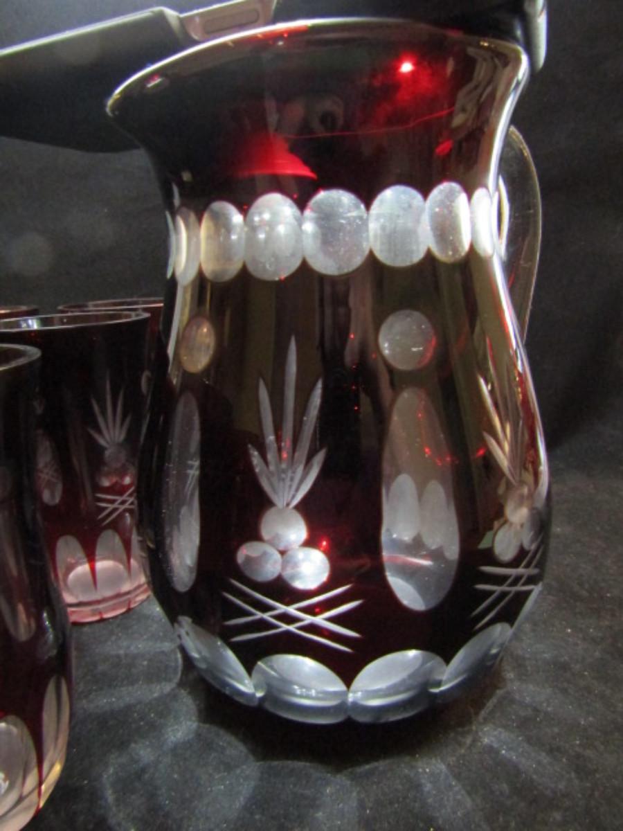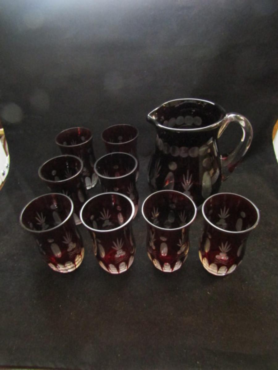 Glass Beverage Set- Ruby Red Cut to Clear- 1 Pitcher and 8 Glasses (#167)