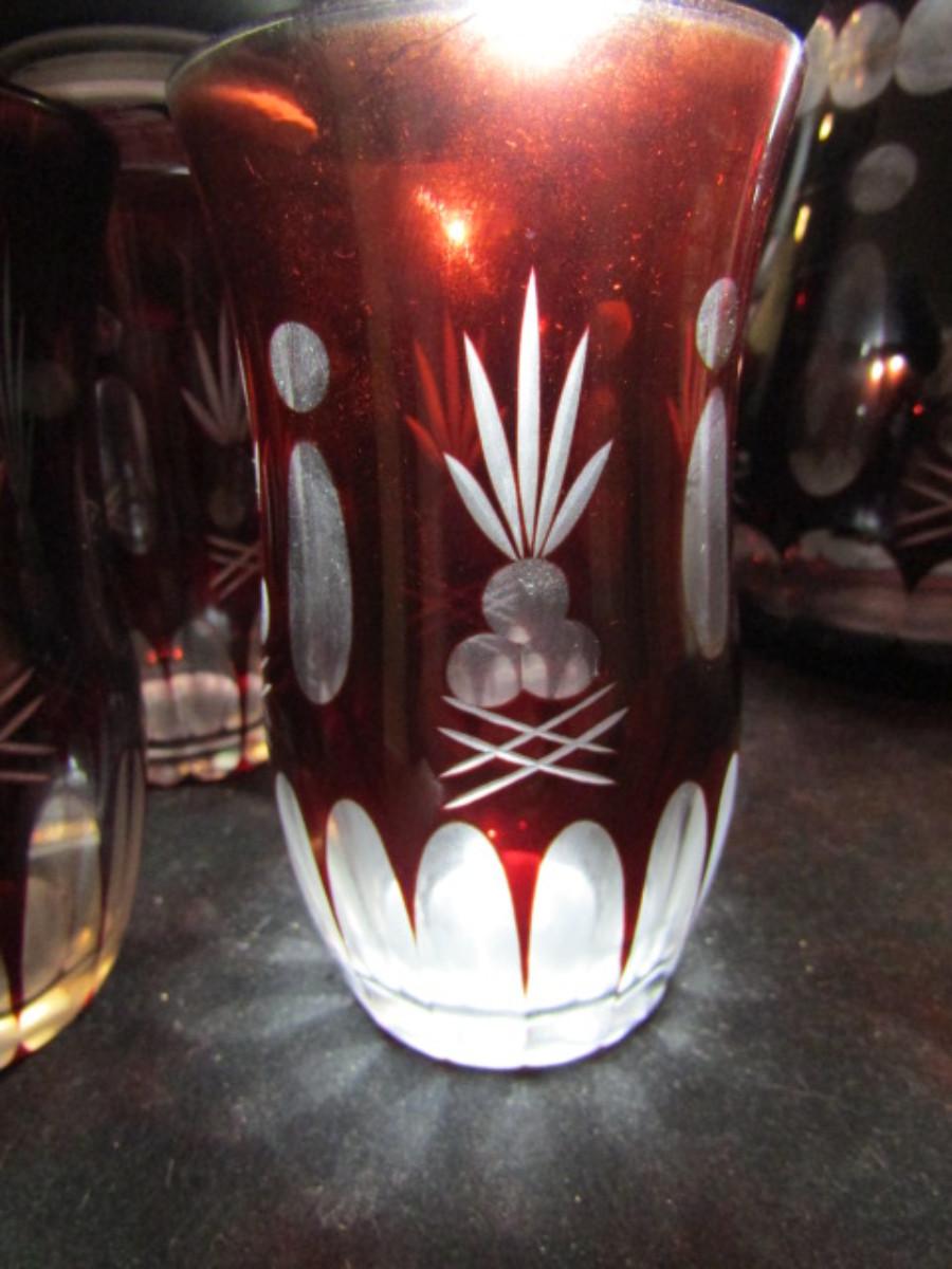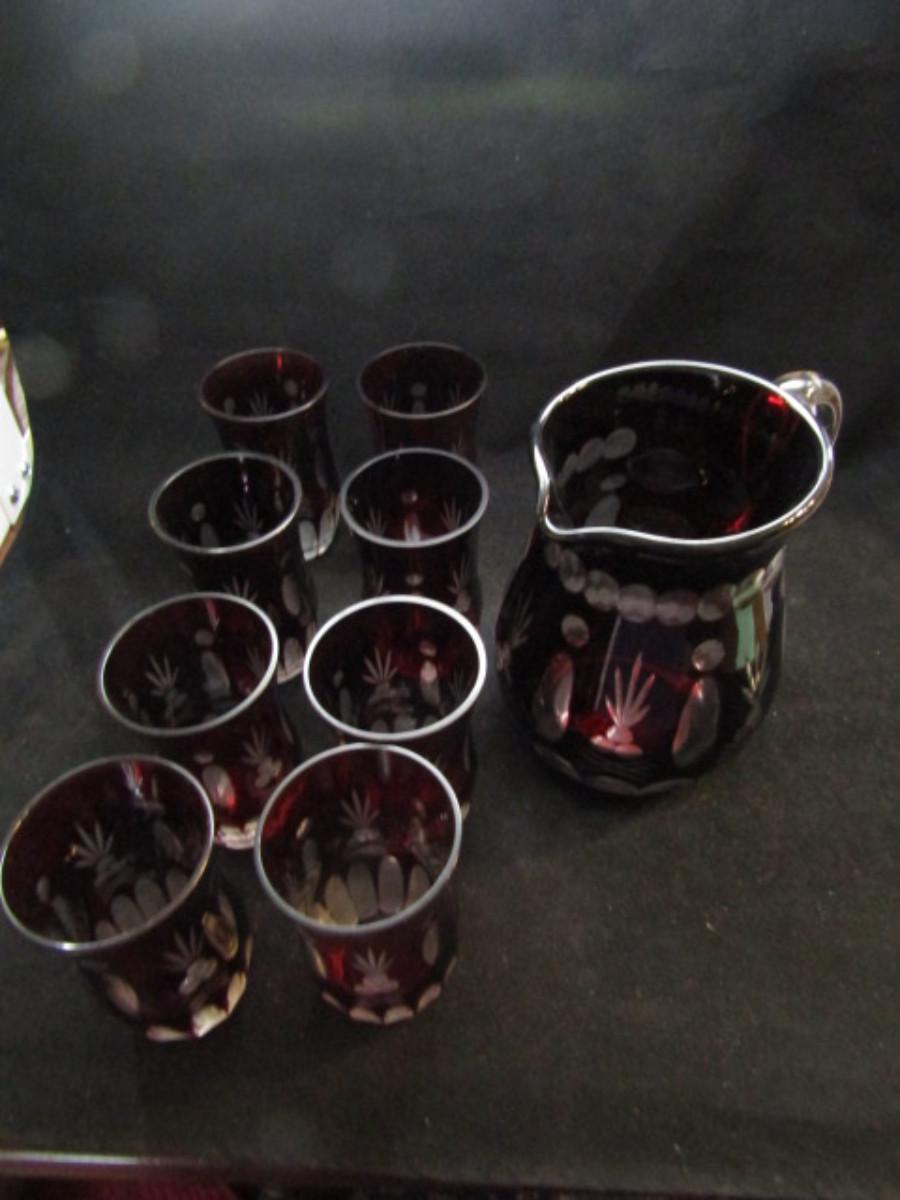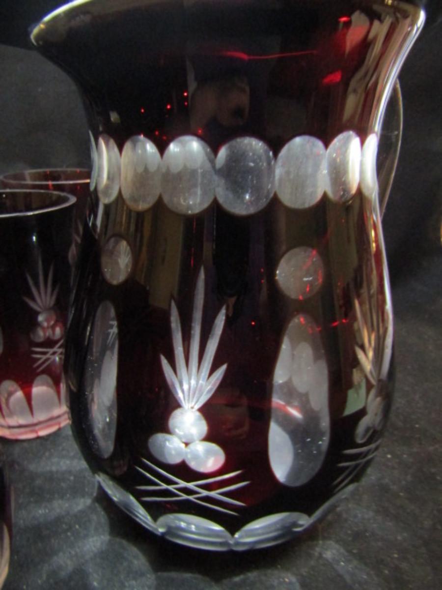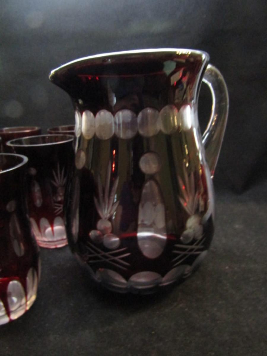 Glass Beverage Set- Ruby Red Cut to Clear- 1 Pitcher and 8 Glasses (#167). Possibly Czech Bohemian.