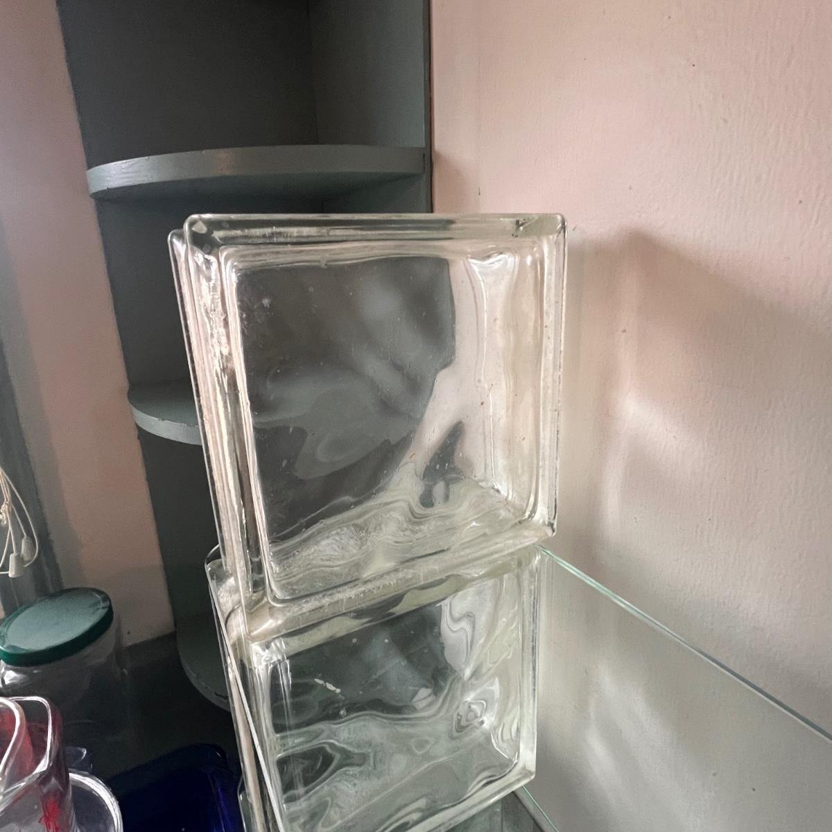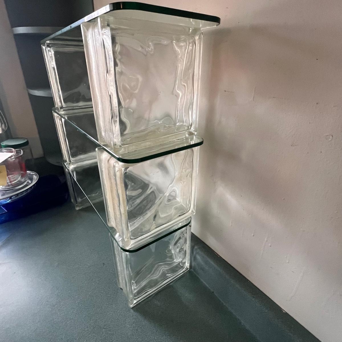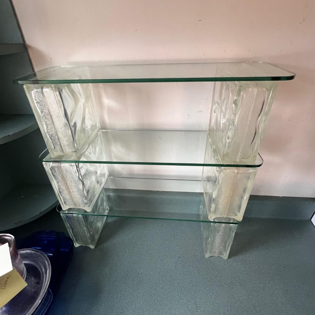 Six glass blocks each measure 7.5” square x 3” thick. Lot also includes three glass shelves that work great to make this a nice little shelf unit. The shelves each measure 7.5” x 0.25” x 24”.
