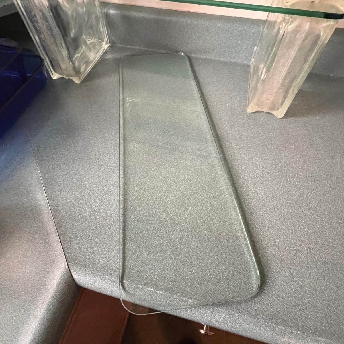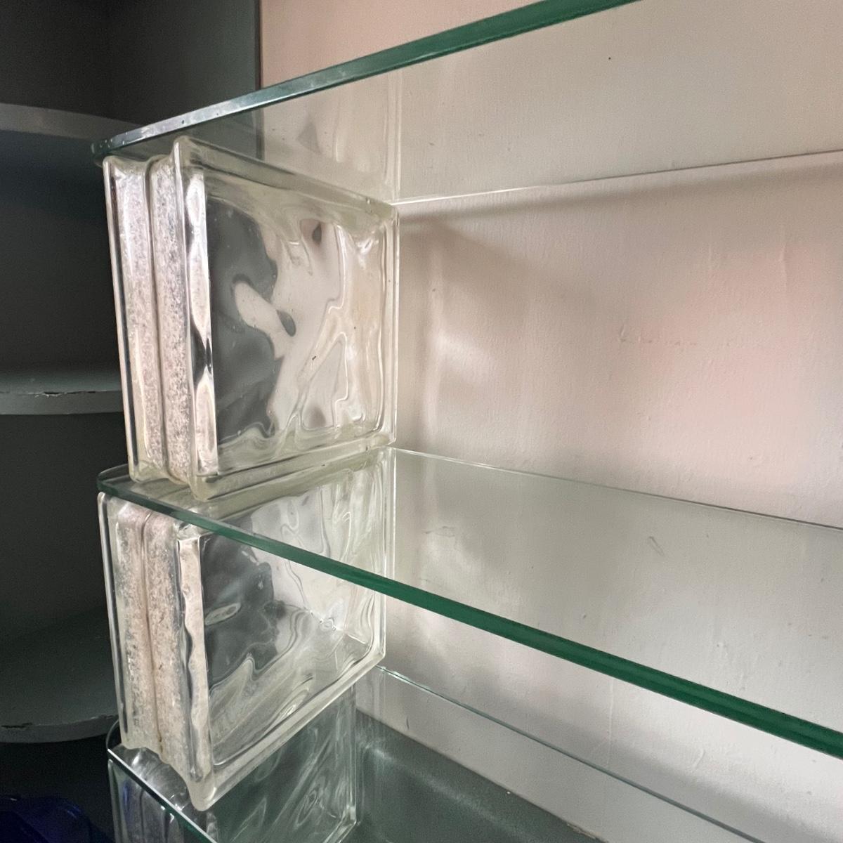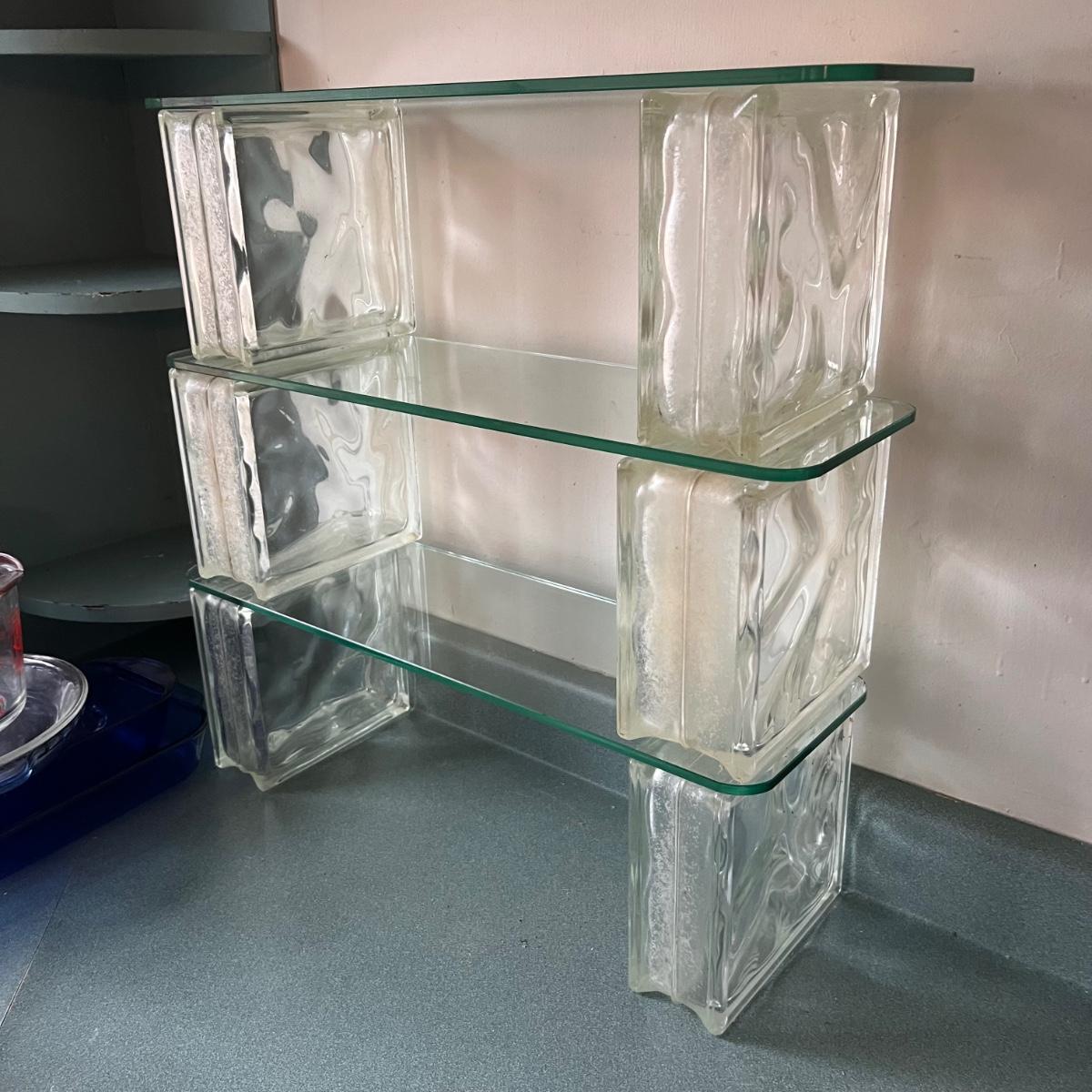 Six glass blocks each measure 7.5” square x 3” thick. Lot also includes three glass shelves that work great to make this a nice little shelf unit. The shelves each measure 7.5” x 0.25” x 24”.
