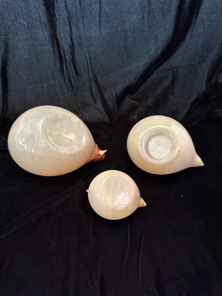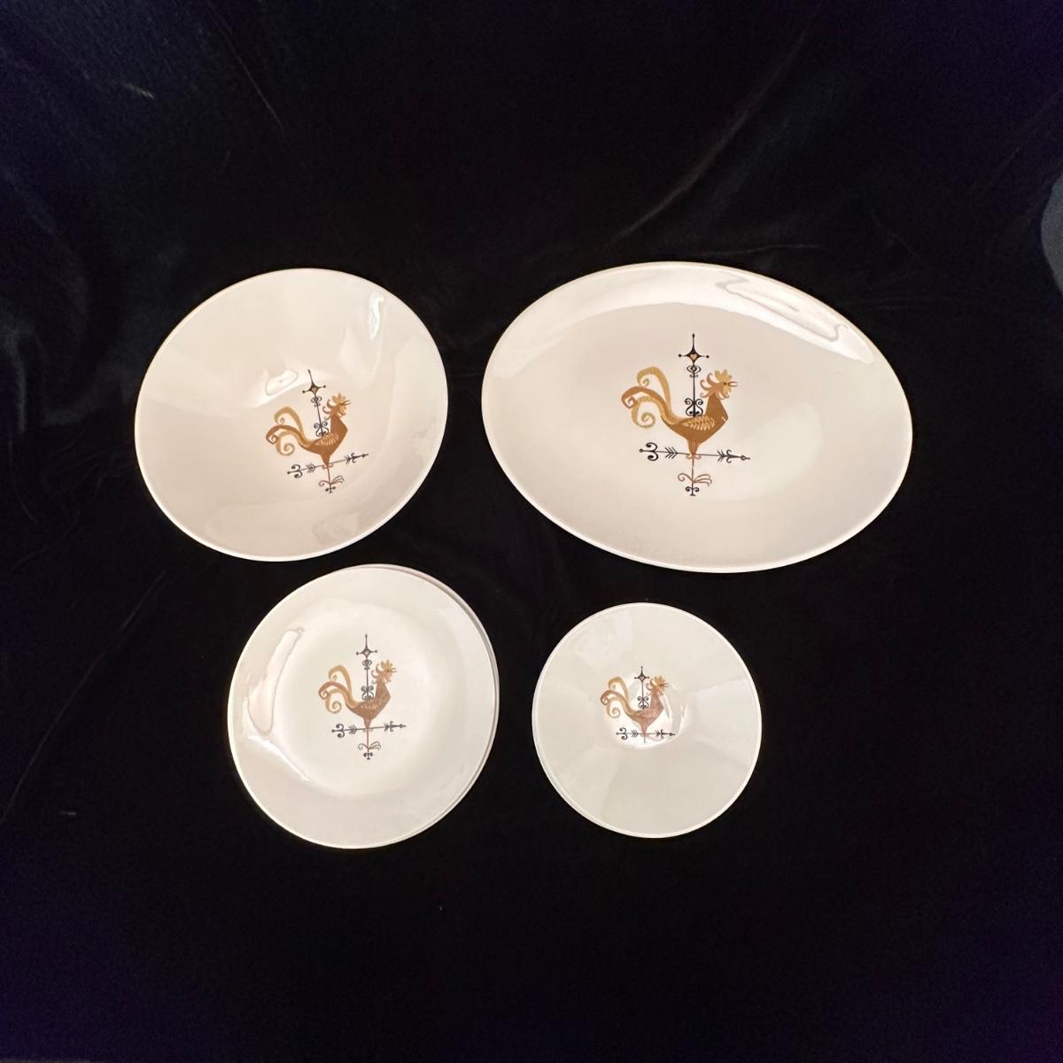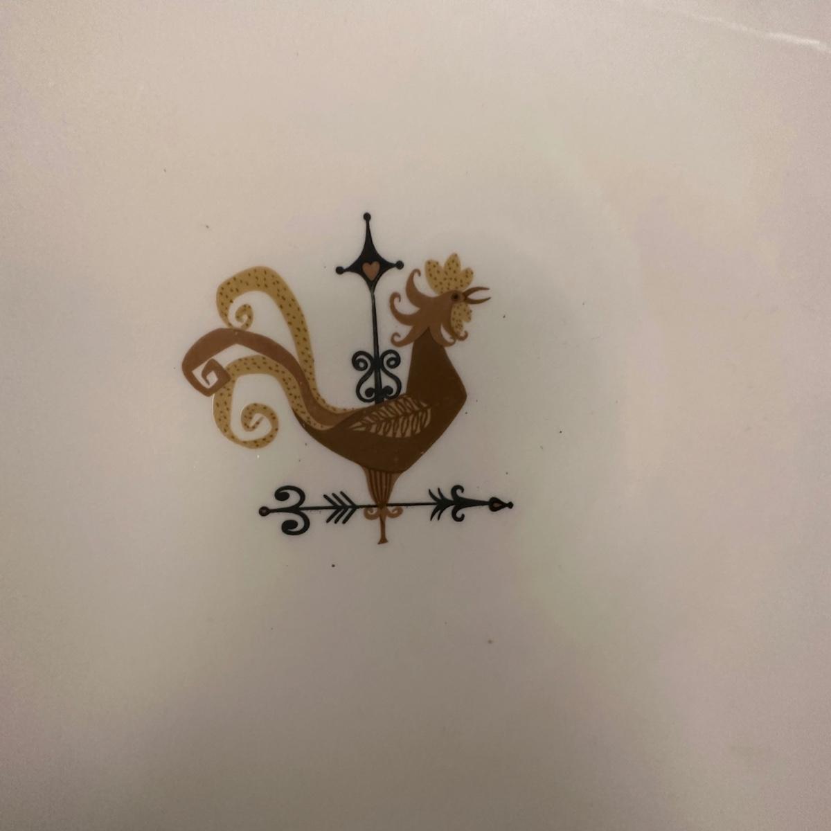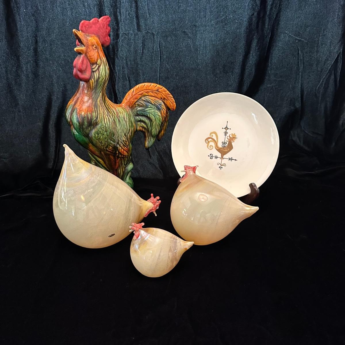 Set of three glass blown hens. Largest hen is 7” tall from tail to beak. Four small bowls and three small plates with serving bowl and two oval platters. Largest oval platter measures 14.5”. Multicolored rooster is 7.5" x 3.5" x 12.5”H. Shipping available.