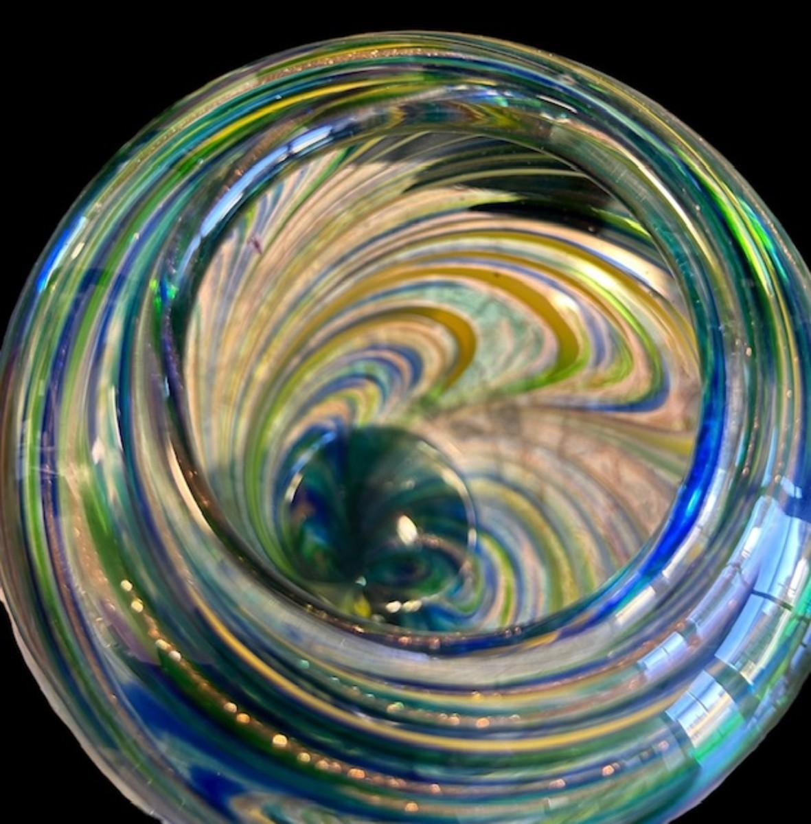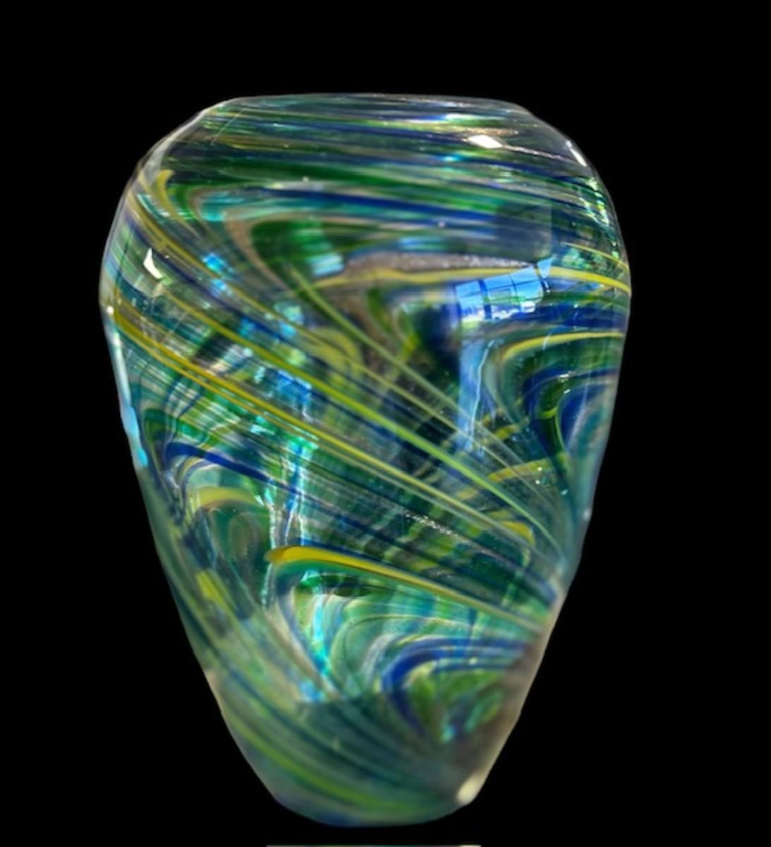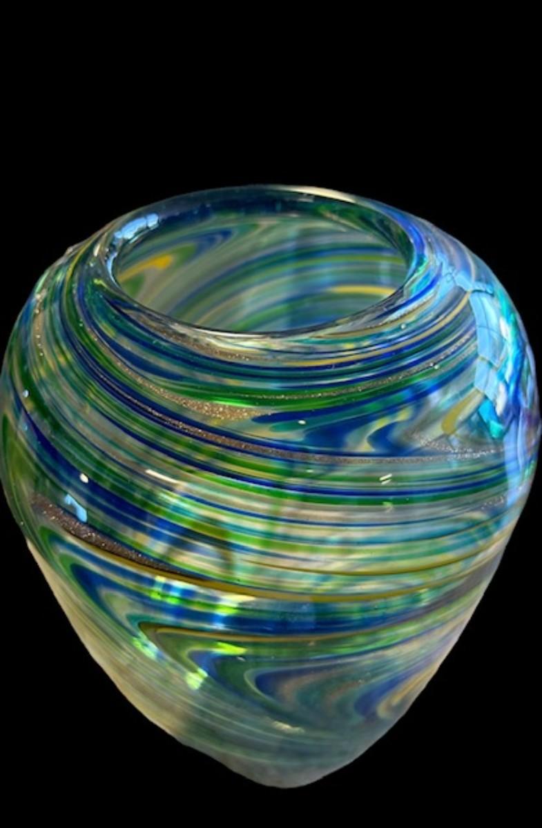 Glass Blown Vase. Blue, green, yellow hues with a hint of gold sparkle. Excellent condition.