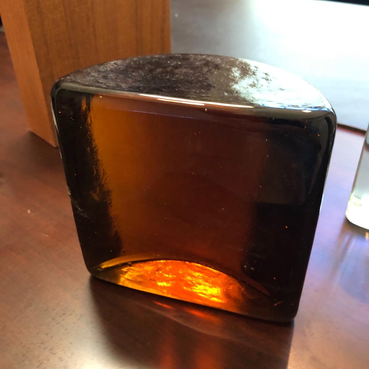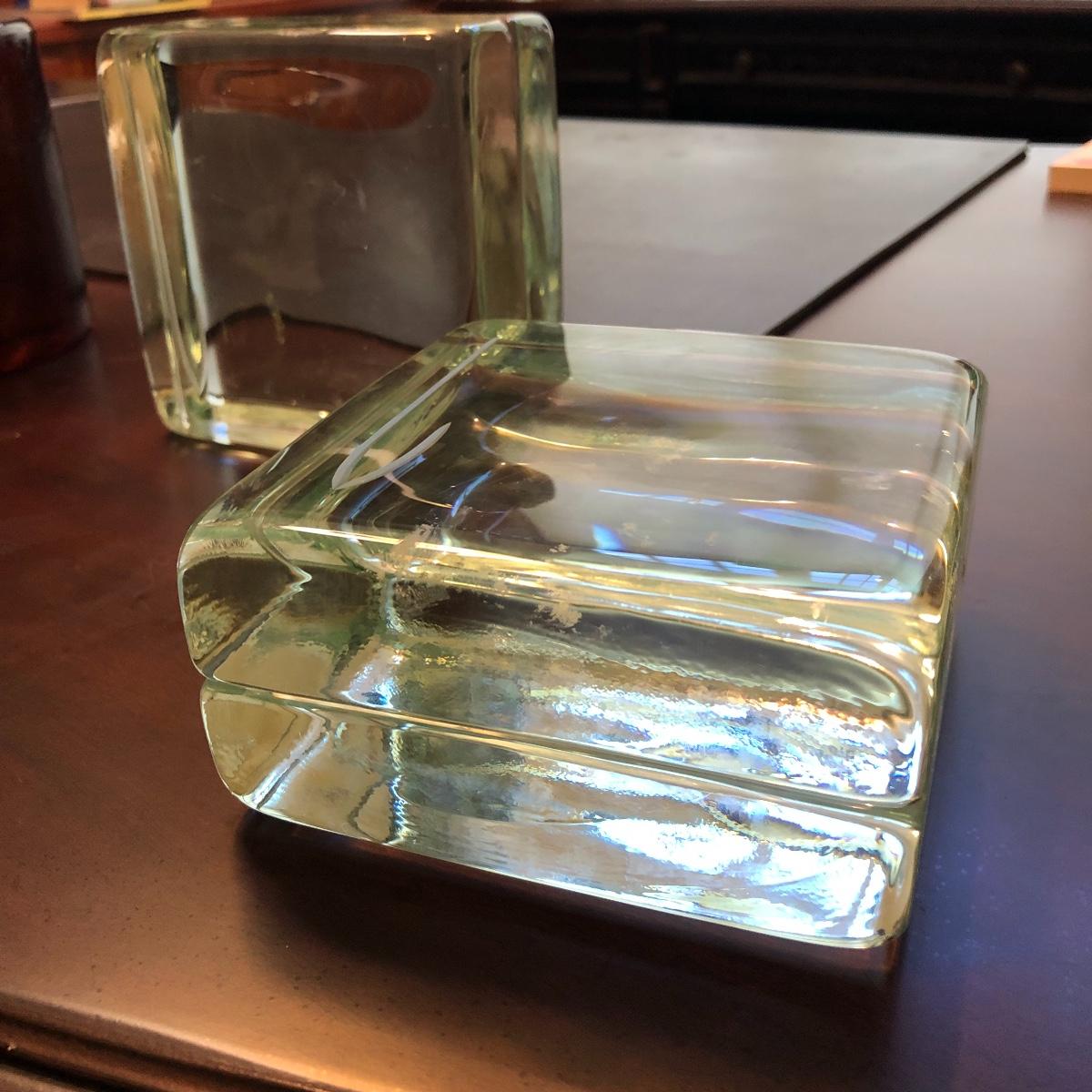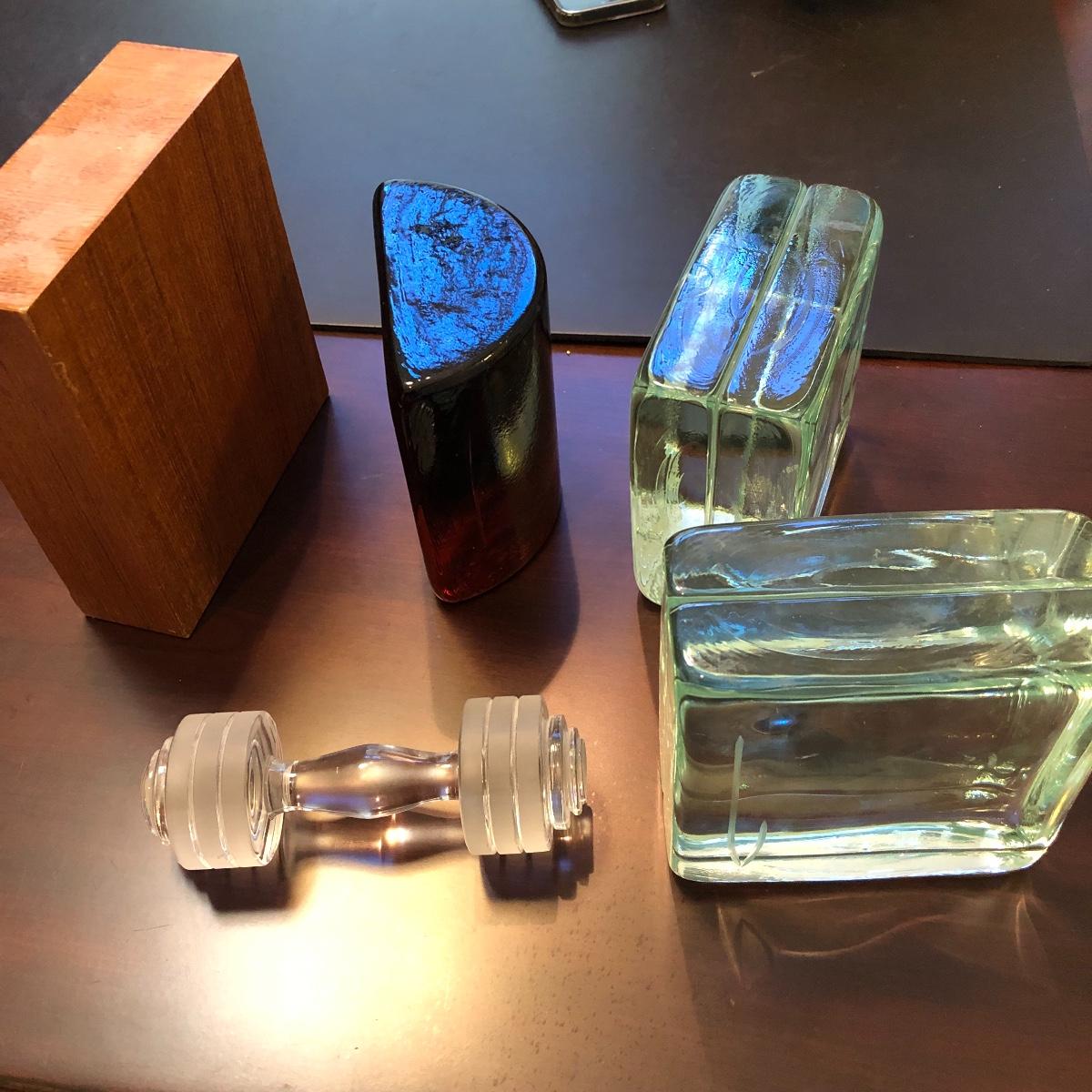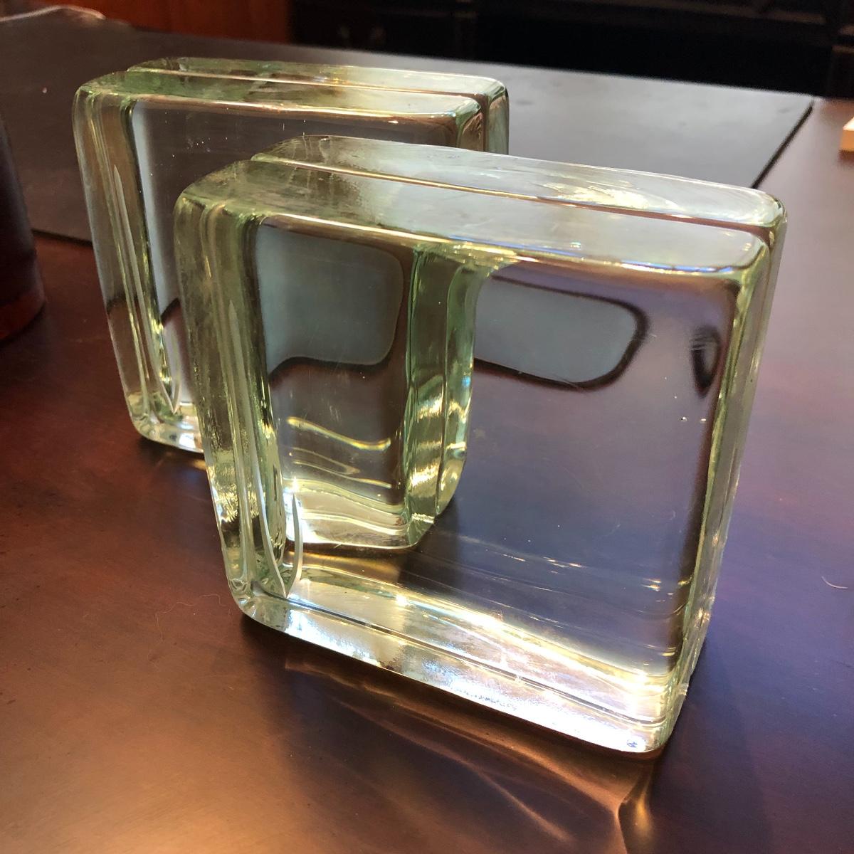 This lot includes four bookends (three of which are glass) and a glass barbell paperweight. Glass block bookends measures 5” x 5”. The wooden bookend filled with sand measures 6” x 7”. The barbell paperweight is 6” long. Shipping Available.