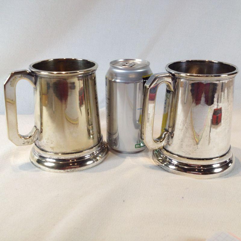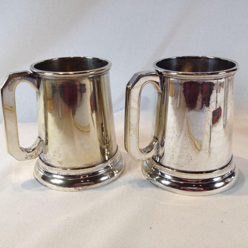 This lot is for a pair of heavy Silver-Plated Glass-Bottomed Tankards. Tankards are marked E.P.N.S. on the bottom. They could use a bit of polishing/cleaning, but are in very good condition and ready for your favorite IPA.