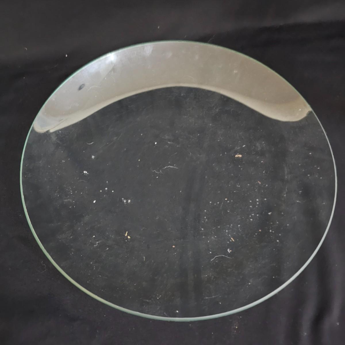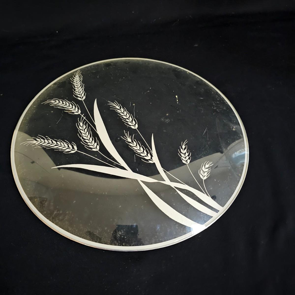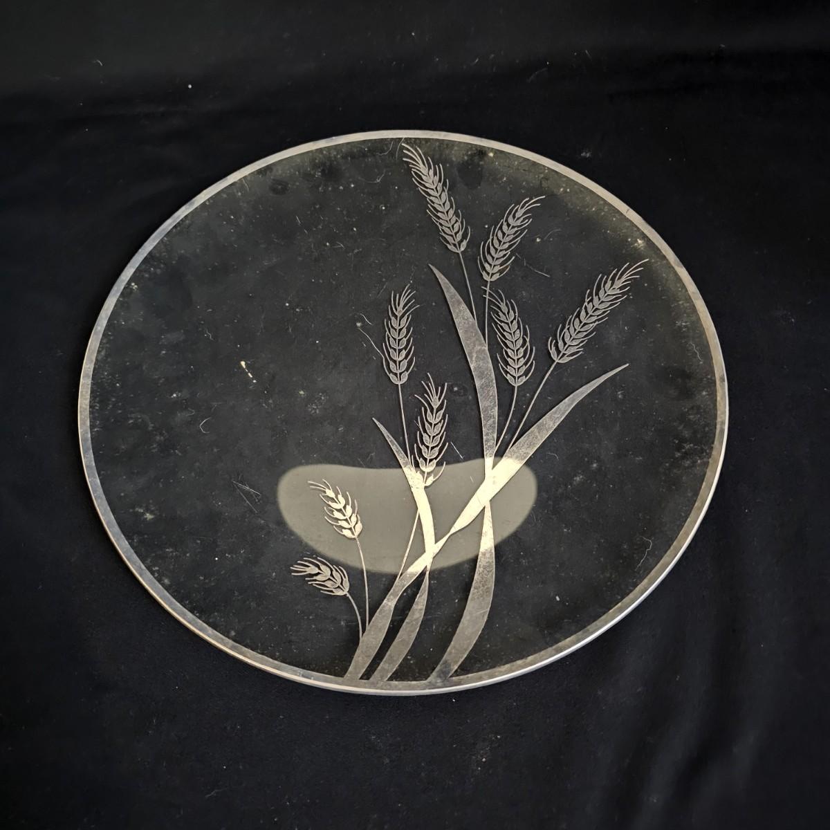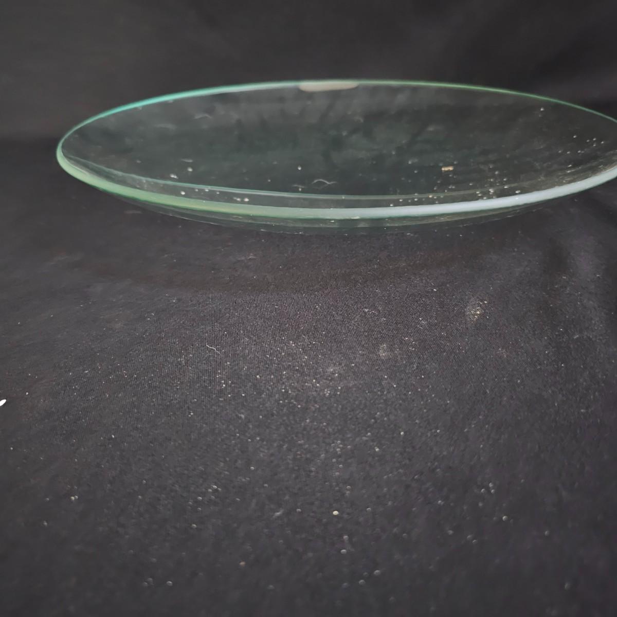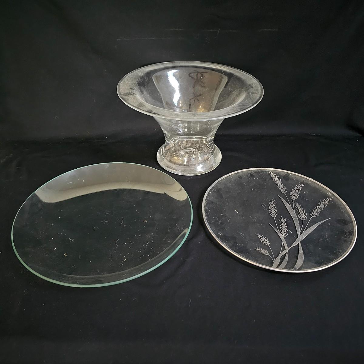 Two large round glass plates and one tall pedestal bowl. Large plate is 15" D, leaf plate is 13.5" D and the pedestal is 14.5" x 9"H. See photos for details. Shipping available.