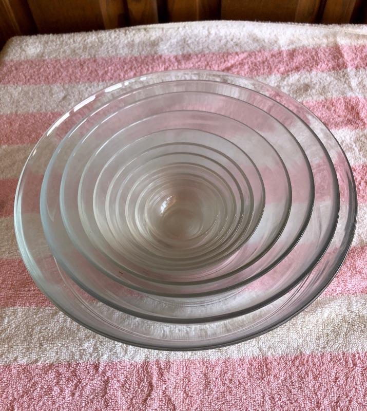 Glass bowl set. 10 different sizes. Good condition, just a little dusty from being in cupboard.