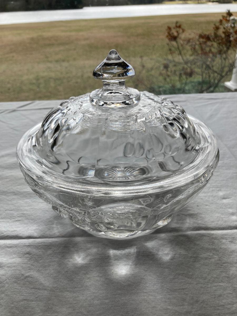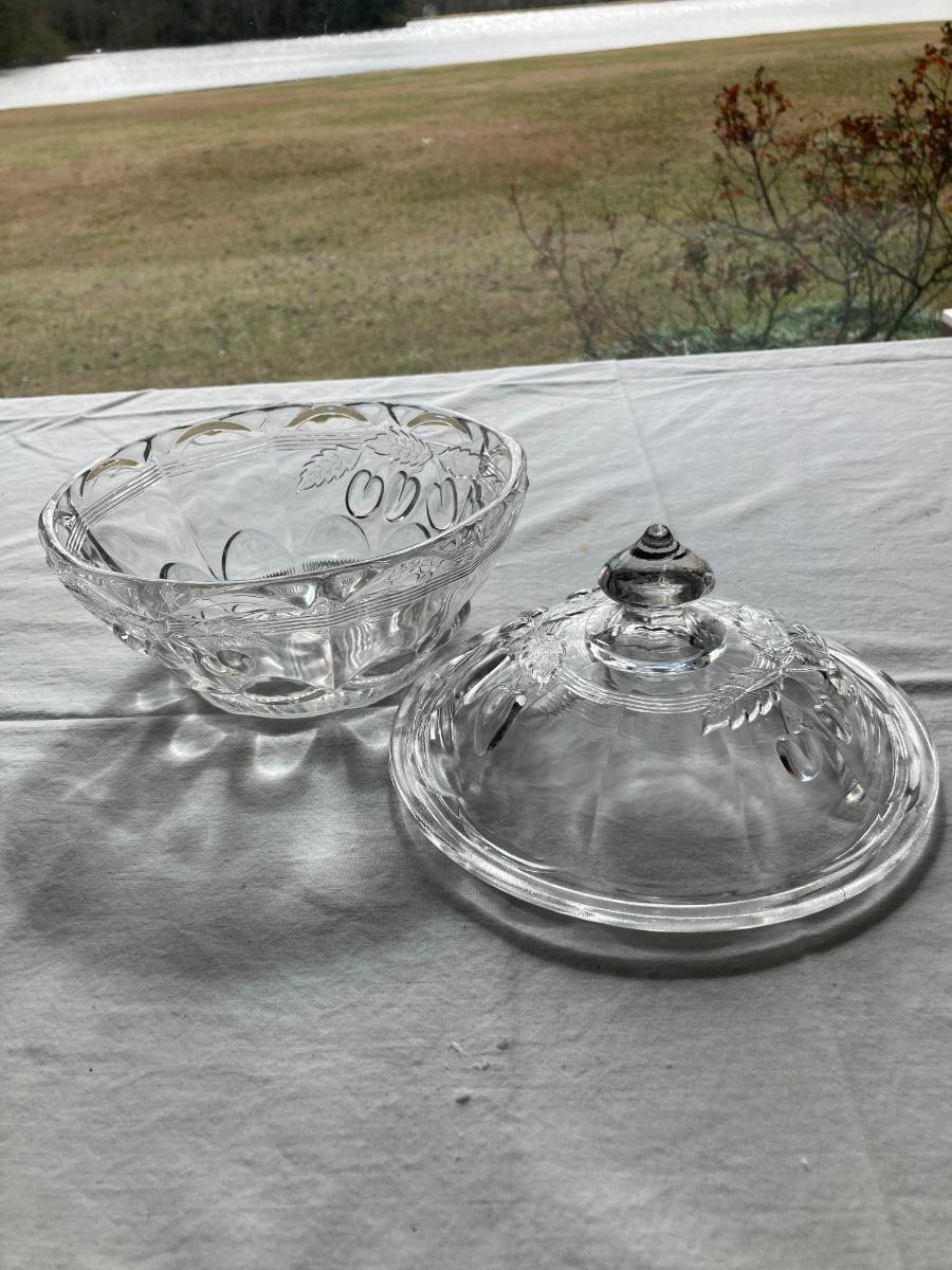 Vintage pressed glass covered bowl, cherry design. 7 1/4”w x 6”h