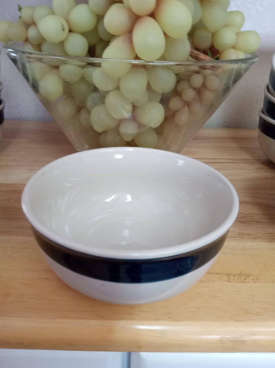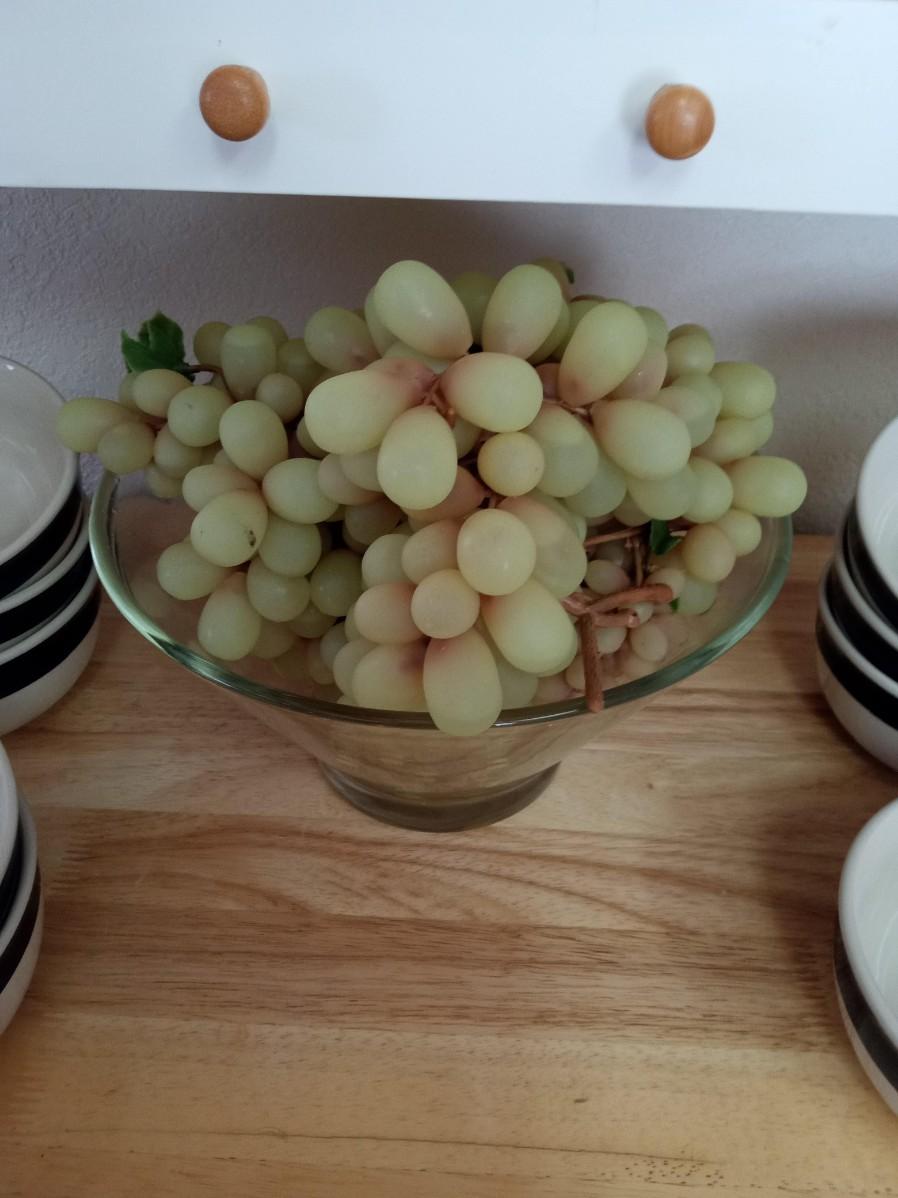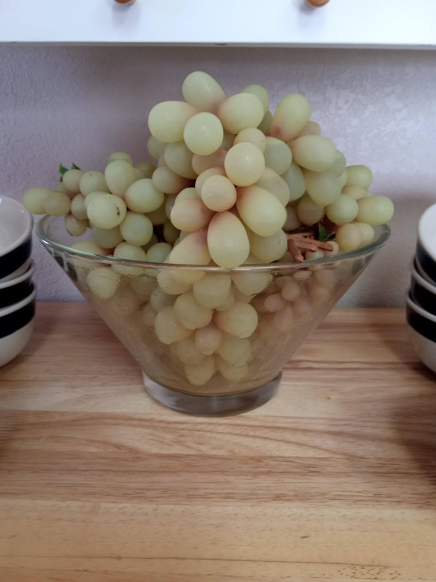 GLASS BOWL WITH RUBBER GRAPES AND PERFECT SIZE CEREAL BOWLS