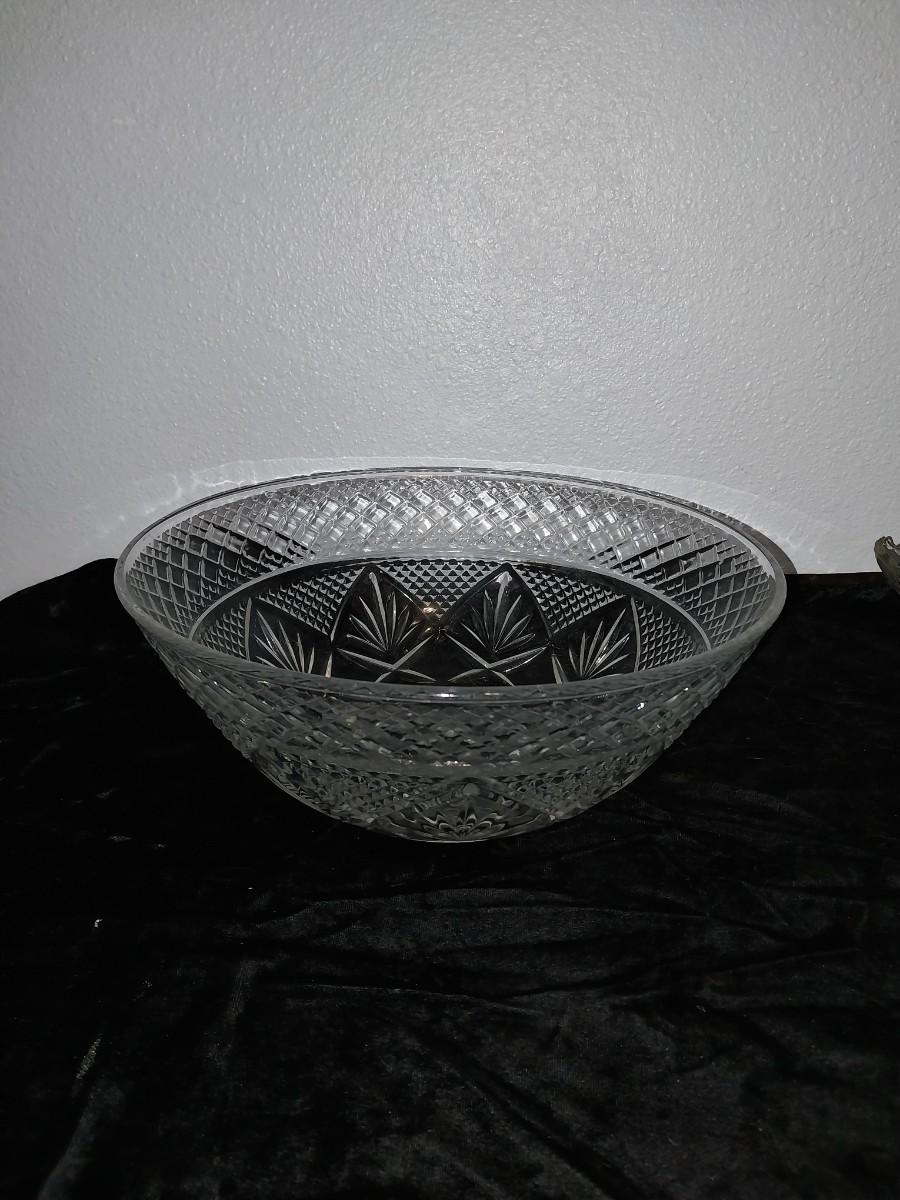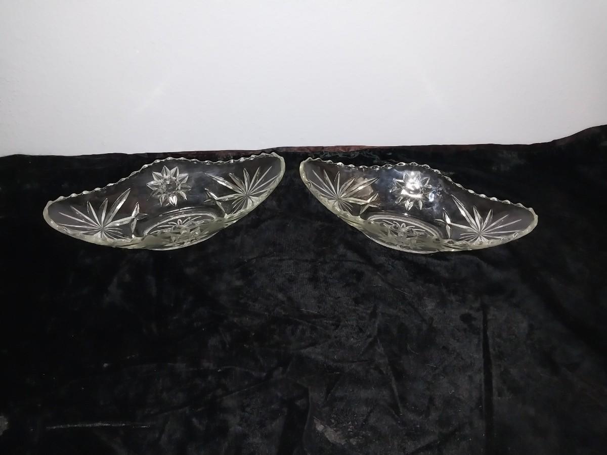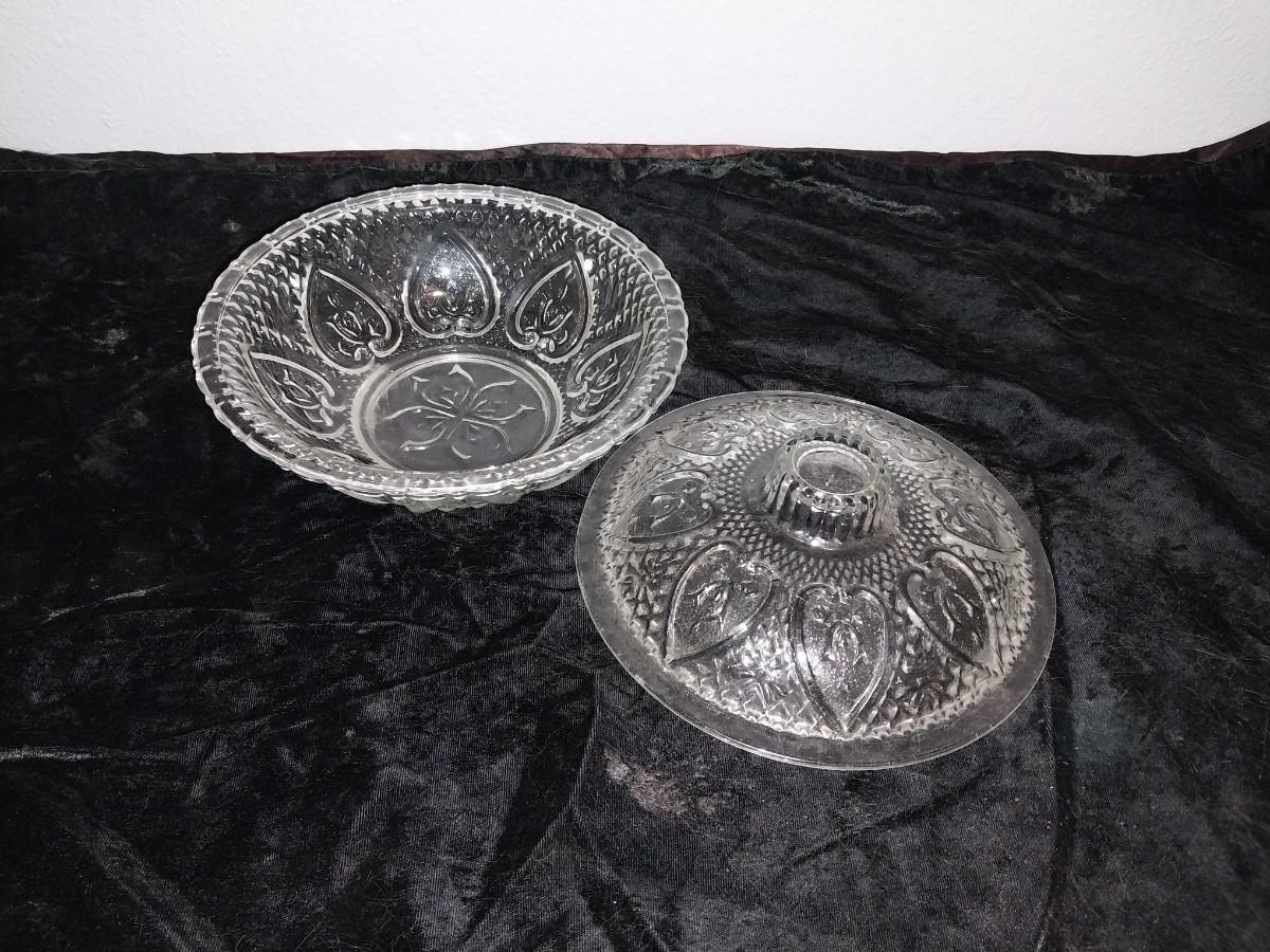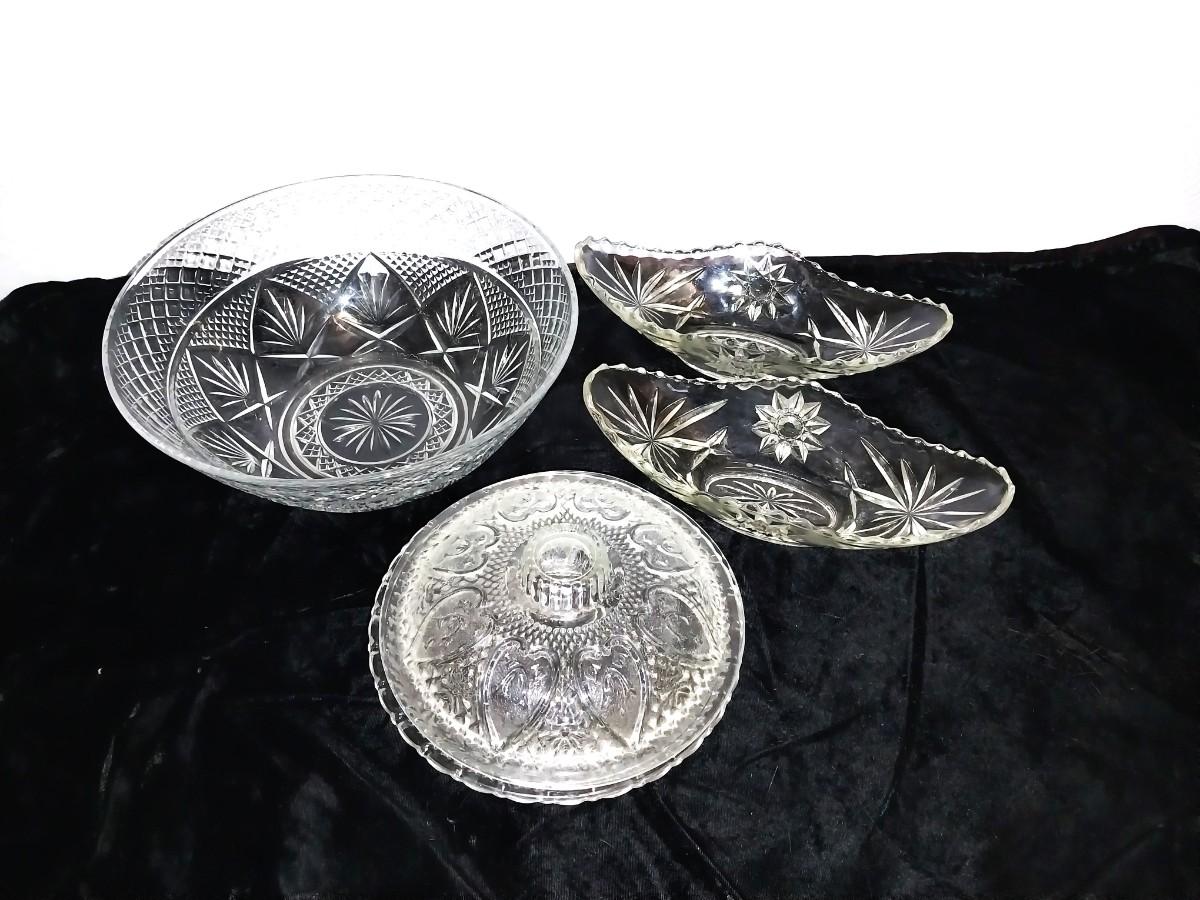 GLASS BOWL-CANDY DISH WITH LID AND TWO BANANA SPLIT DISHES