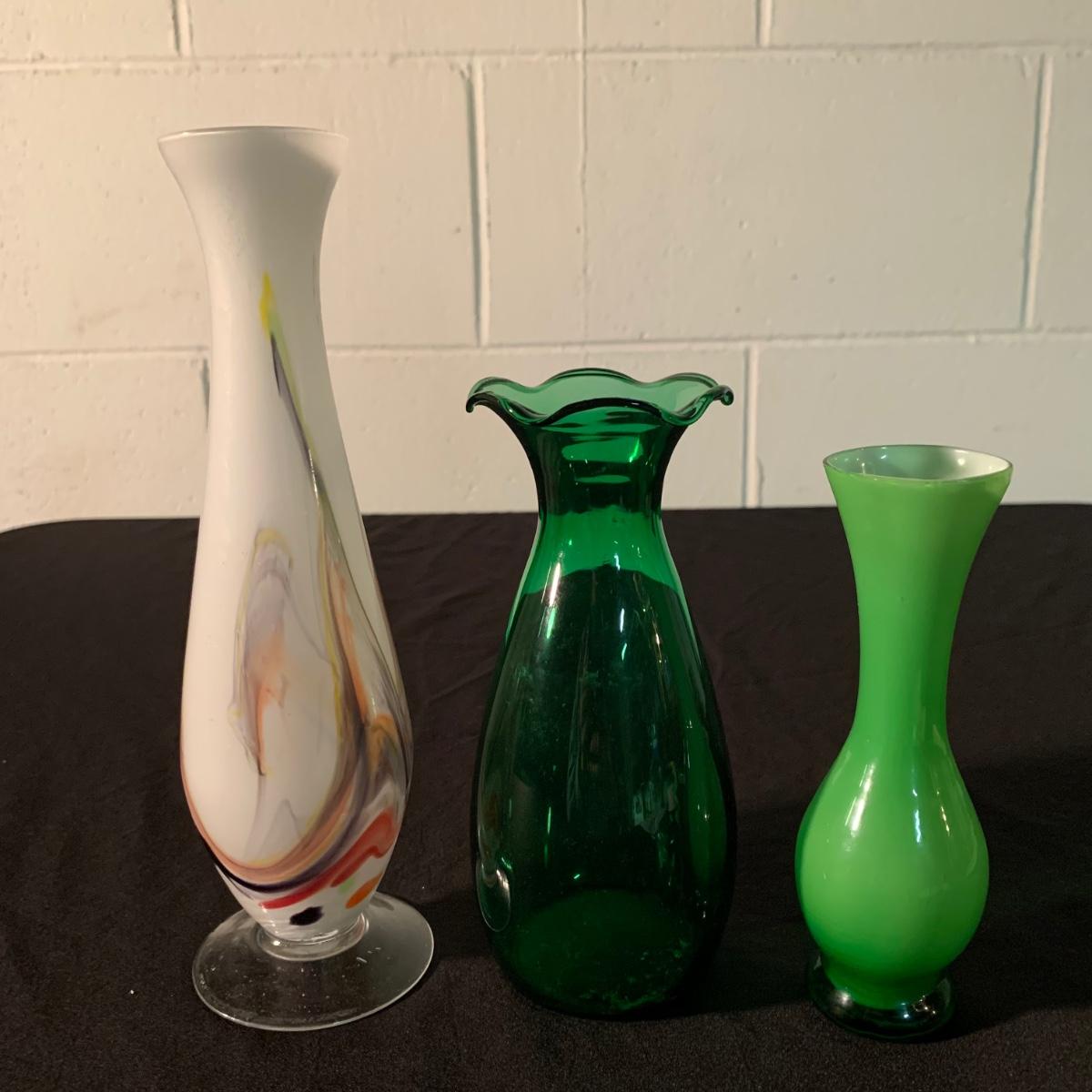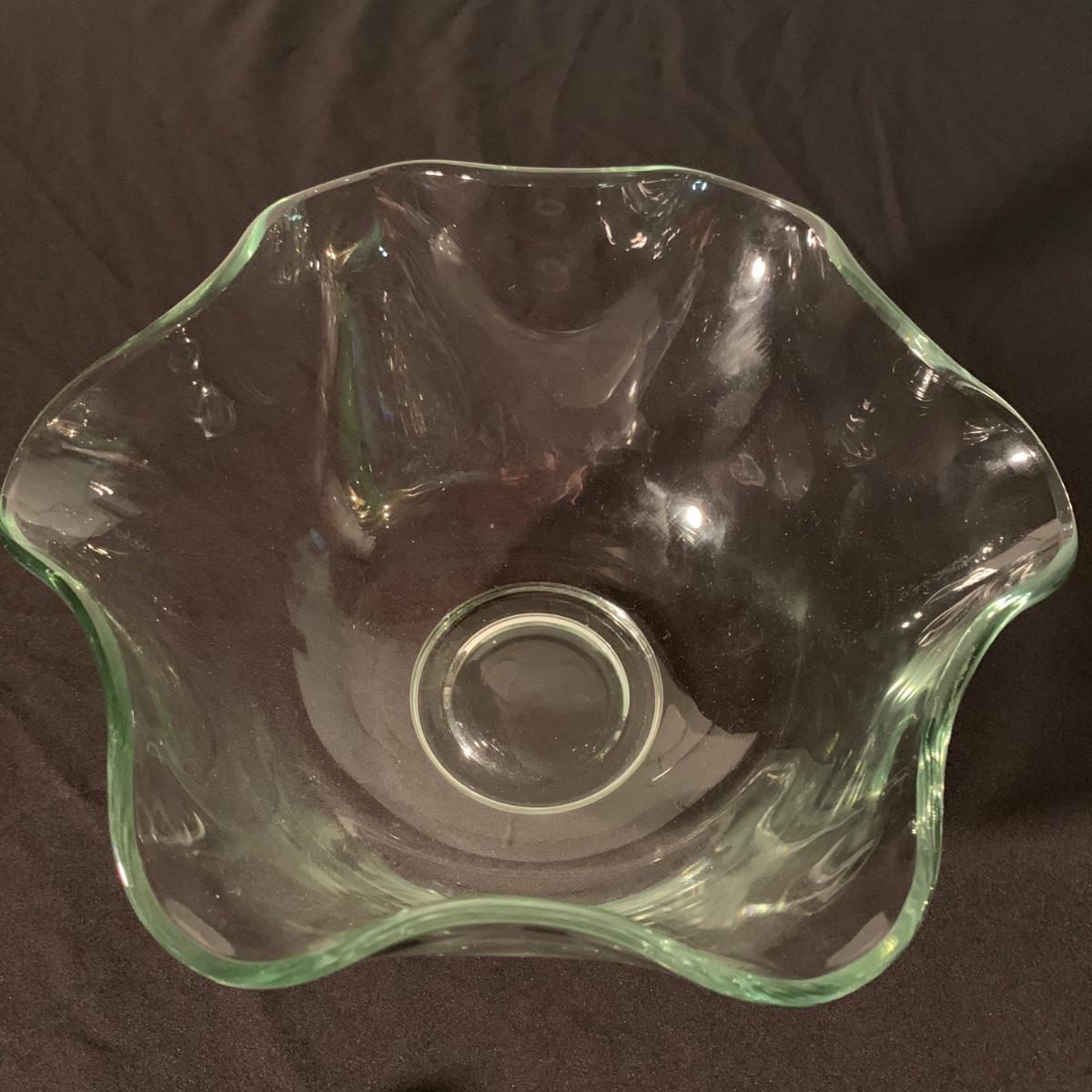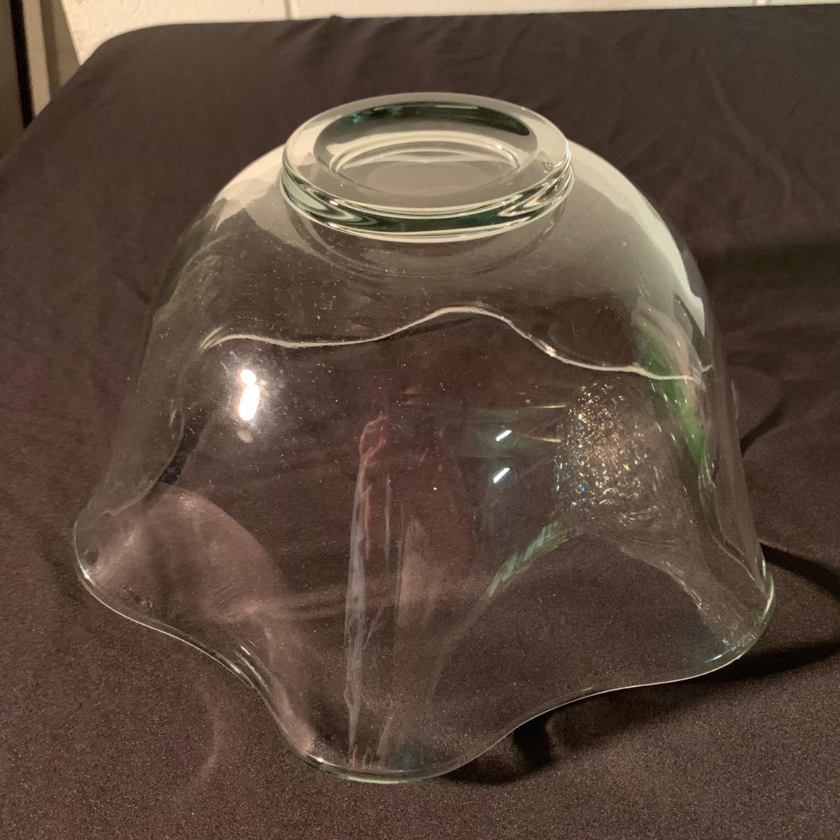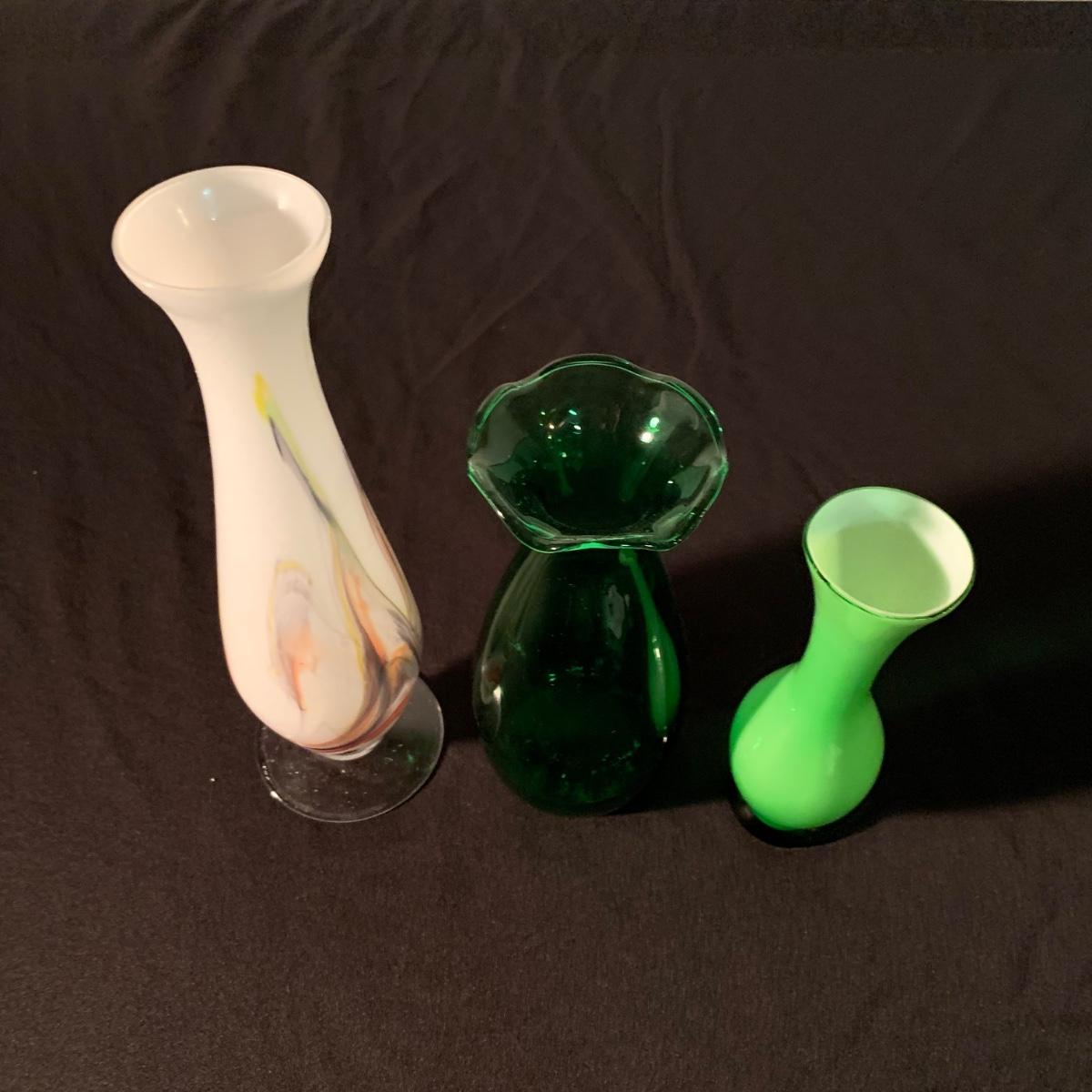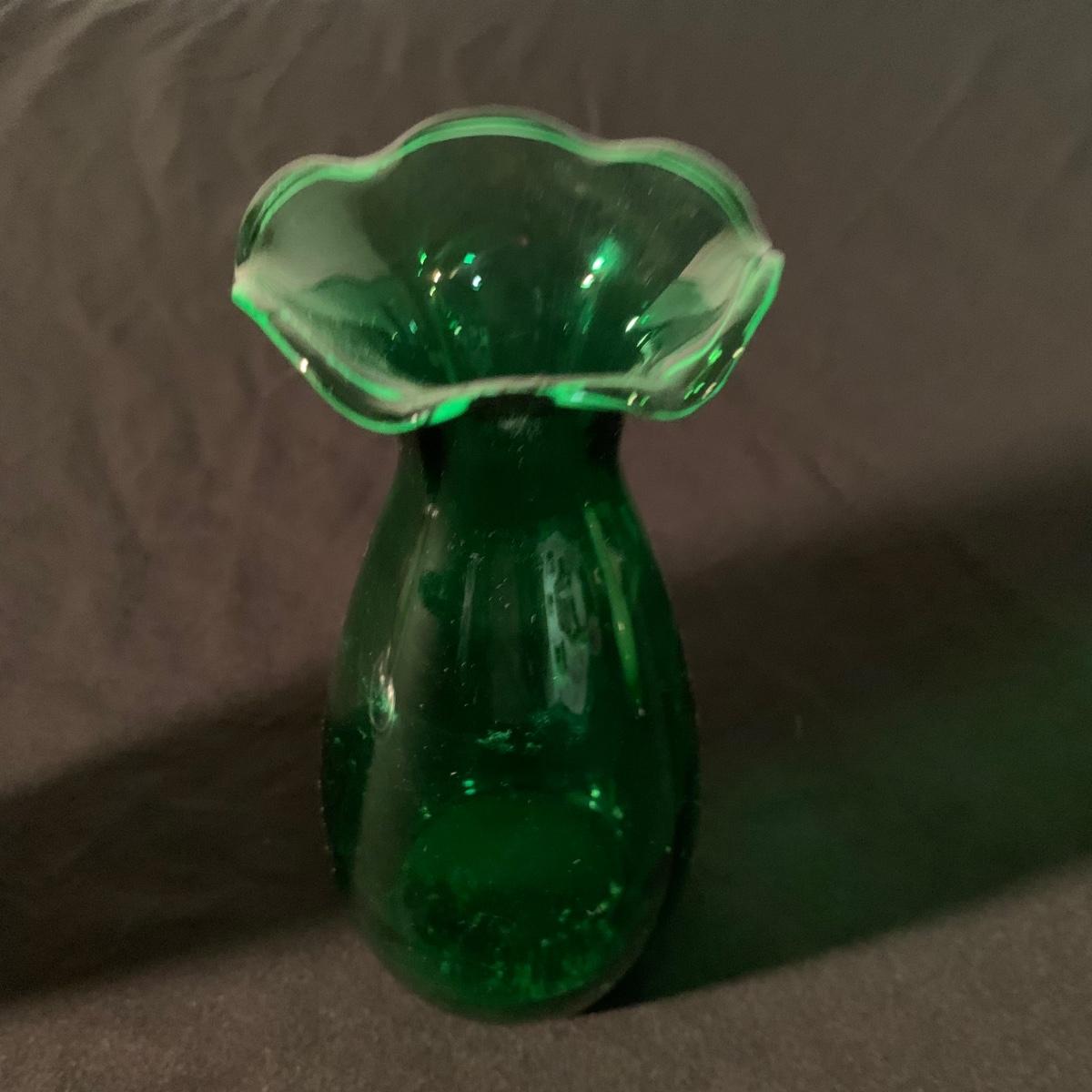 Six glass items in this collection. Two scalloped-edge bowls, one round vase, and three smaller vases. The larger clear glass bowl is 10”D x 5.25”H. All items are in very good condition. Shipping available.