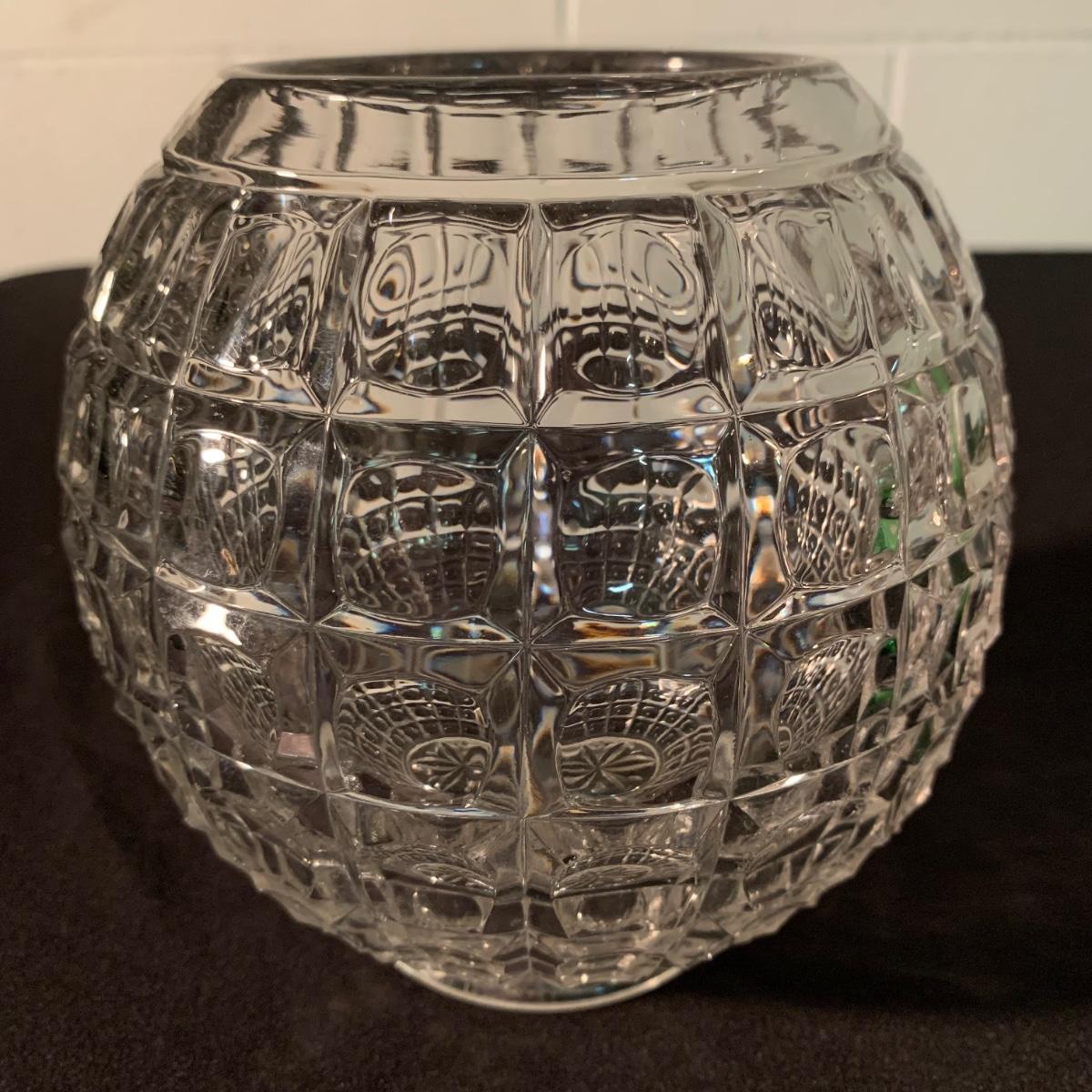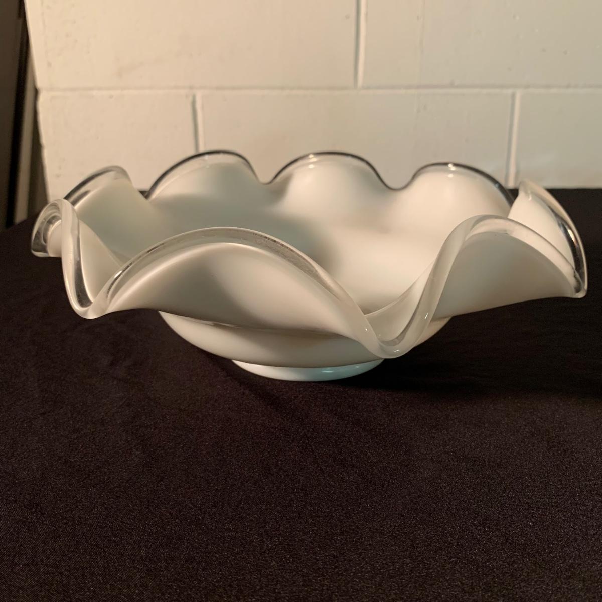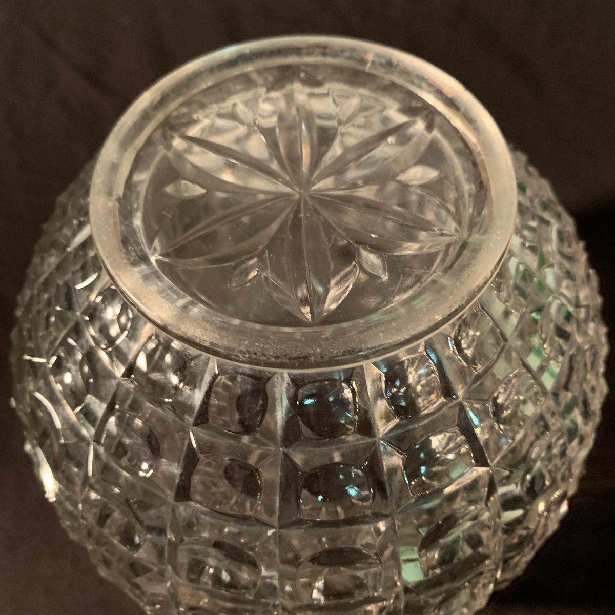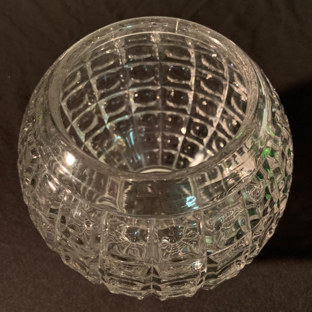 Six glass items in this collection. Two scalloped-edge bowls, one round vase, and three smaller vases. The larger clear glass bowl is 10”D x 5.25”H. All items are in very good condition. Shipping available.