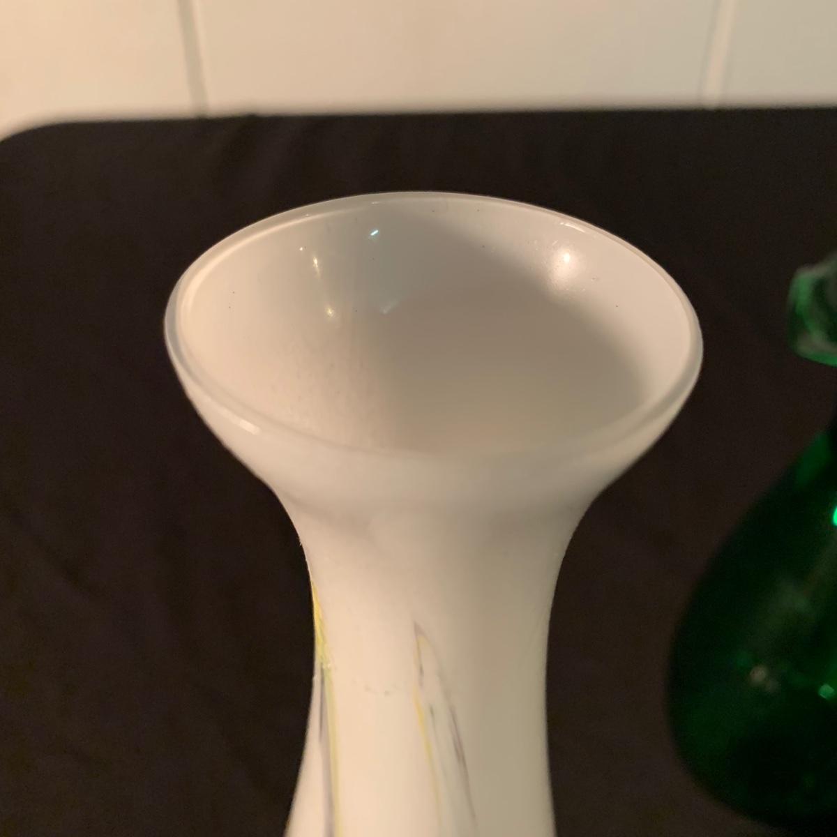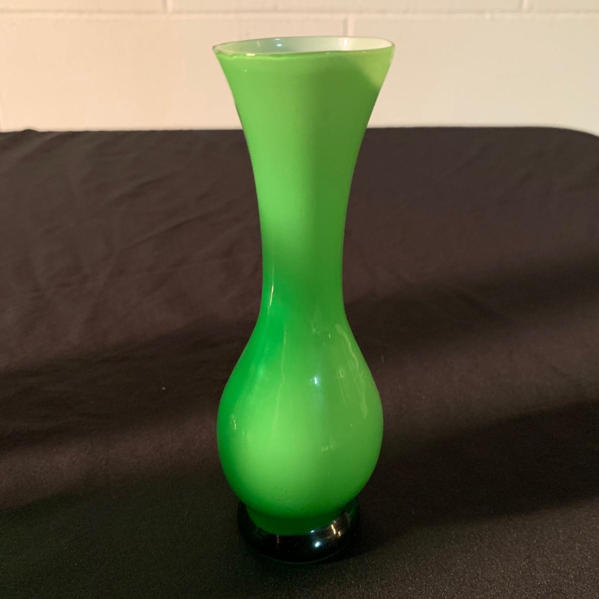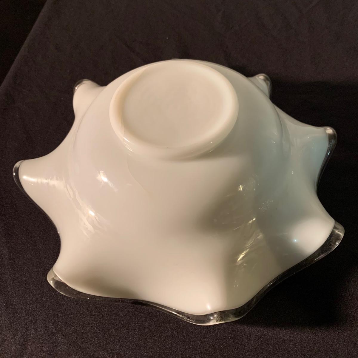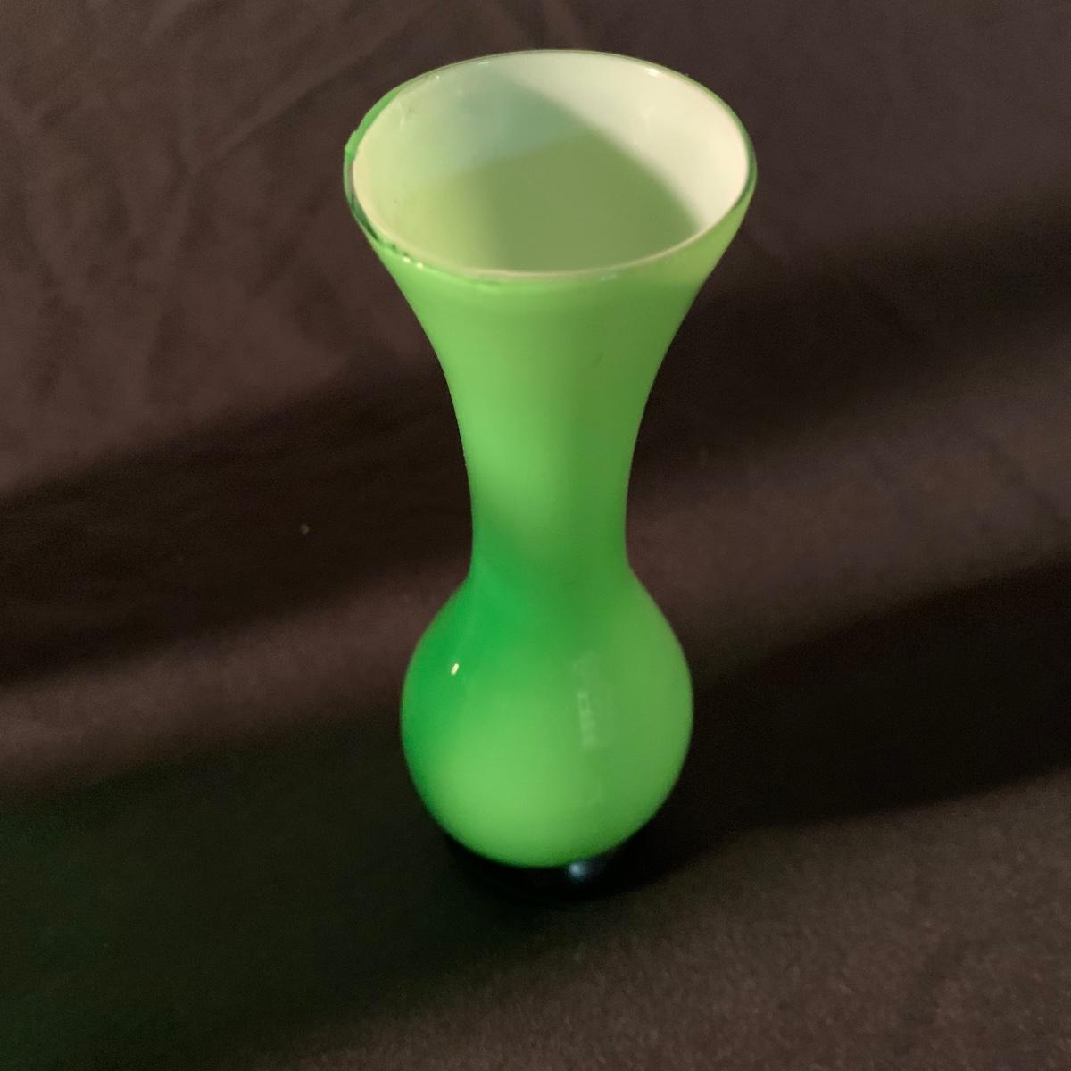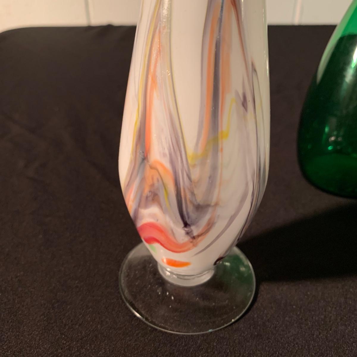 Six glass items in this collection. Two scalloped-edge bowls, one round vase, and three smaller vases. The larger clear glass bowl is 10”D x 5.25”H. All items are in very good condition. Shipping available.