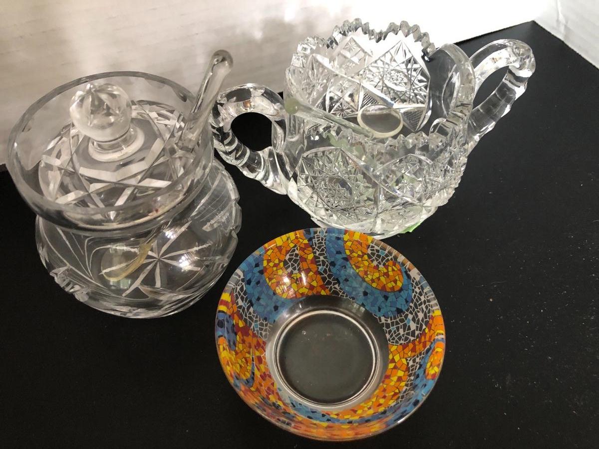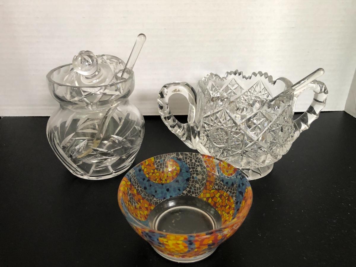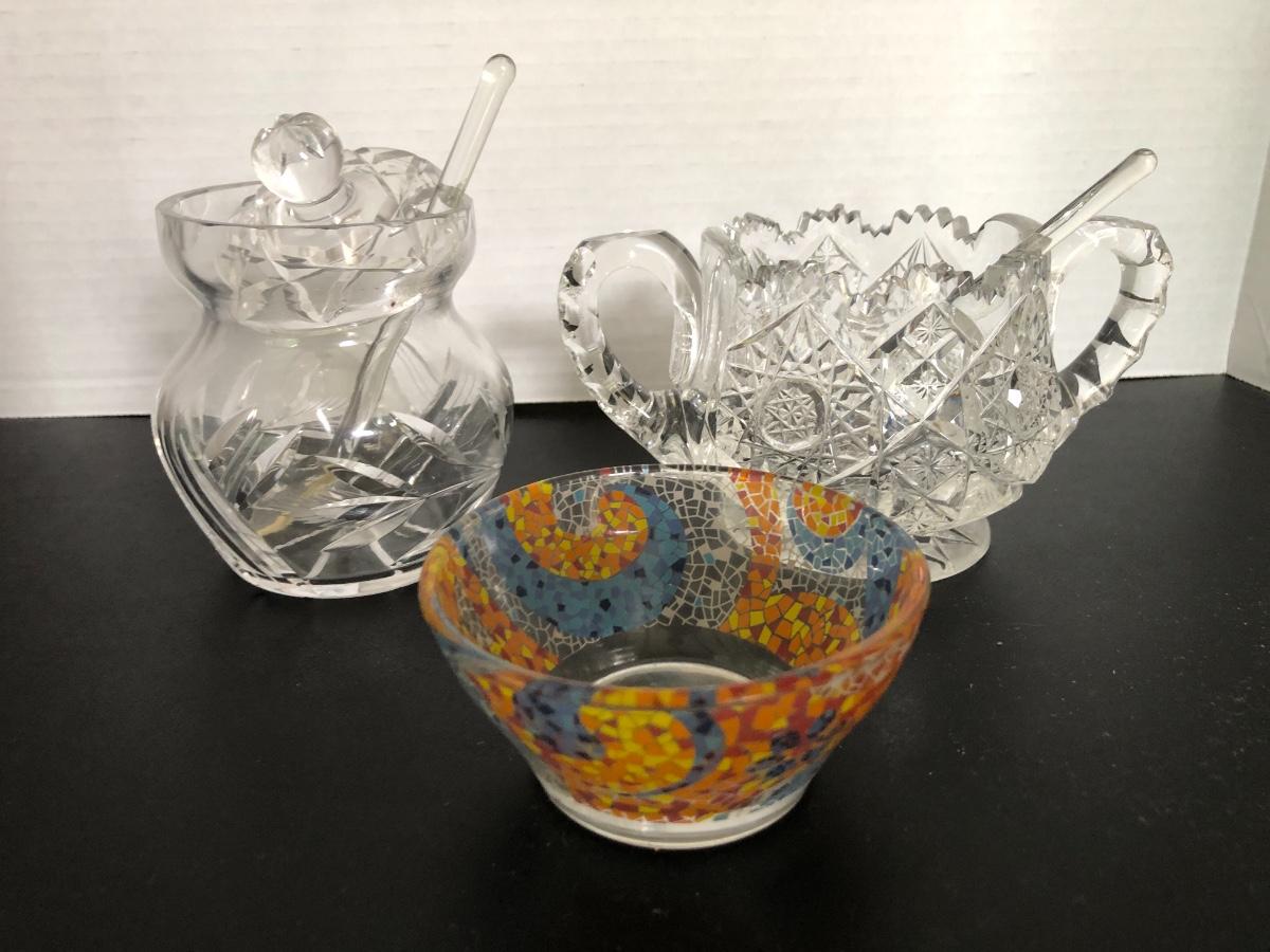 Mosaic Glass Bowl/Sugar Bowls/Spoons -Lot 217
