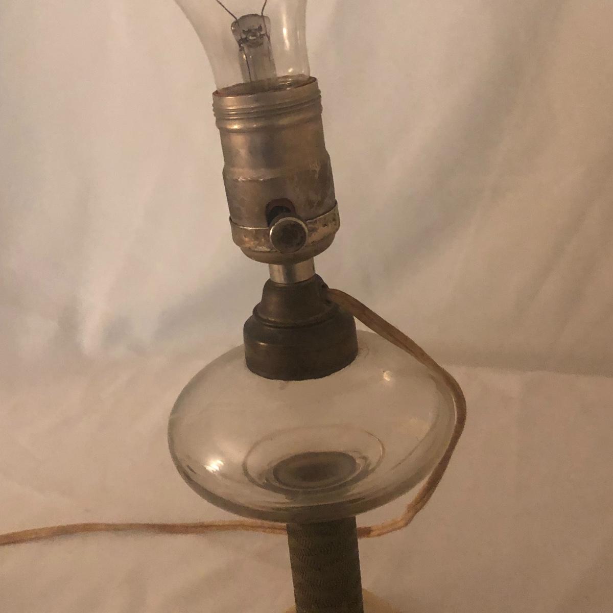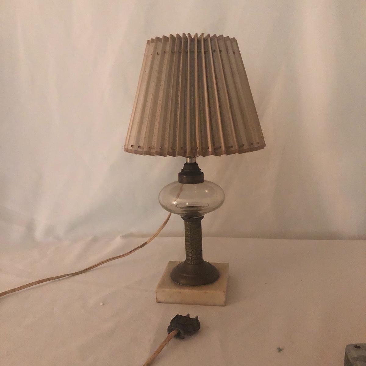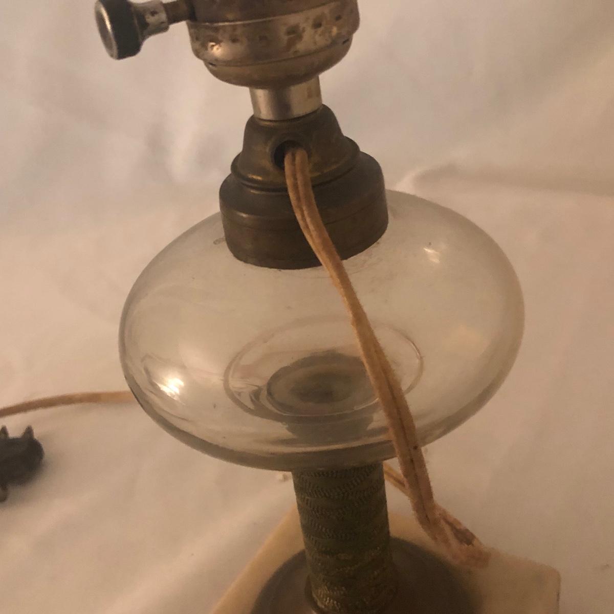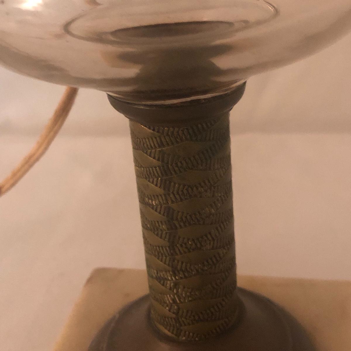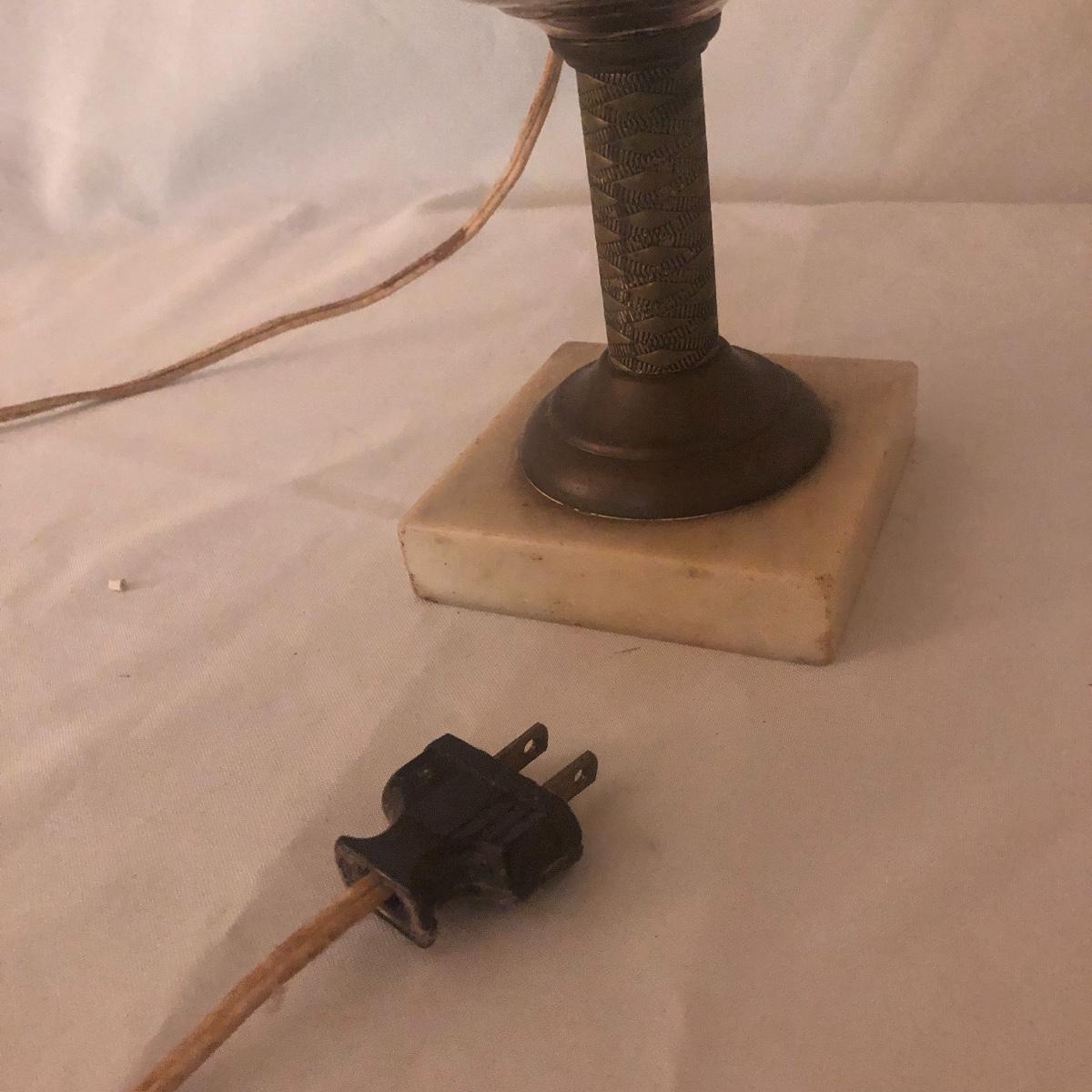 This lamp stands 15” tall. It has a marble base and brass like and glass stem. It operates when plugged in. Shipping Available.