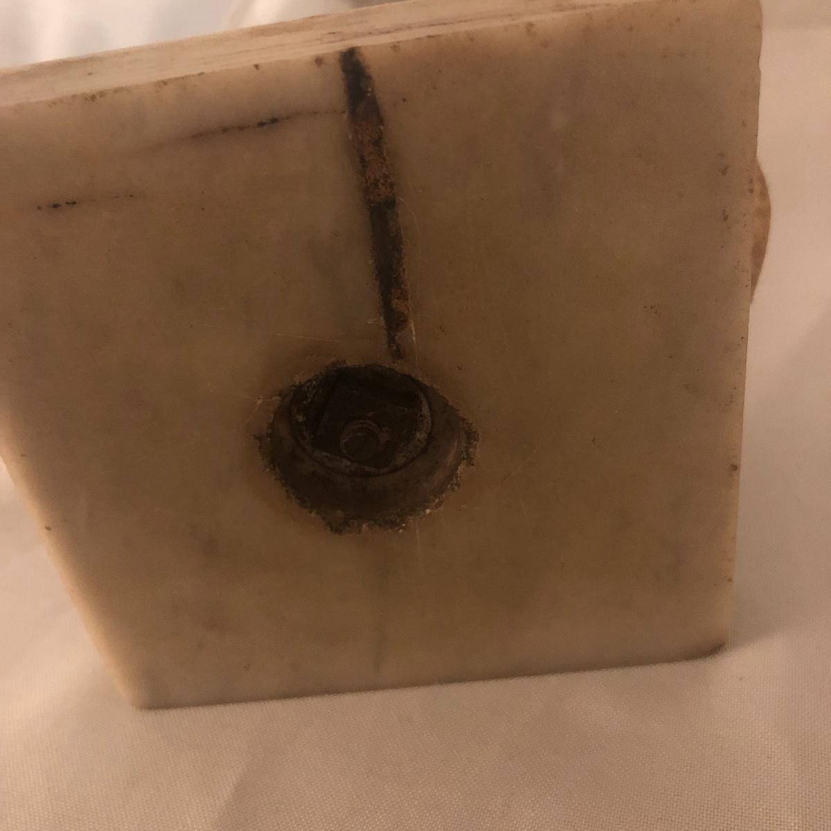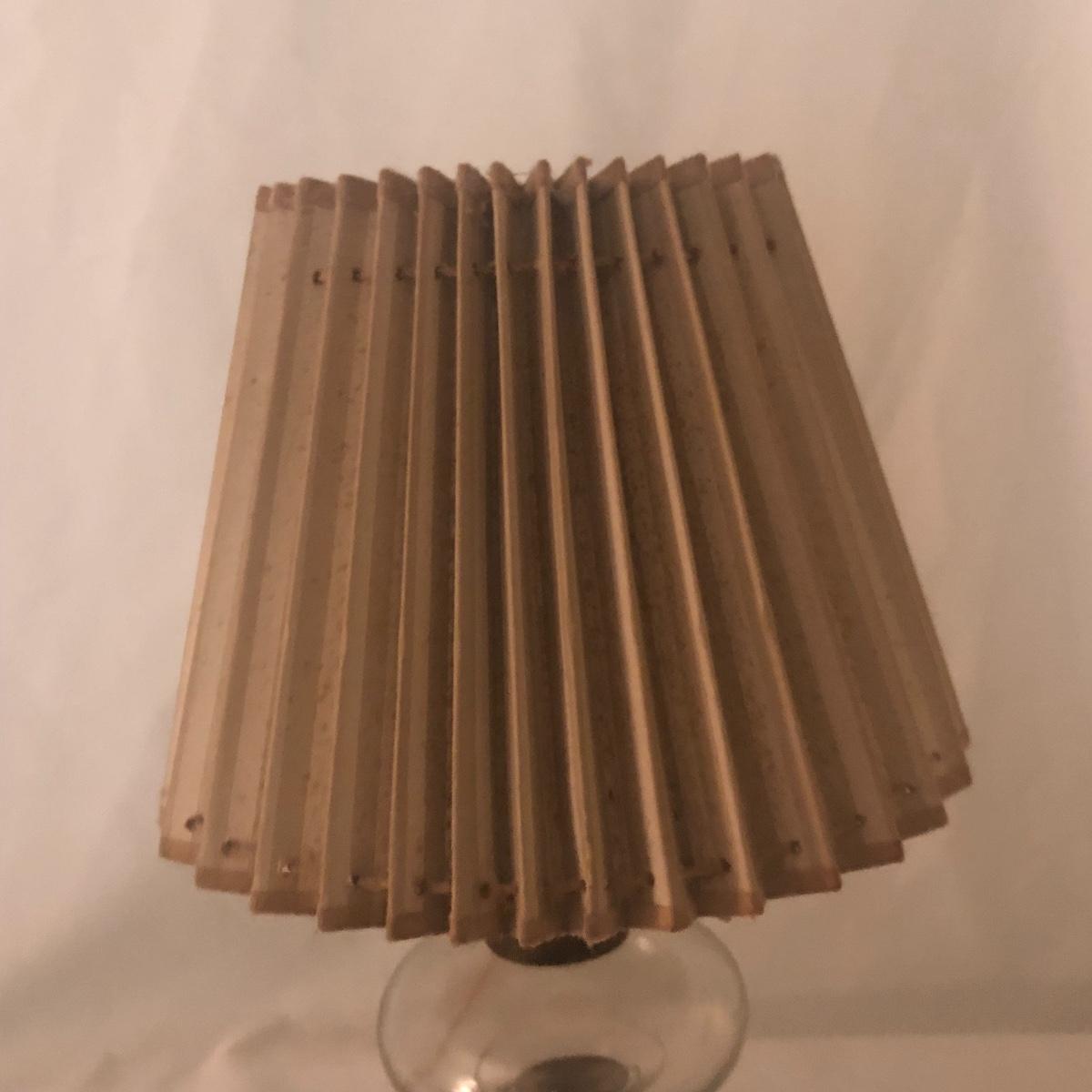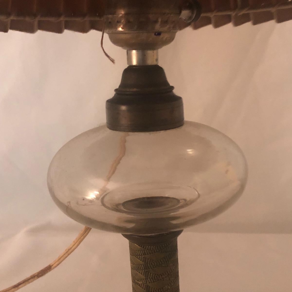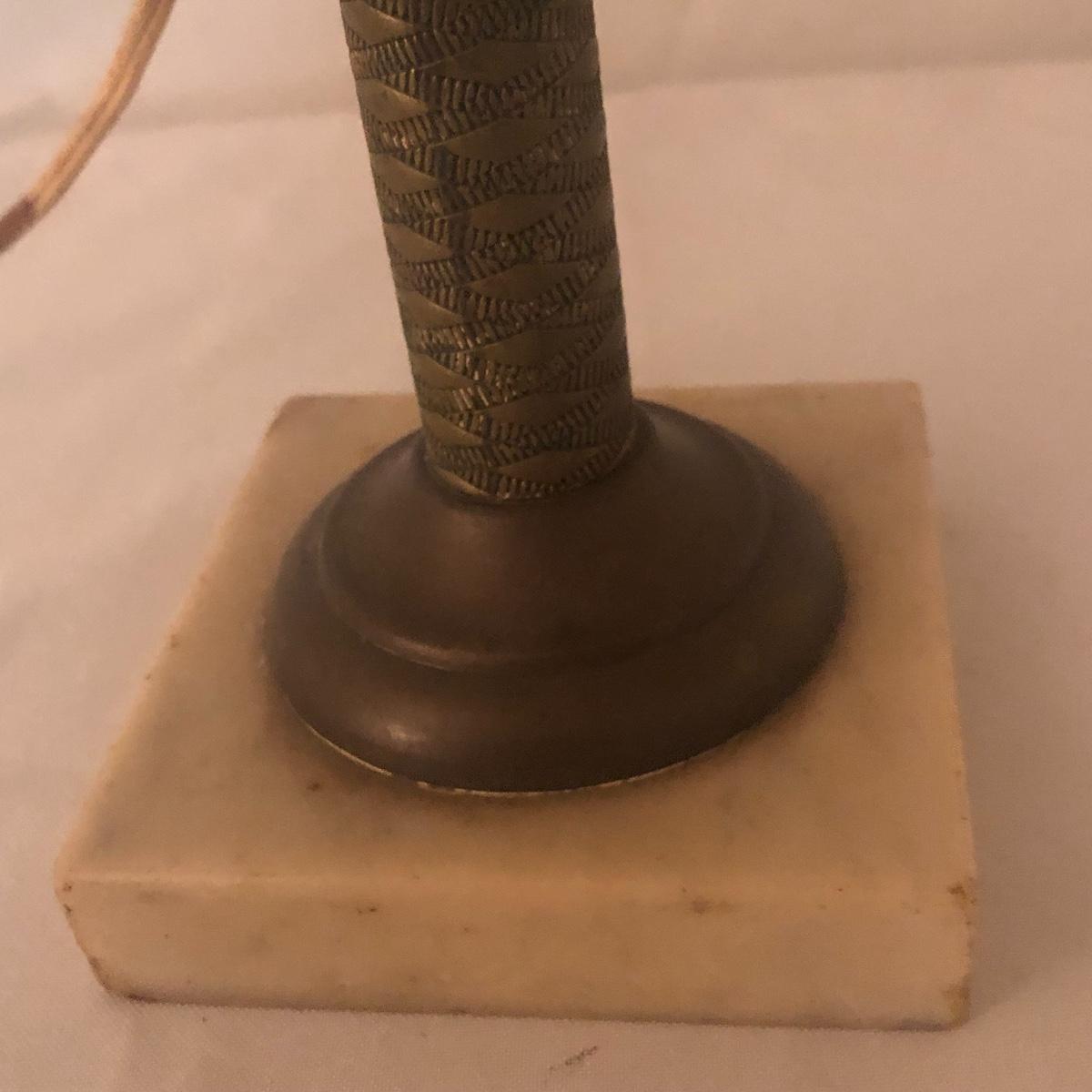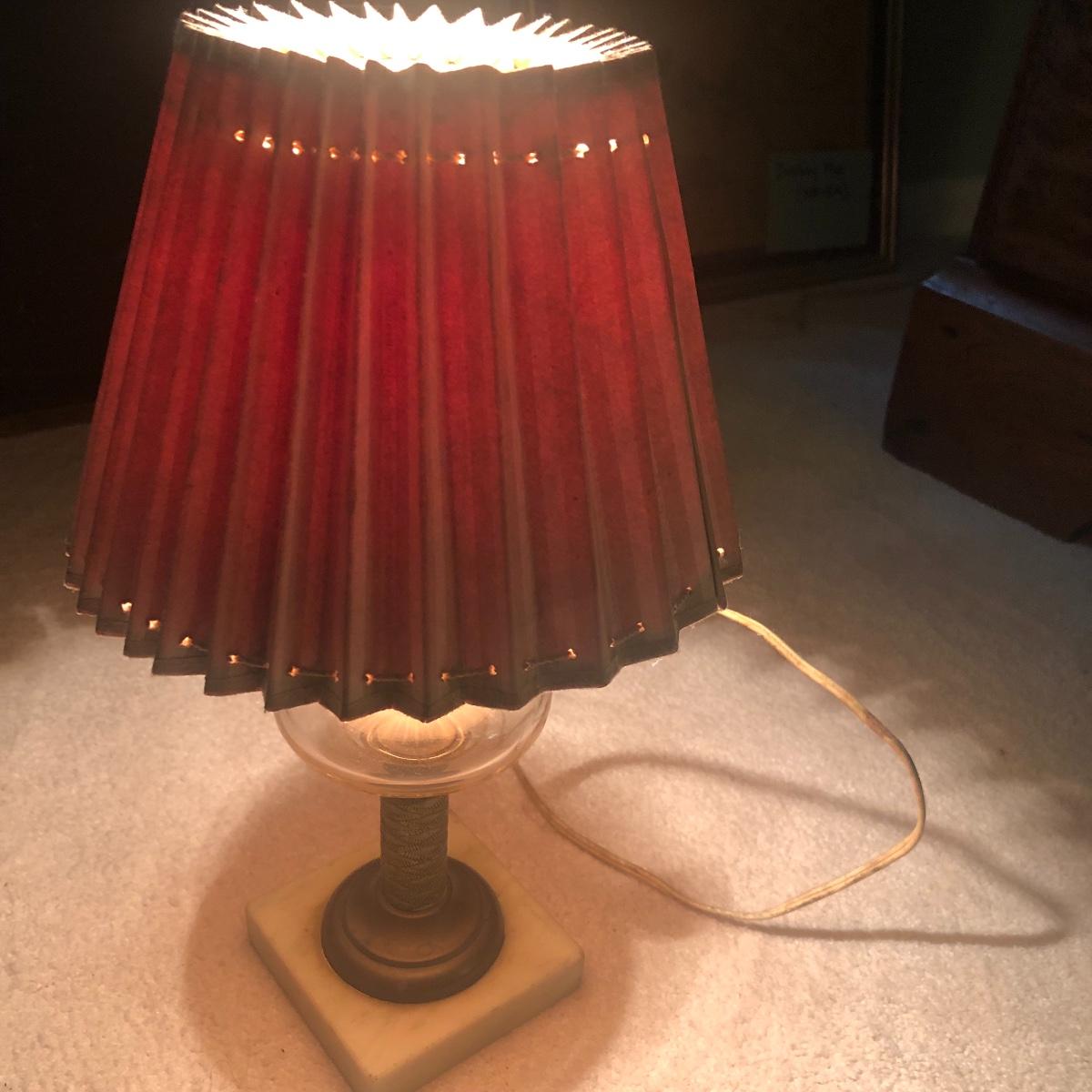 This lamp stands 15” tall. It has a marble base and brass like and glass stem. It operates when plugged in. Shipping Available.