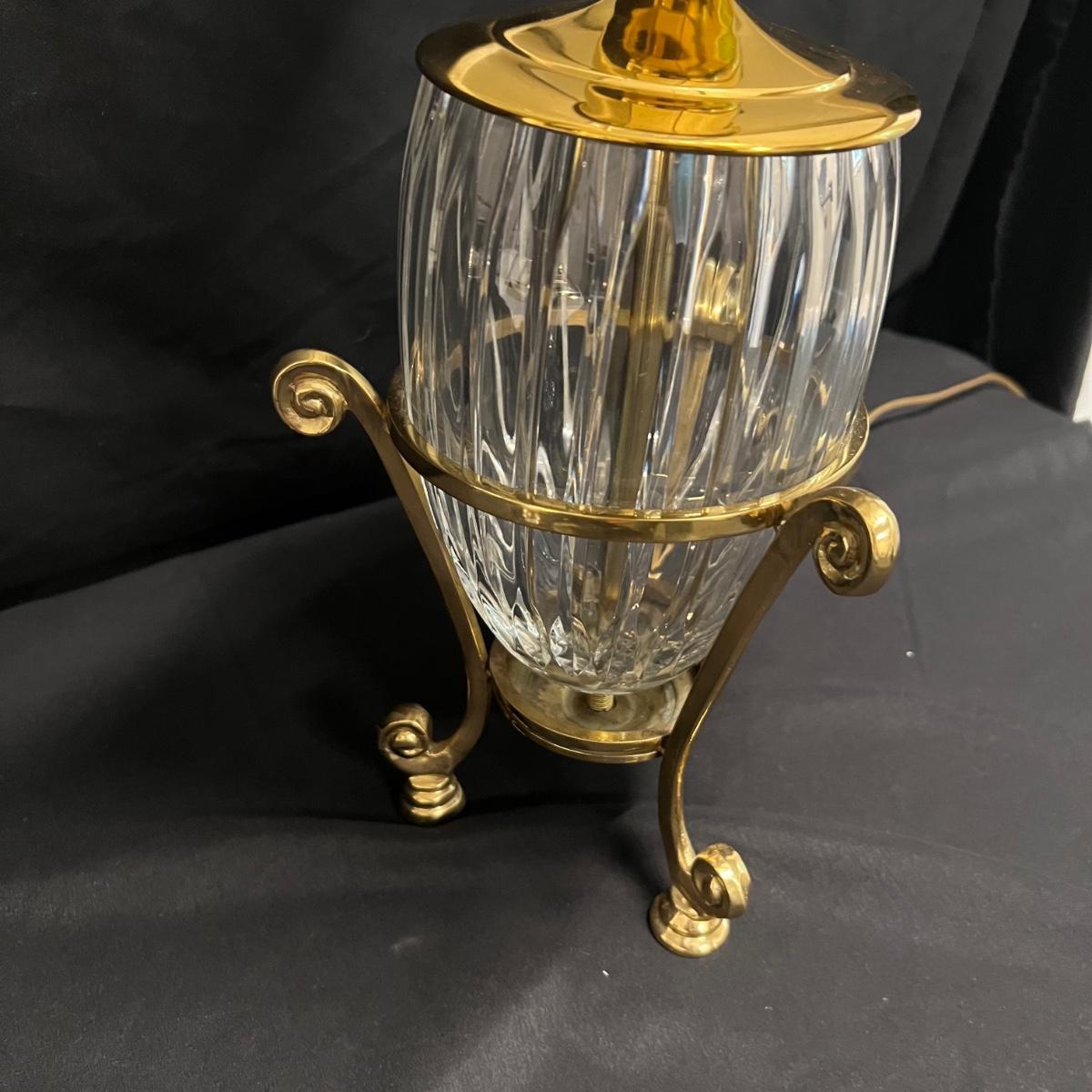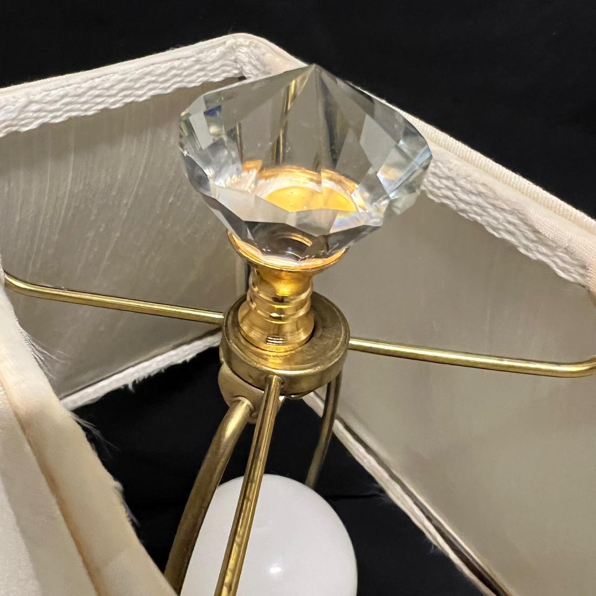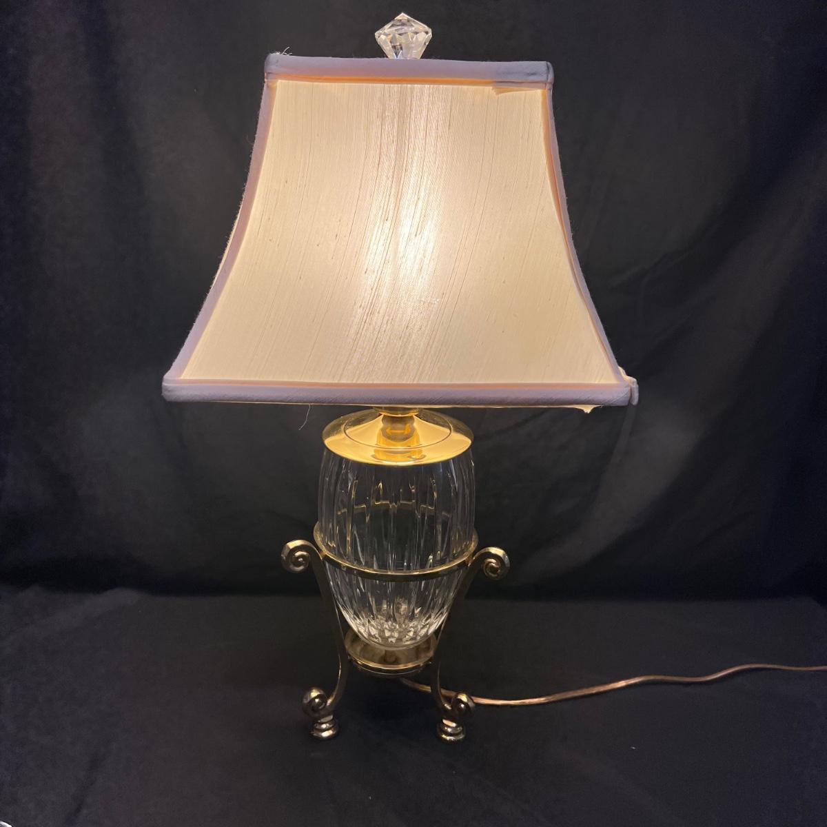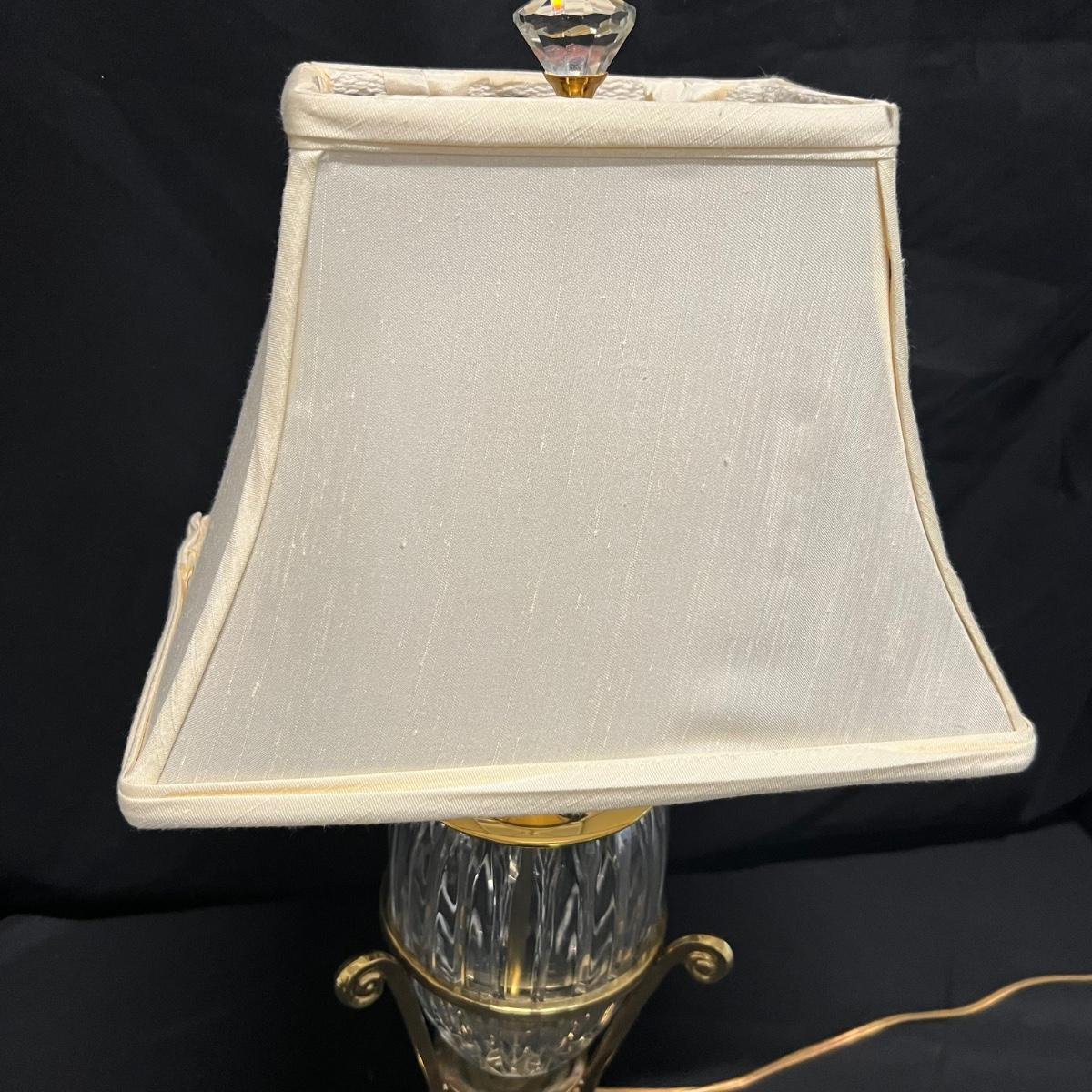This attractive lamp has an on/off switch. The body is a glass vase shape within a solid brass frame. Its shade is an ivory color; note one small mark shown in an image. We have paired this lamp with an apple shaped glass paperweight and a quartz clock. The clock runs on battery and could not be tested due to no battery.