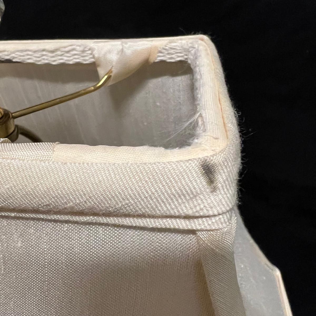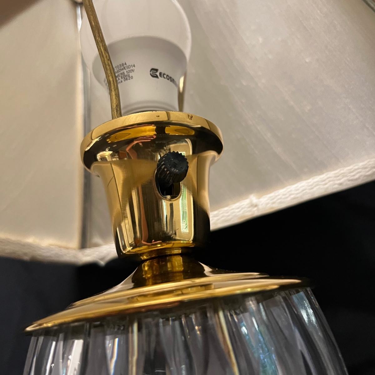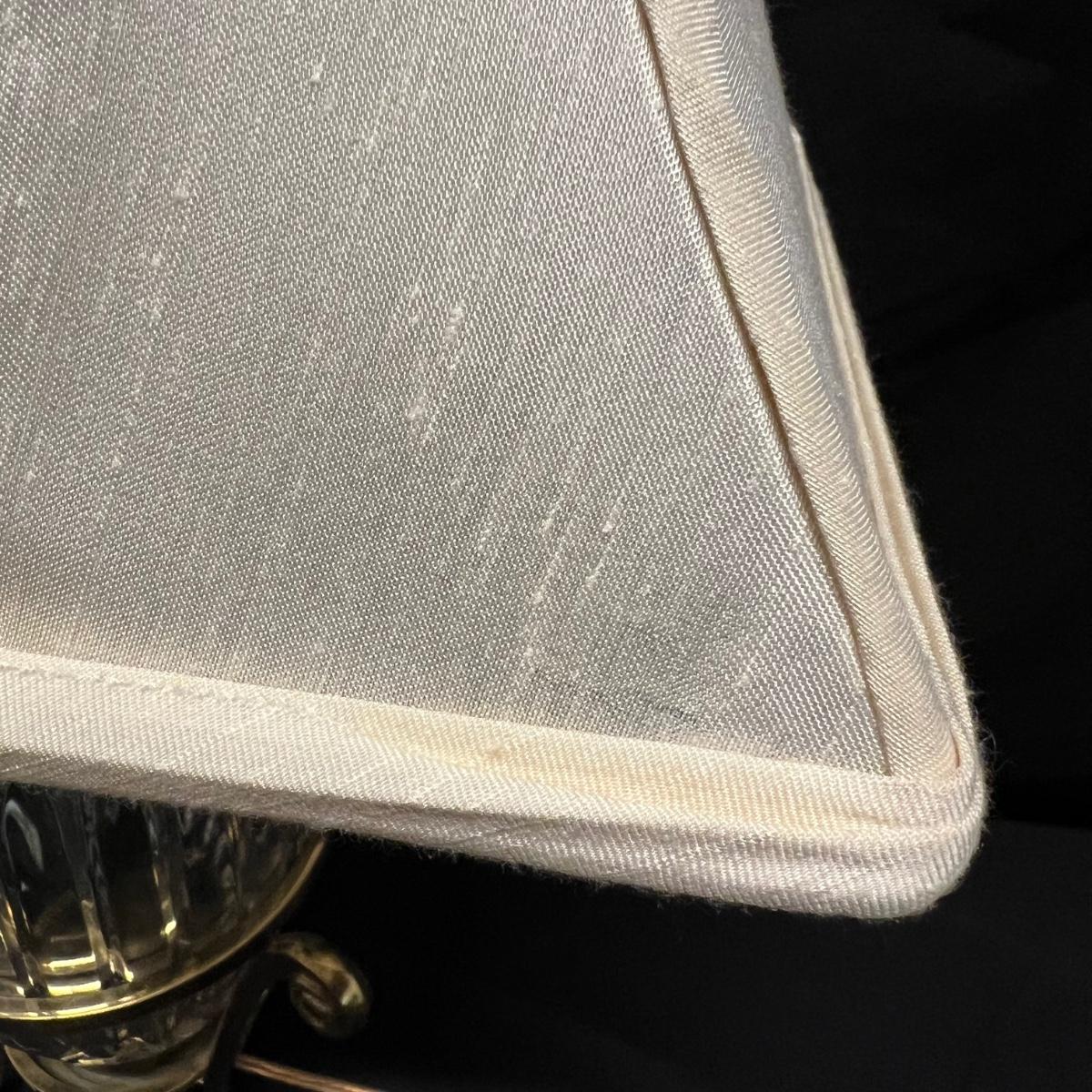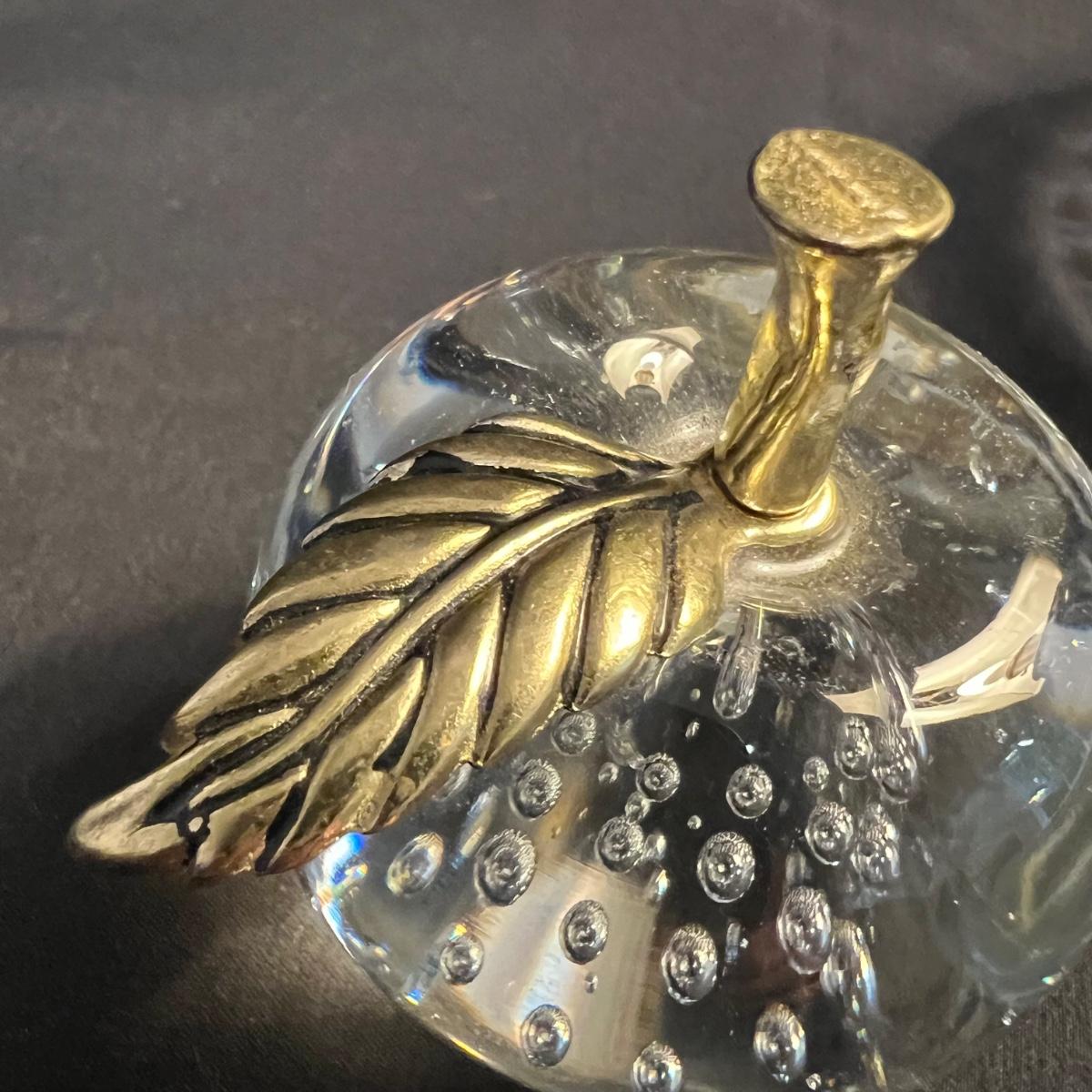 This attractive lamp has an on/off switch. The body is a glass vase shape within a solid brass frame. Its shade is an ivory color; note one small mark shown in an image. We have paired this lamp with an apple shaped glass paperweight and a quartz clock. The clock runs on battery and could not be tested due to no battery.