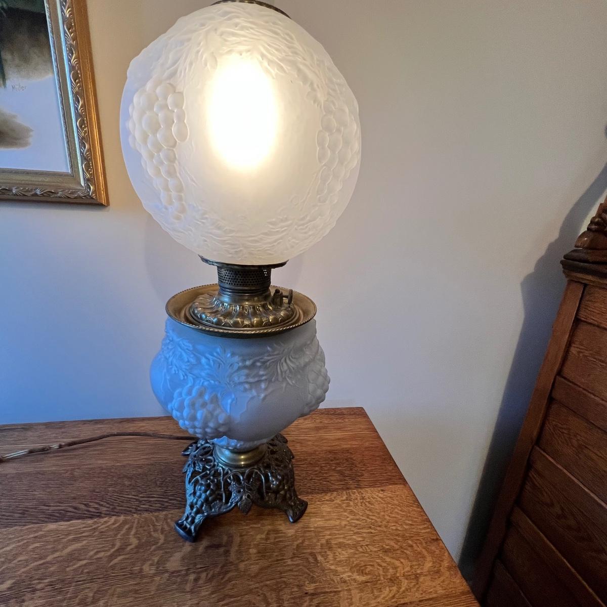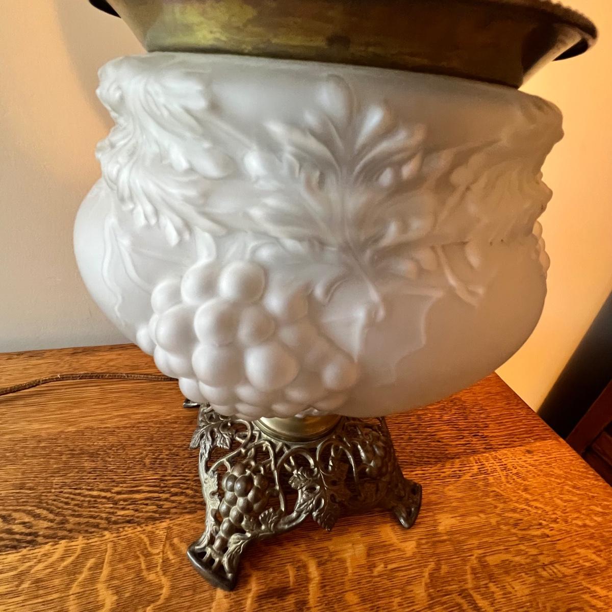 Lovely old Victorian style frosted glass lamp with grape motif. Base and middle section appear to be brass. Single on/off switch is located under the inner glass insert so switching it on or off isn’t ideal. The cable is original and worn so needs replacing.
