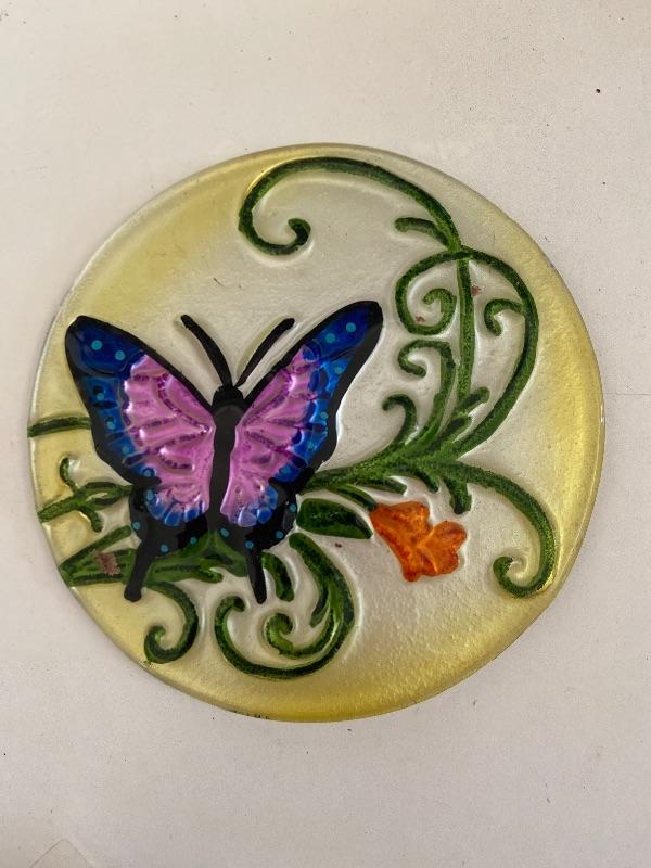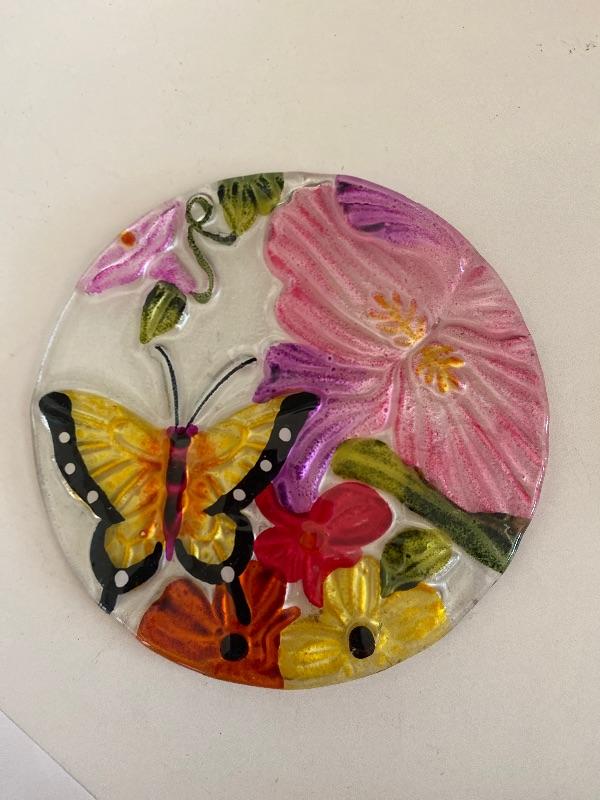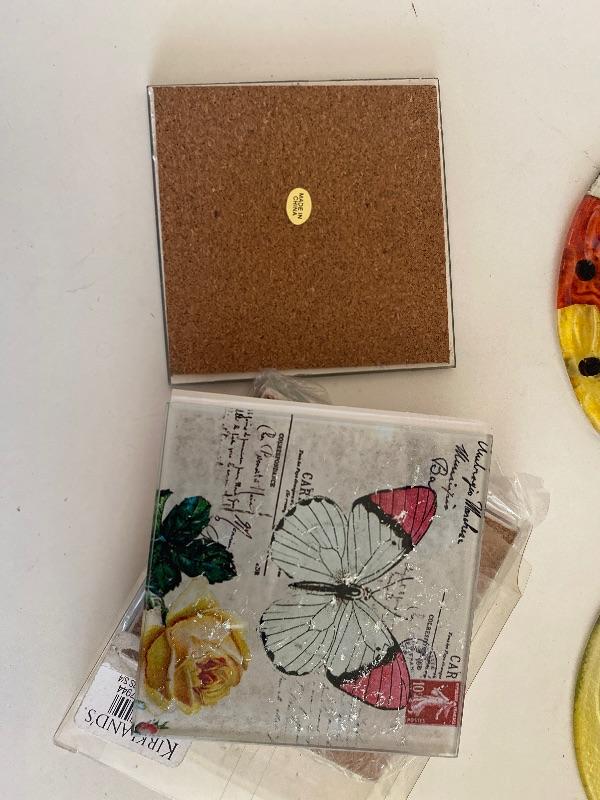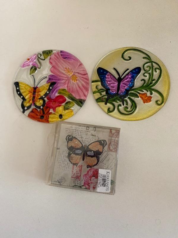 Two decorative butterfly plates made from clear painted glass. Set of 4 coasters. Glass with cork bottoms different image on each.