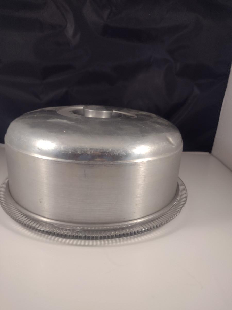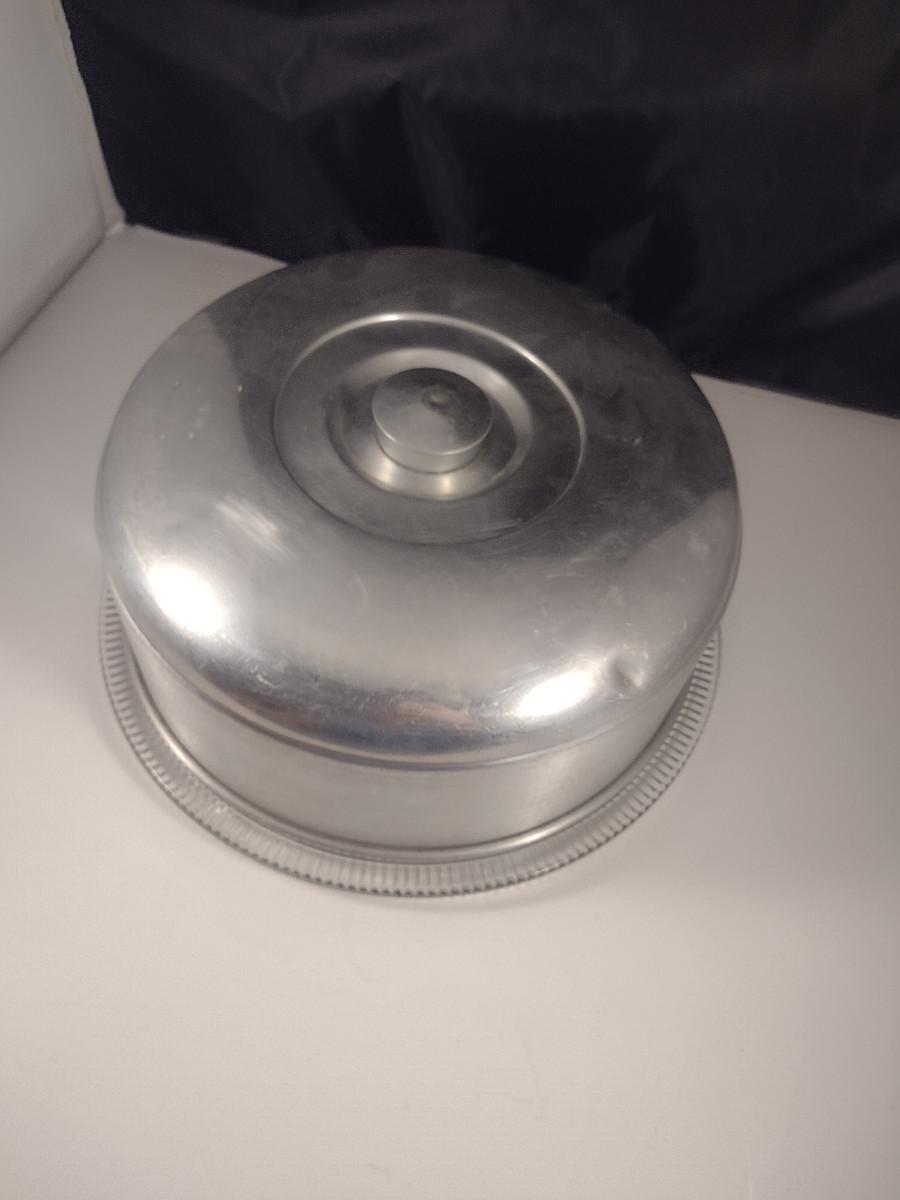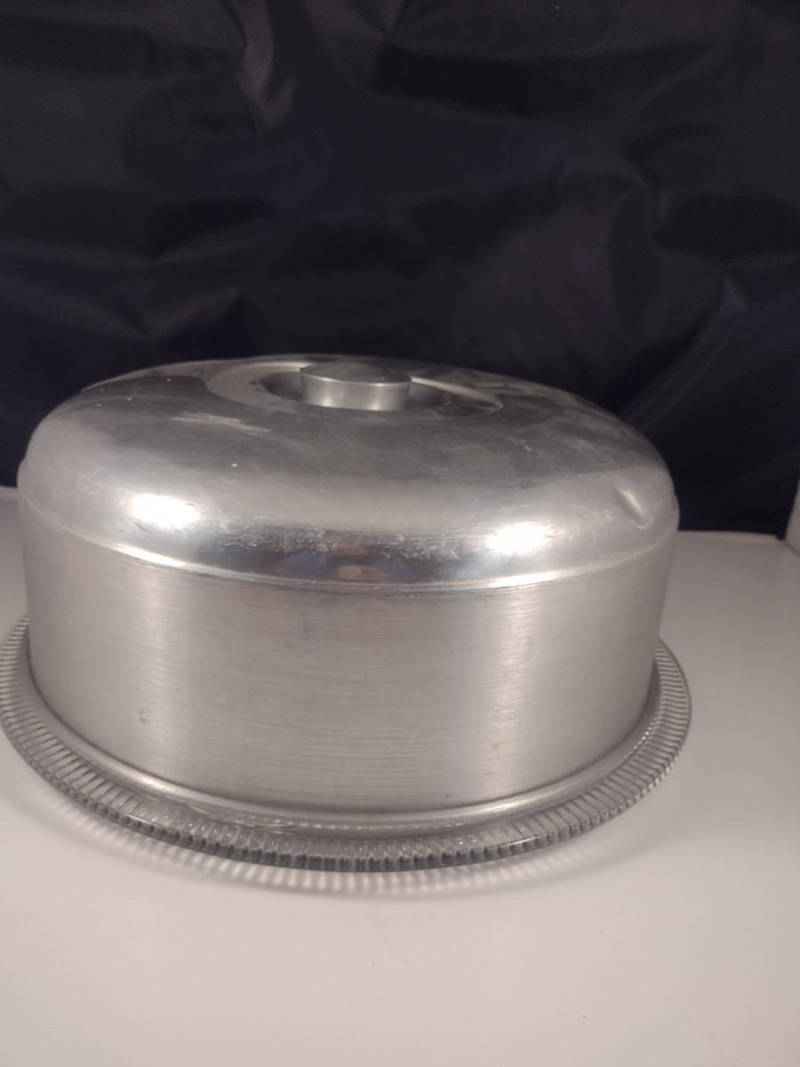 Glass Cake Plate with Aluminum Dome Cover. Cover has some light denting- please see all pictures.