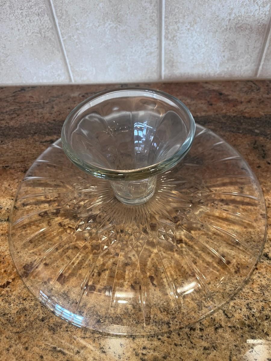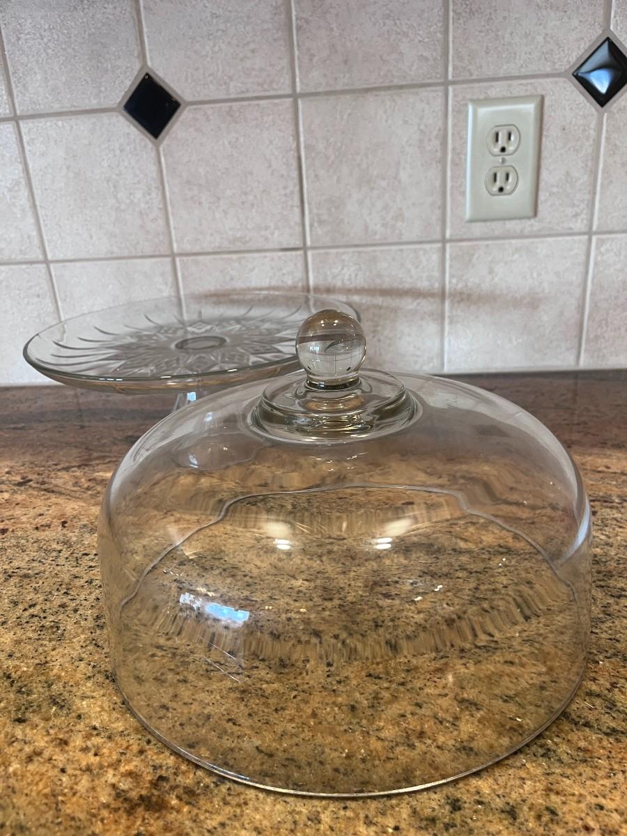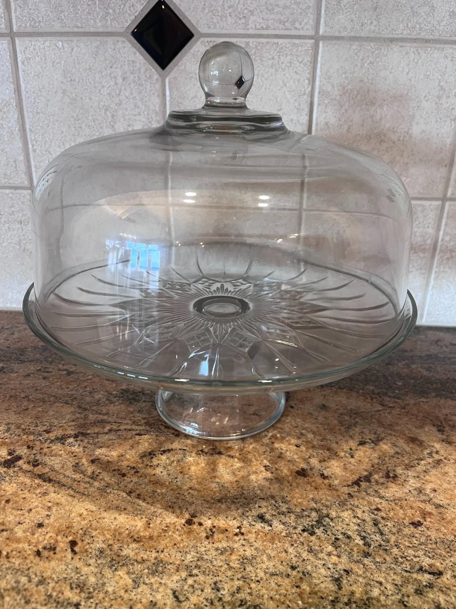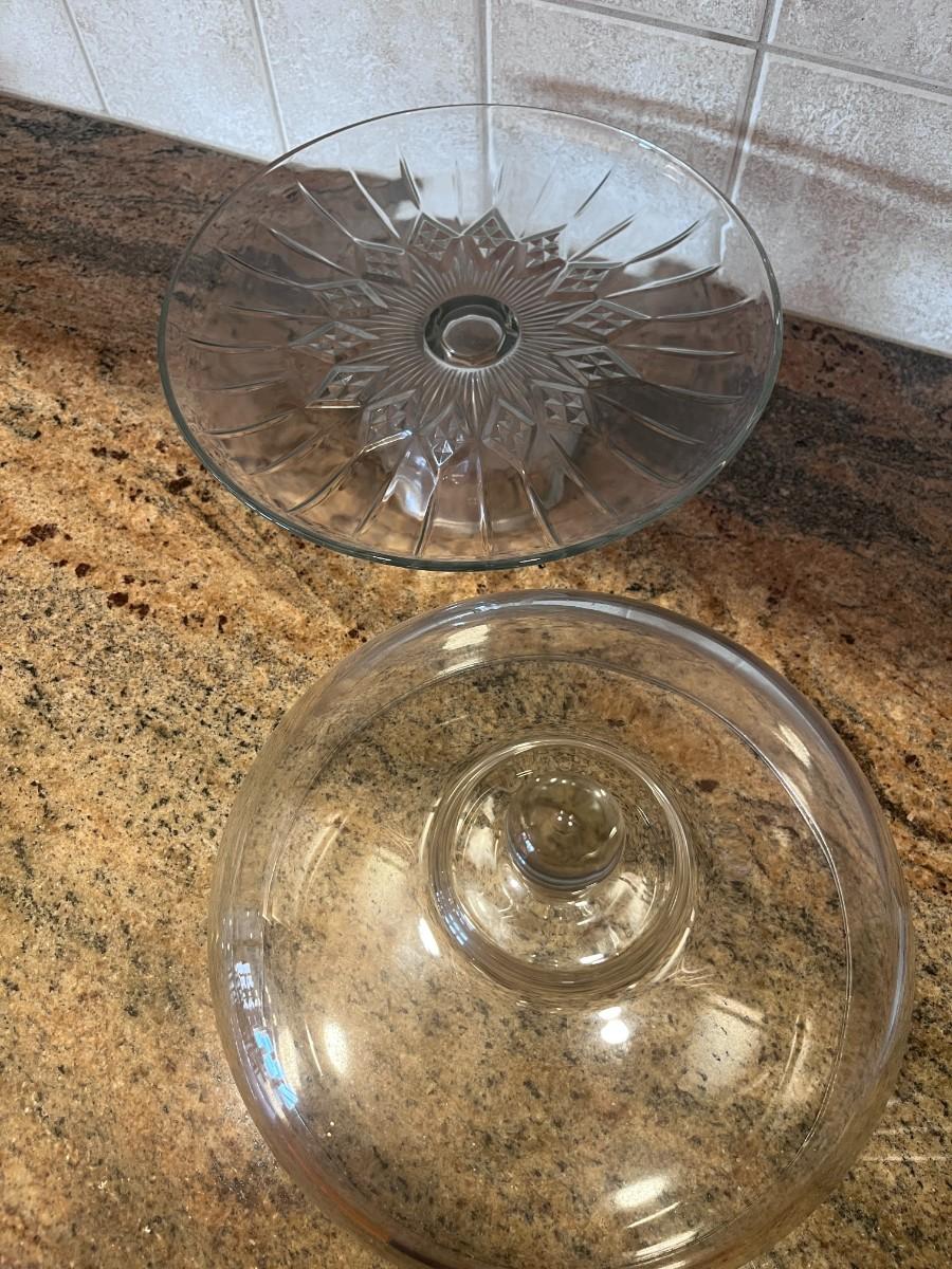 GLASS CAKE PLATE WITH DOME LID AND A GLASS KNIFE