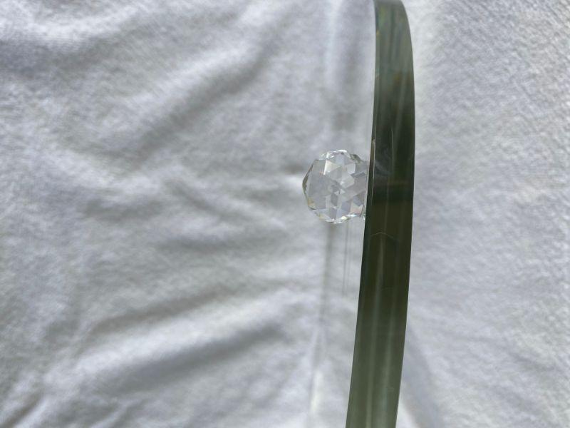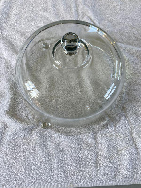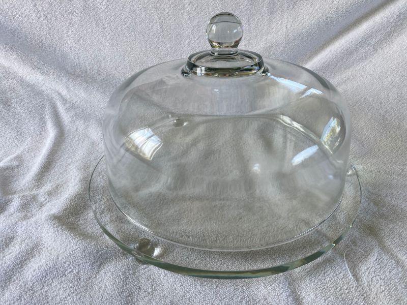 Clear glass cake server with faceted glass ball feet measures 13" round
