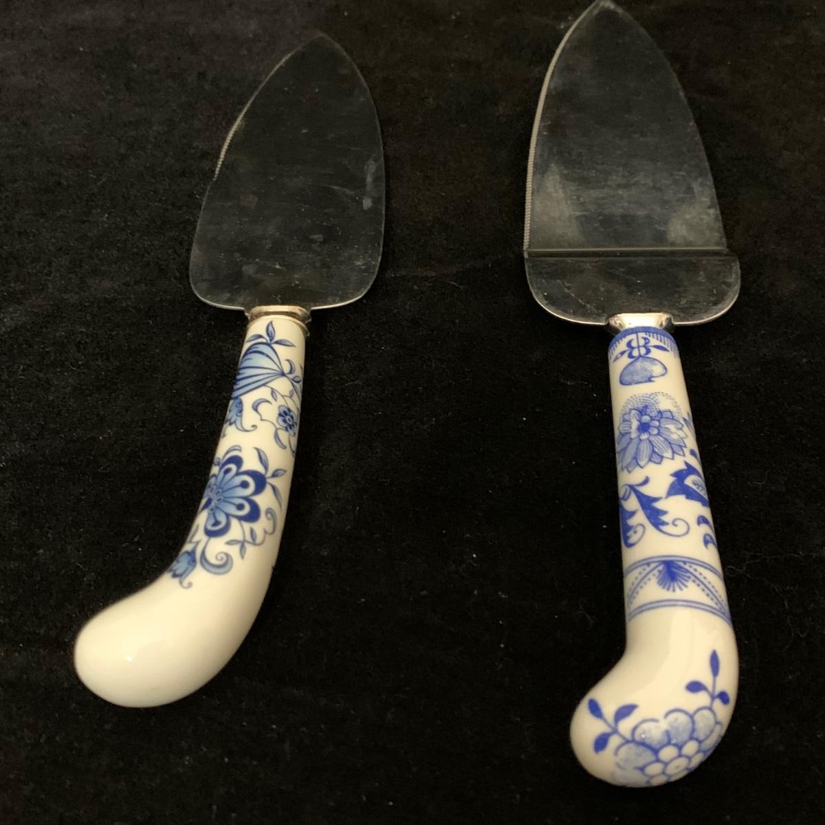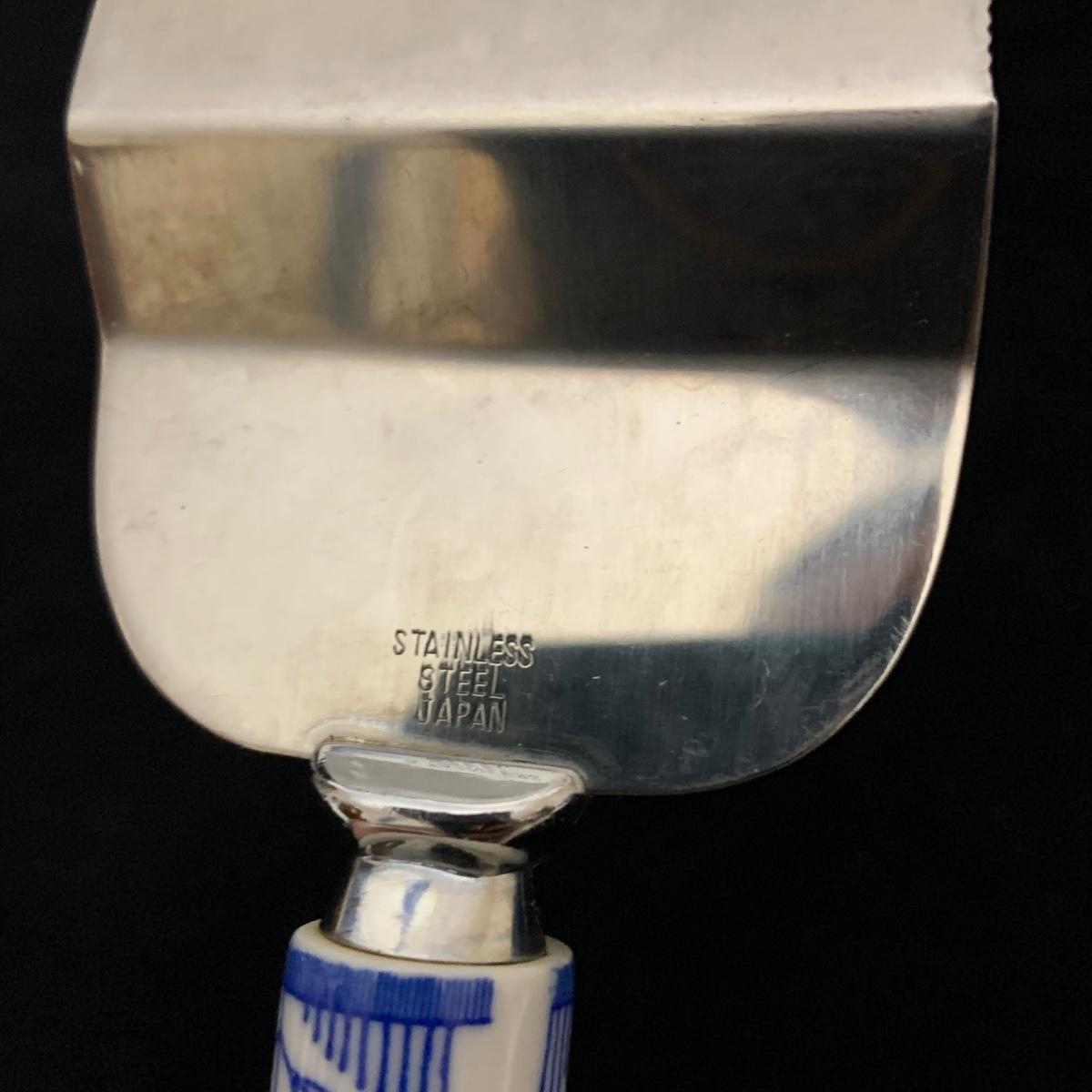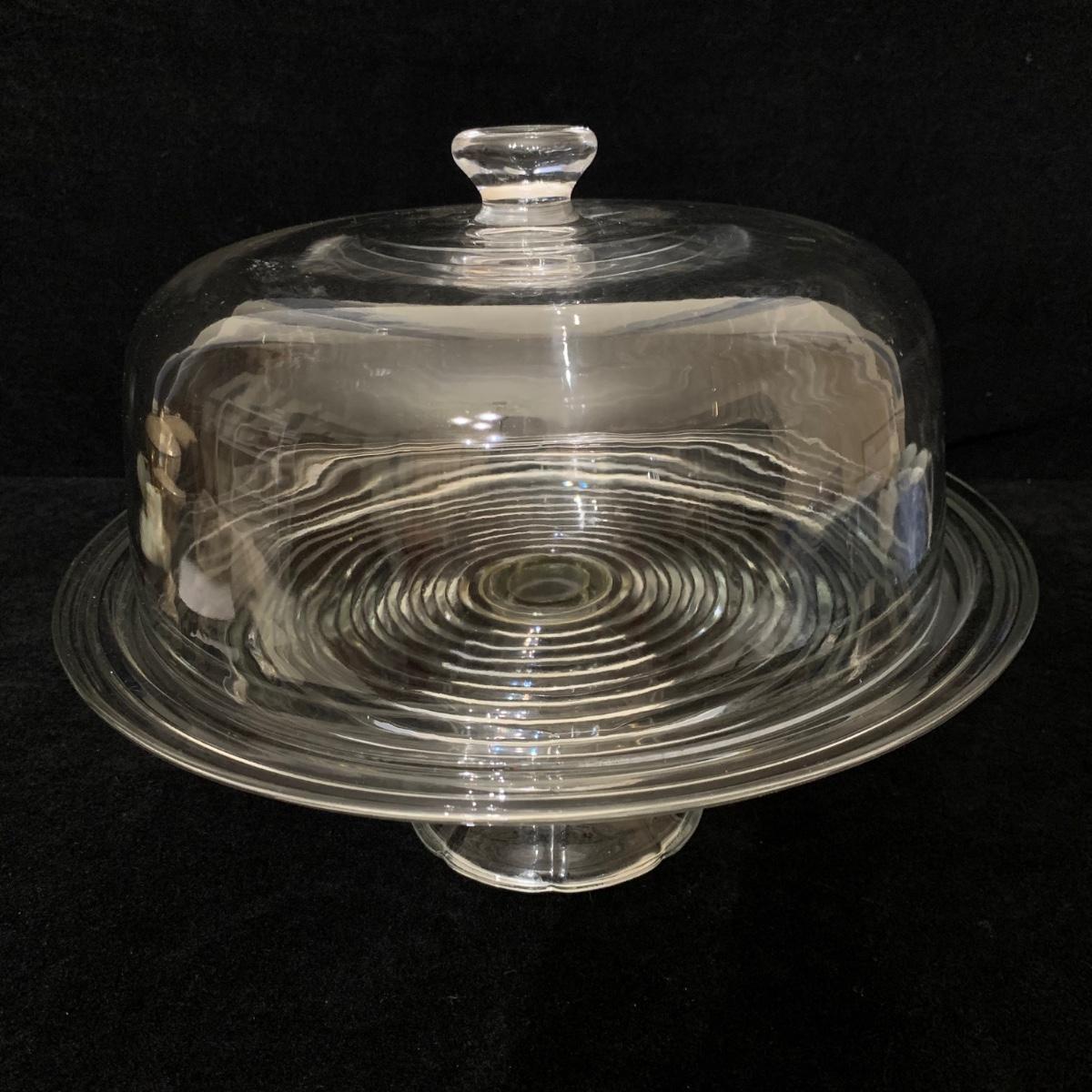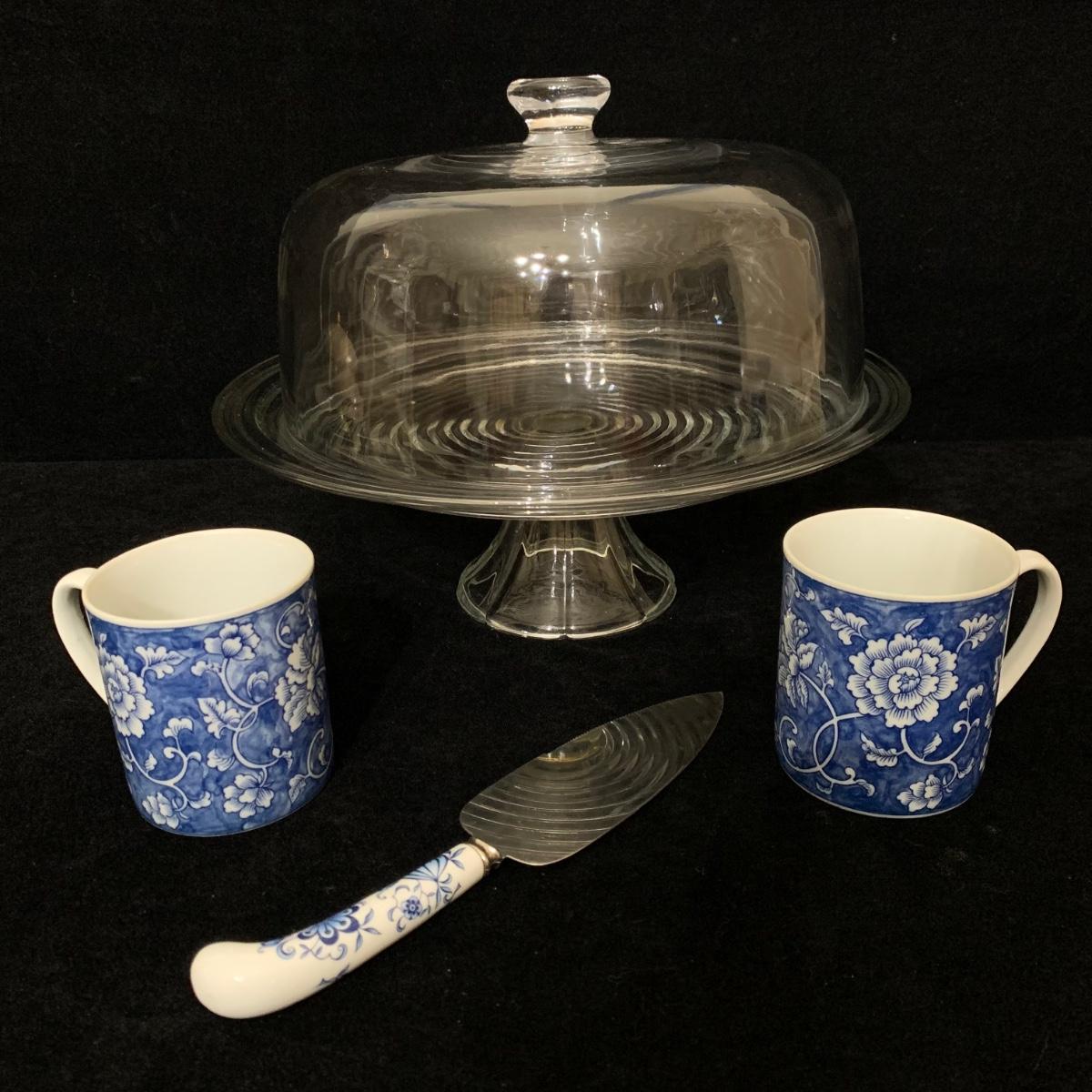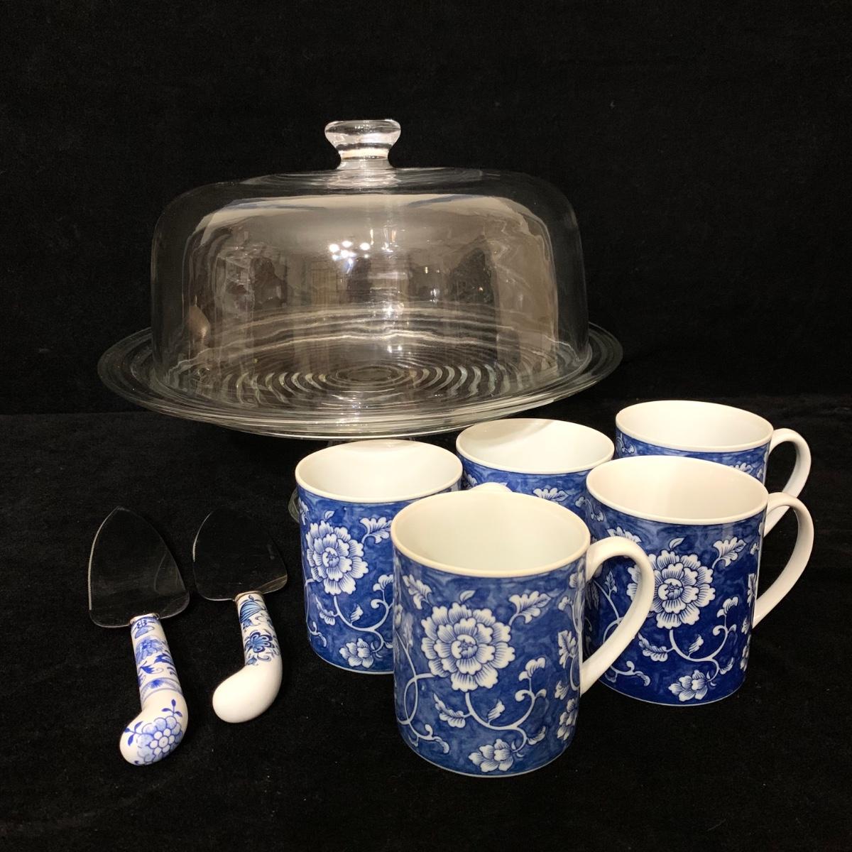 Glass pedestal cake stand with dome lid. Widest part of stand/platter measures 13”d. With lid on it is about 10” tall. Stand is in good condition and just needs to be cleaned. There is a slight yellow hue where the base attaches to the platter. Two cake servers are included that are stainless steel with blue and white floral glass handles. One is Sheffield brand and the other was made in Japan. Five unmarked blue and white floral mugs are included as well. One has a small chip.